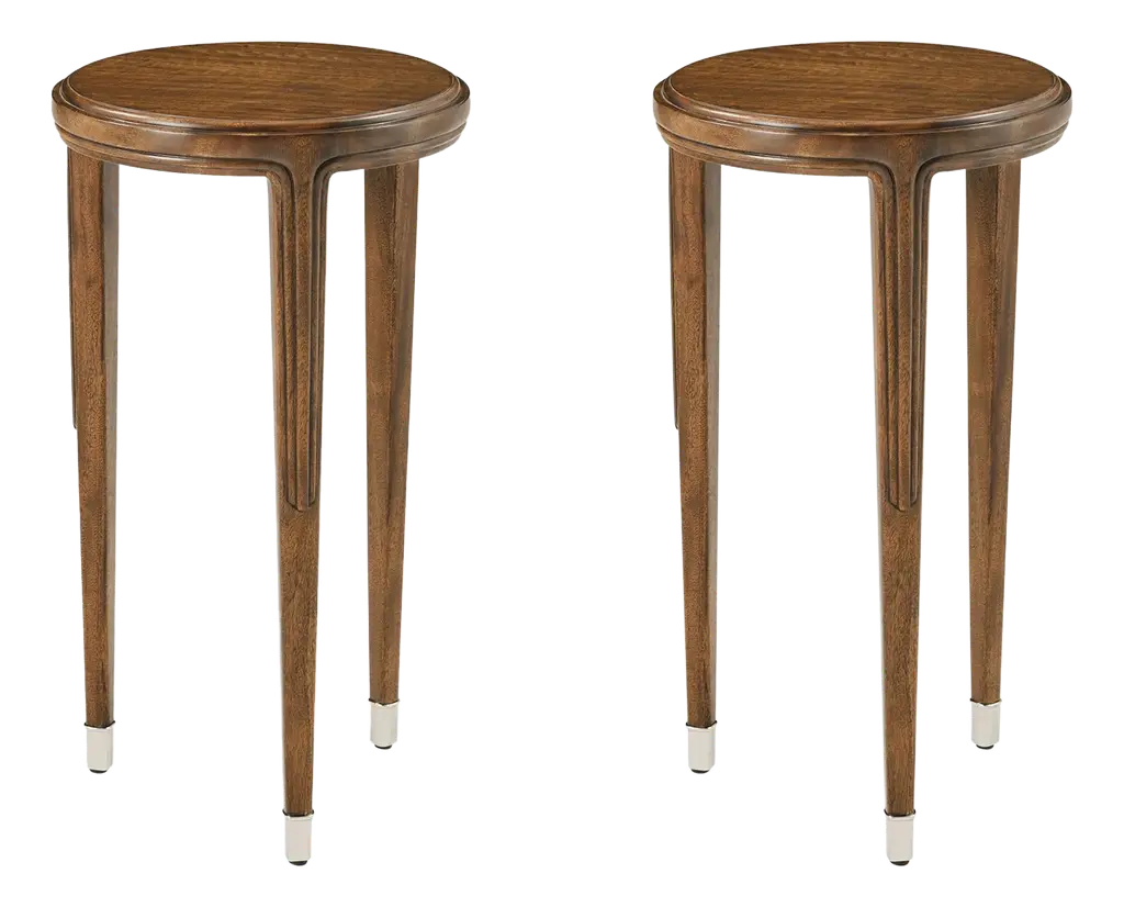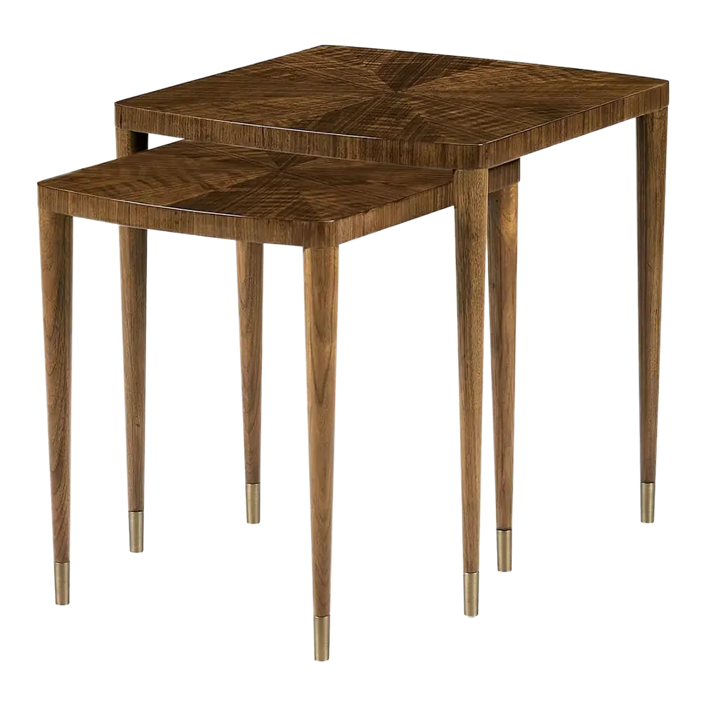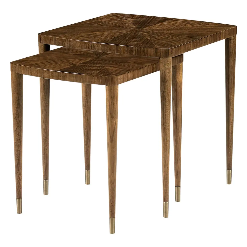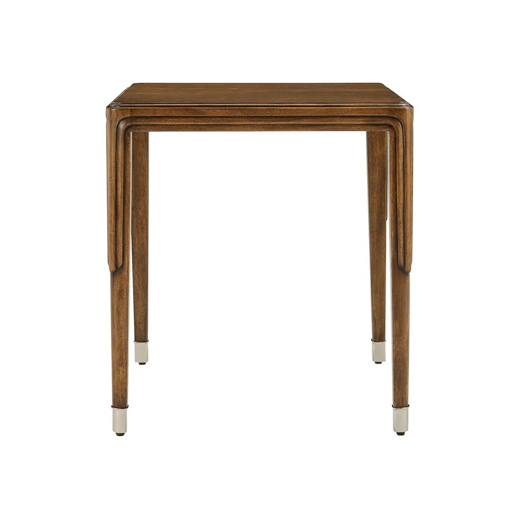 Crafted with figured walnut, it features a rich grain and tapered legs with subtle detailing. Nickel-capped feet add modern refinement, blending Art Deco charm with contemporary style.A perfect accent for traditional or modern interiors, this table enhances any space with its graceful design and fine craftsmanship.Dimensions: 22" W x 22" D x 24" H