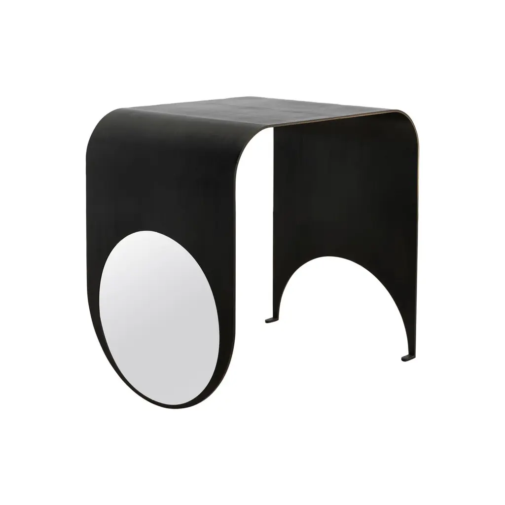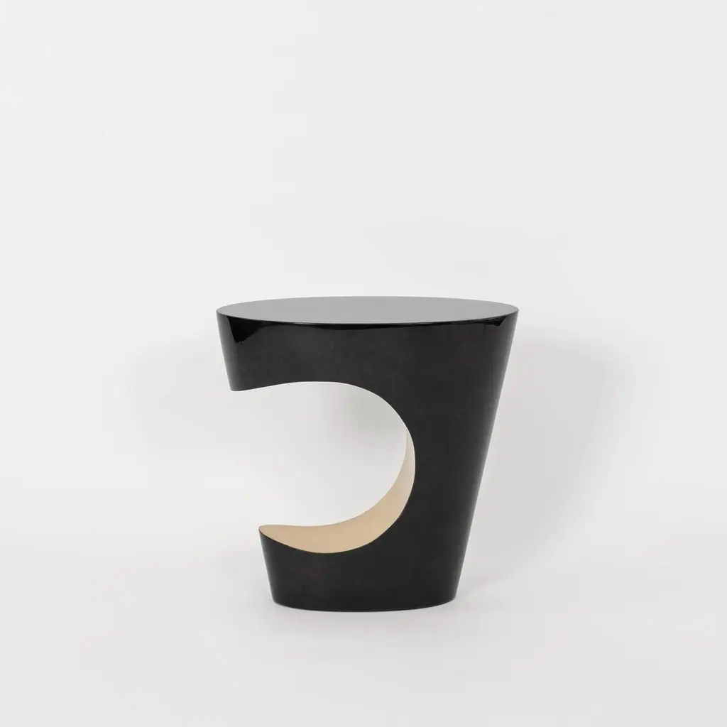 Luxurious organic shape side table mantled in lacquered goatskin. Modern yet soft in its lines, this stunning piece is made from the finest charcoal toned goatskin parchment highighted with brushed polished brass