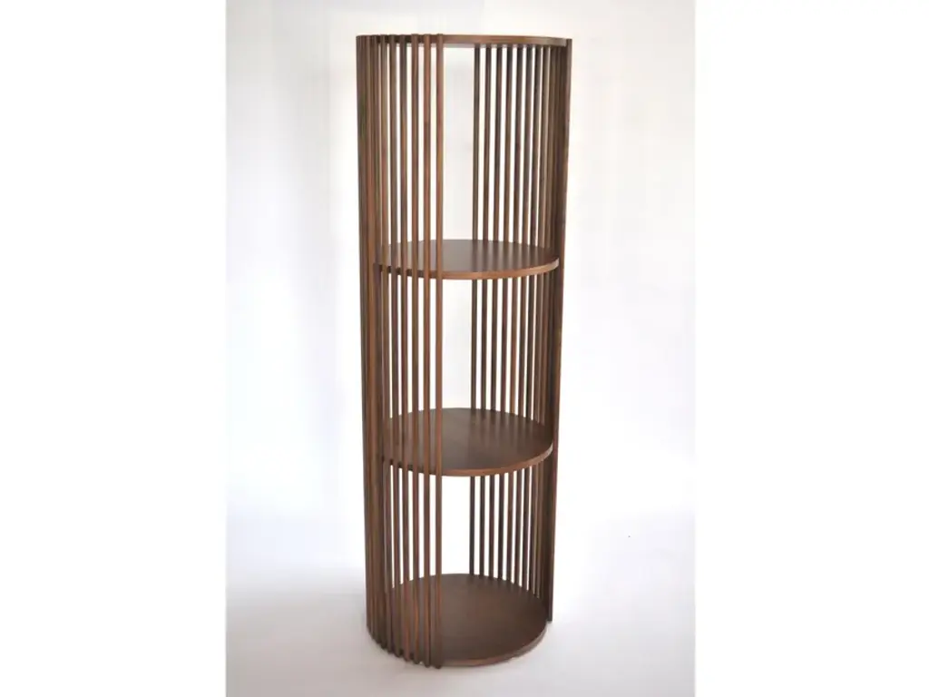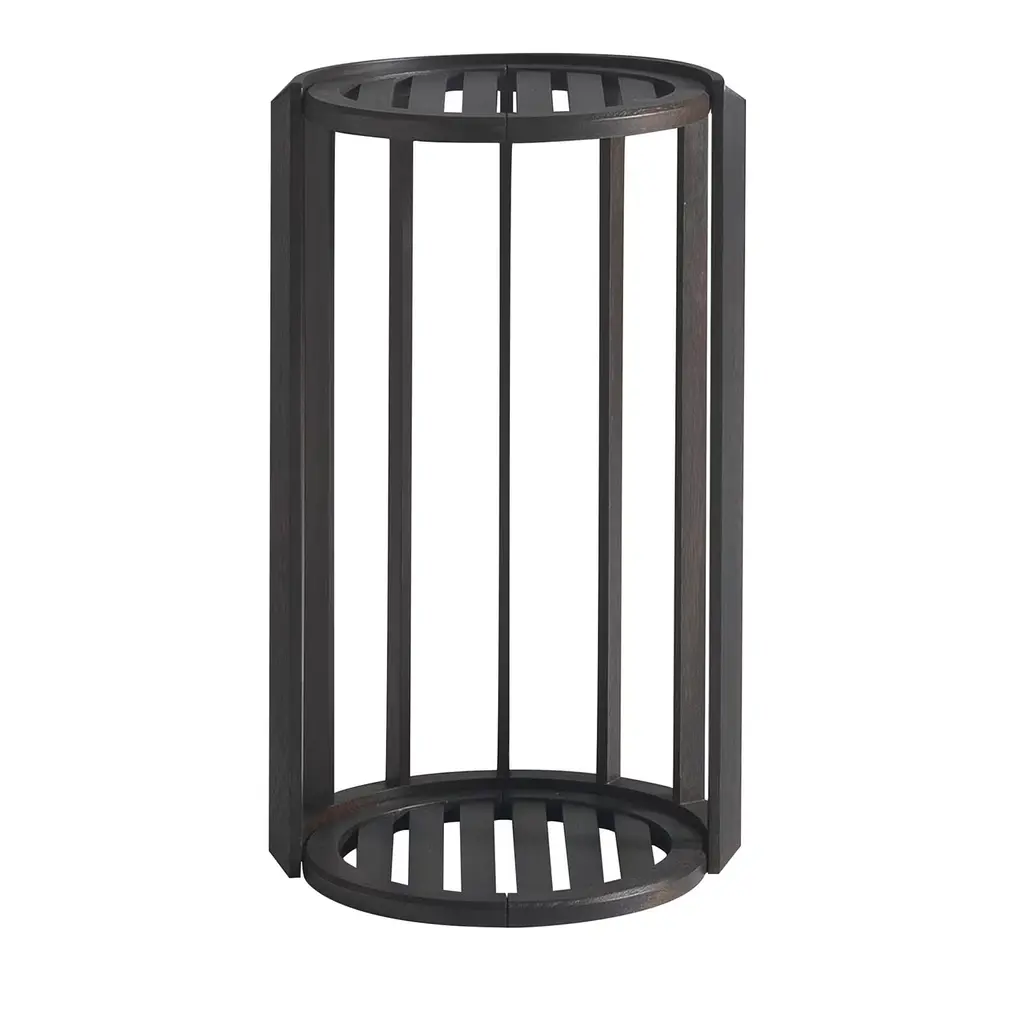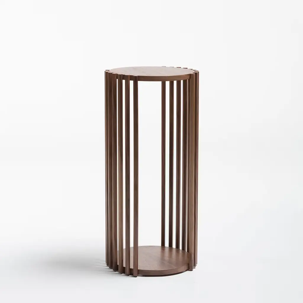 Natural complementary piece for the Palafitte Coffee Table, this side table will enhance any modern decor with its distinctive lightness and elegance. Arrangements of vertical slats in Canaletto walnut create a dynamic effect that almost veils their crucial structural function: the one of connecting the two circular wooden tops veneered in Canaletto walnut for a cohesive, warm look. Please ask the Concierge for other available materials and customization options.