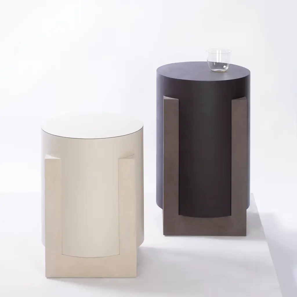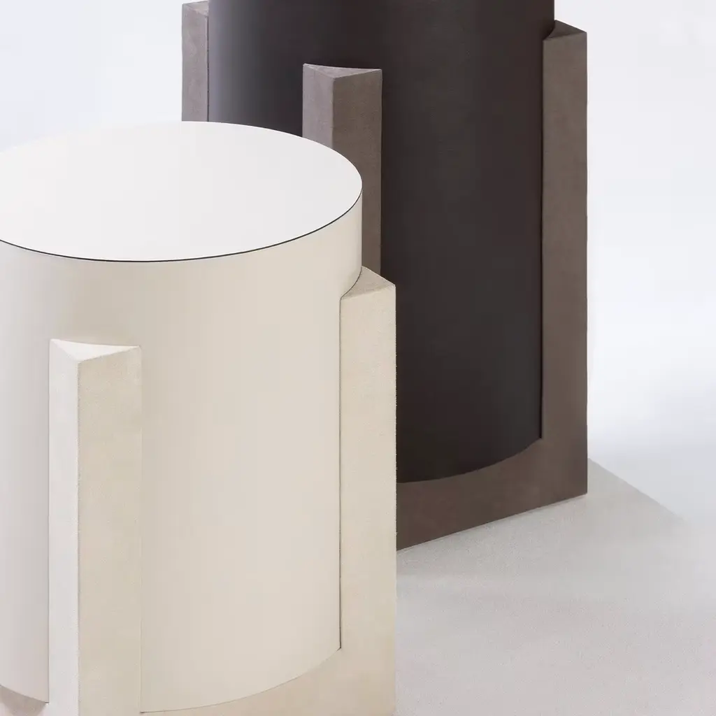 The Palazzo Collection pays homage to the architecture of Giuseppe Terragni’s Novocomun apartment complex in Como, built in 1928 and considered the first modern building in Italy. This side table is composed of a cylindrical body fully covered in black nappa (also printed calfskin and suede) encased in an open square base in beige suede forming an eye-catching composition.