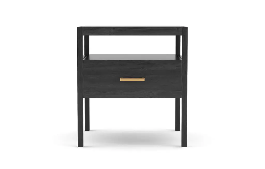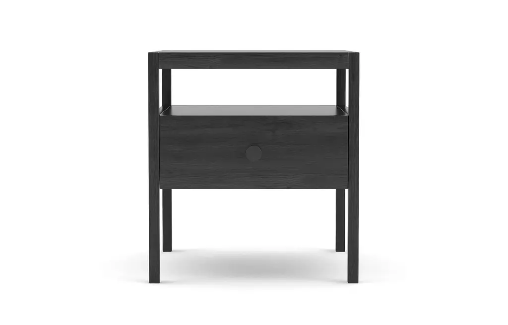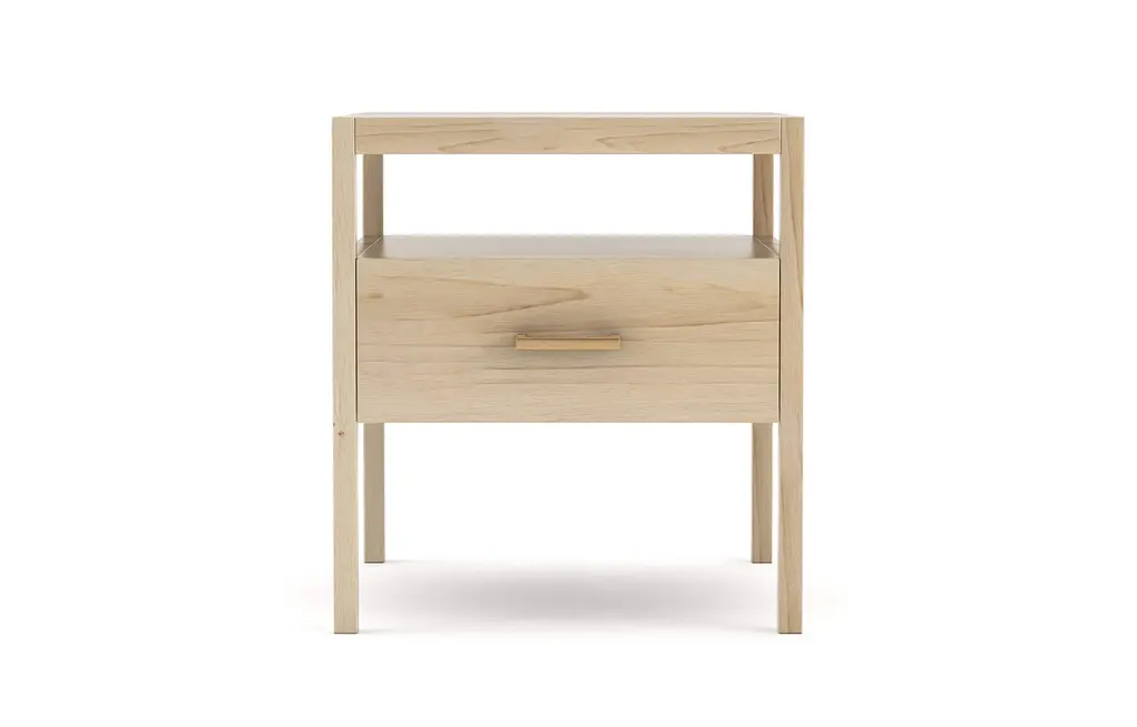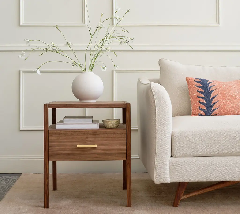 A handy living room companion with minimal lines and a compact frame. Minimize clutter with Palder's spacious, soft-close drawer, then style the top surfaces with a lamp or your next great read. Works beautifully in a pair or on its own.Tops, sides, and drawer faces crafted in your choice of beautiful, 100% solid hard White Maple or American Walnut. For additional strength and lightness, FSC-certified, low-VOC CARB 2 compliant Maple or Walnut hardwood plywood is used elsewhere. Learn more about our wood materials here.