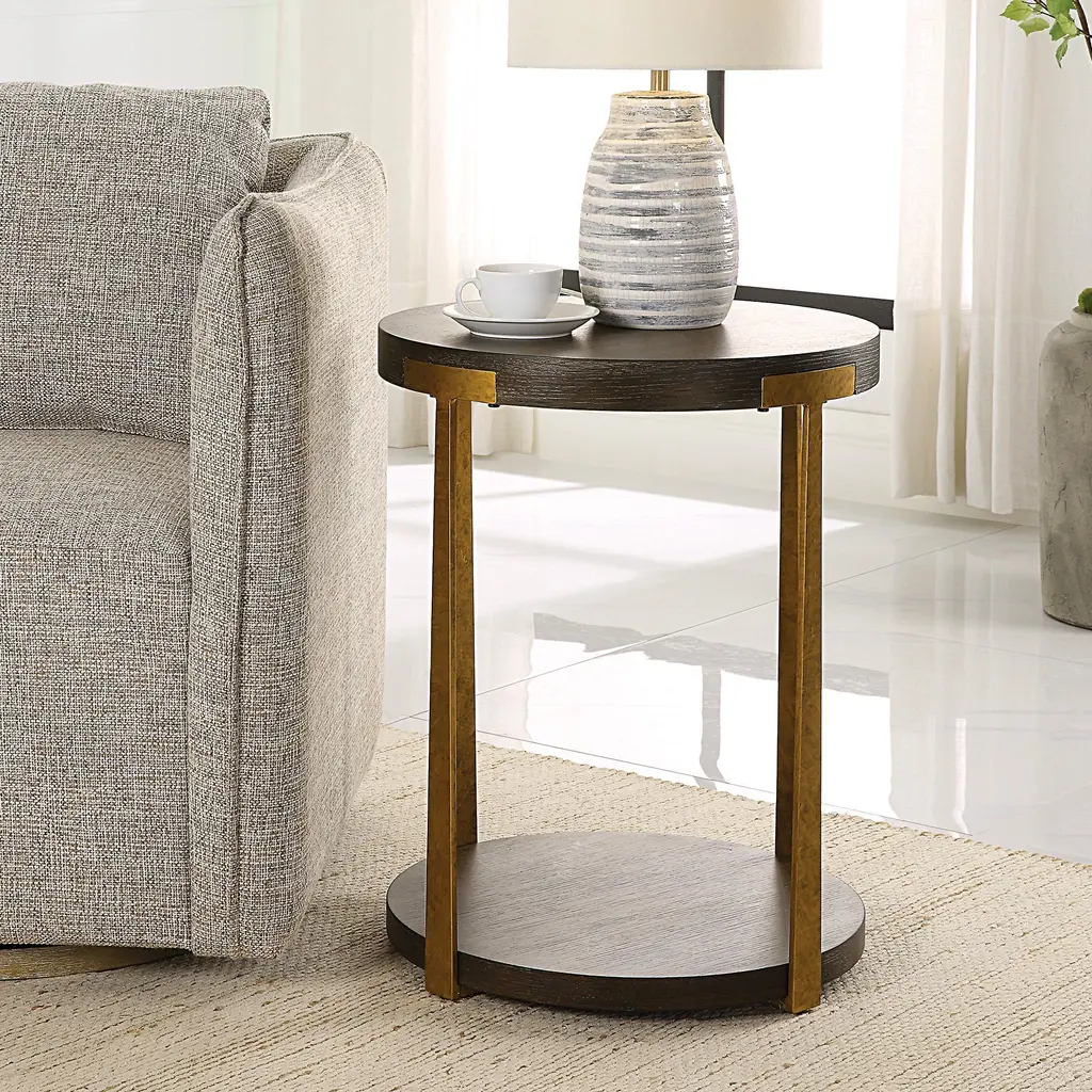 The Palisade Side Table Is Finished In A Rich Coffee Finished Oak Veneer With Natural Wood Grain Details Accented By Forged Metal Columns Finished In Mottled Antique Gold.