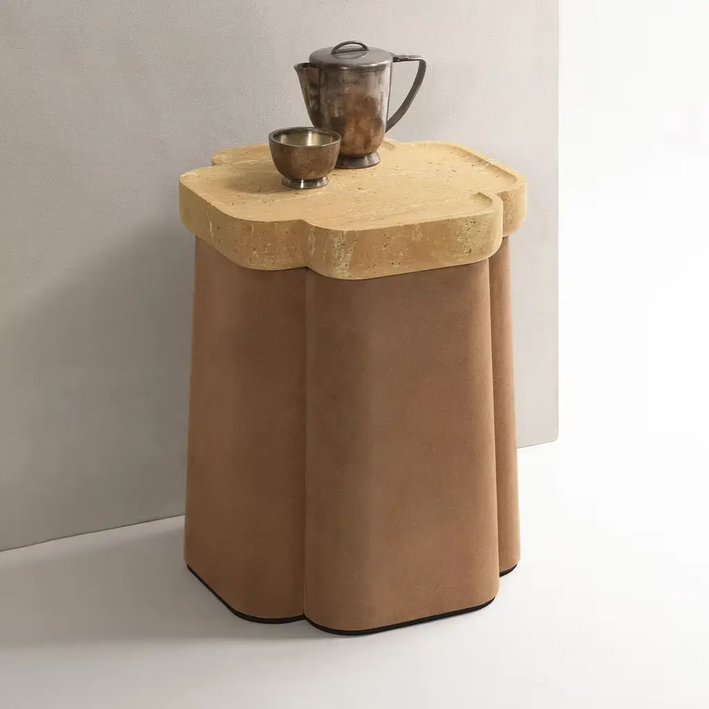 Palladio is a line of side tables that plays with shapes and materials. Minimal bases clad in the finest Italian leather on which essential, clean forms made of travertine (available in a selection of five nuances) with exquisite details lay: with the aim of bringing together the beauty of Classic Art and a Modern, graphic charm, this combination enhances the diversity of textures and colors, resulting in iconic pieces with a magnetic appeal. Custom size available on request.