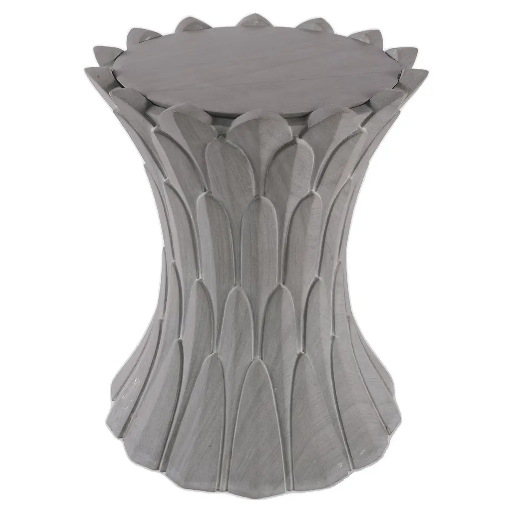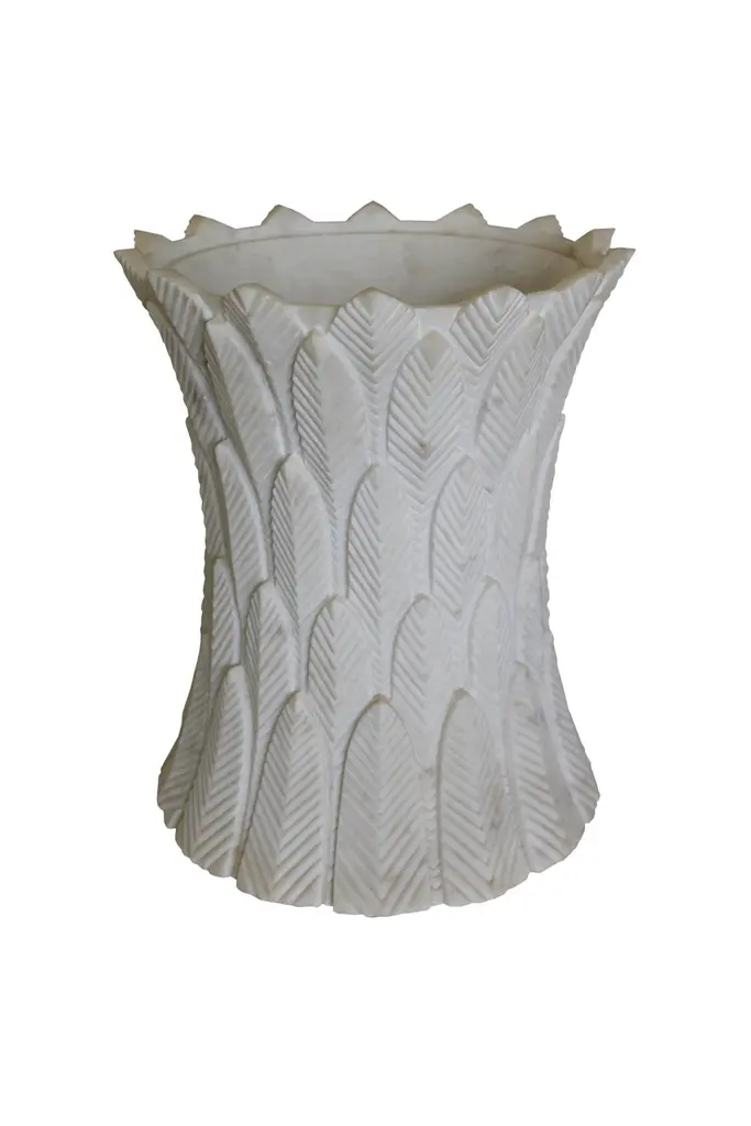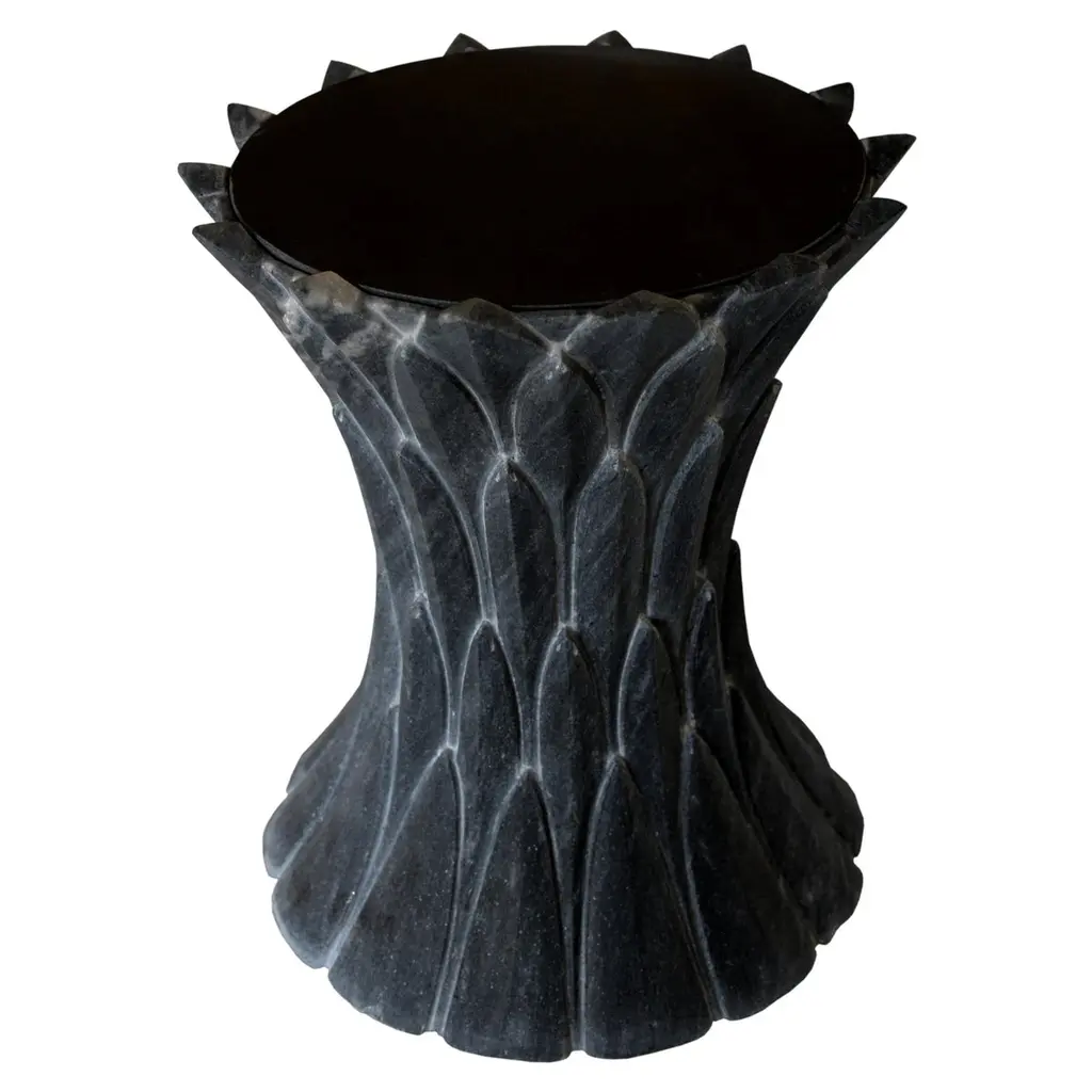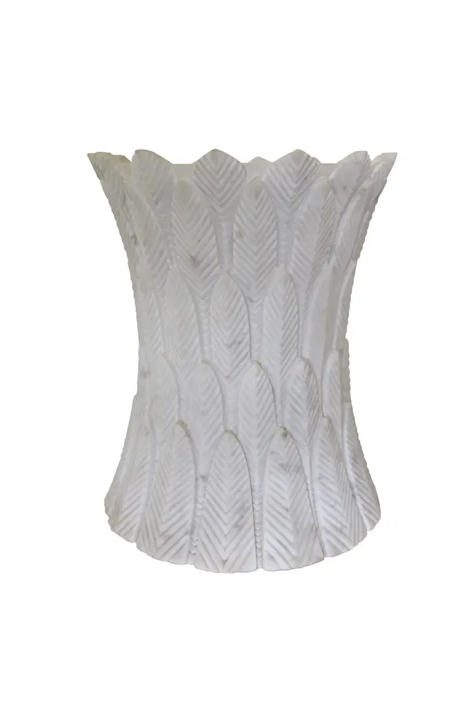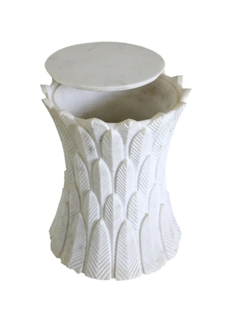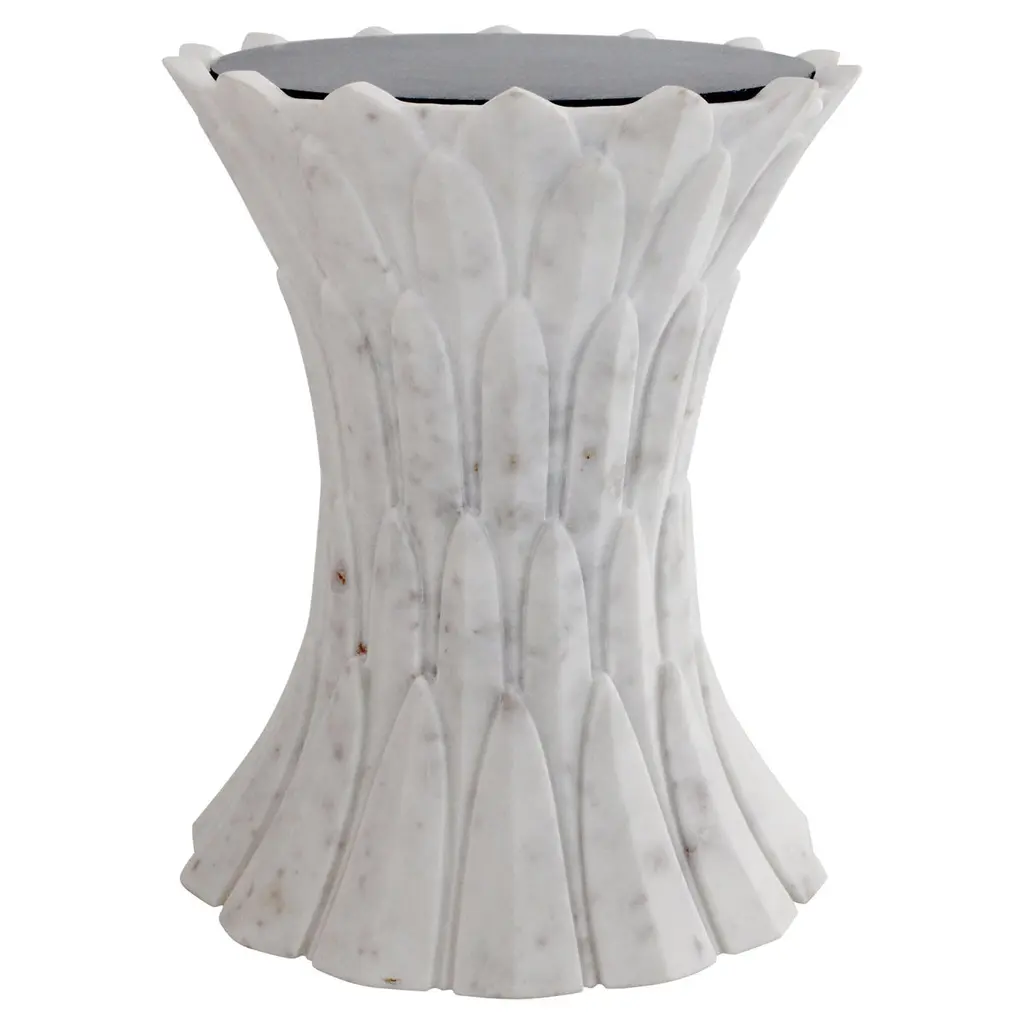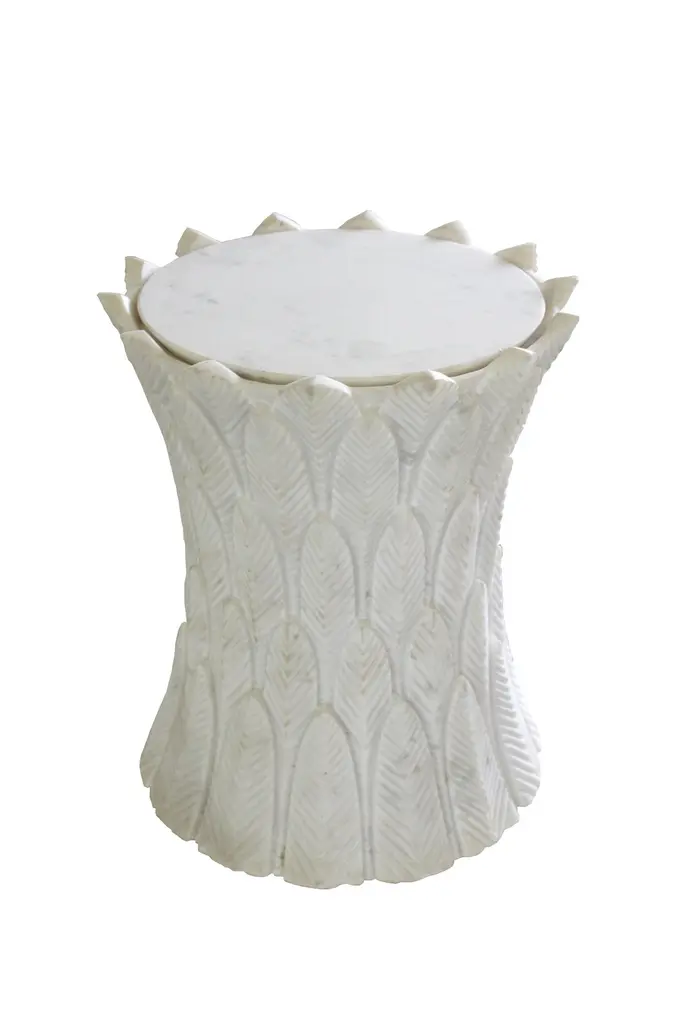 Inspired by the temple carvings in and around Udaipur, Stephanie Odegard designed this unique side table using locally available stones. The arrangement of the carved leaf motif is toned down to give a much lighter feel and appearance. Palm leaves Marble Table in Agra White MarbleSize- 14" x 14" x 17" H.Materials - White Marble, Hand Carved, Semi matt finished.Buyer Cancellation-The cancellation charge is 25% which increases to 50% if the production is started.Prices do not include shipping from India (for custom orders) or our MN warehouse (items from stock). That will be additional.