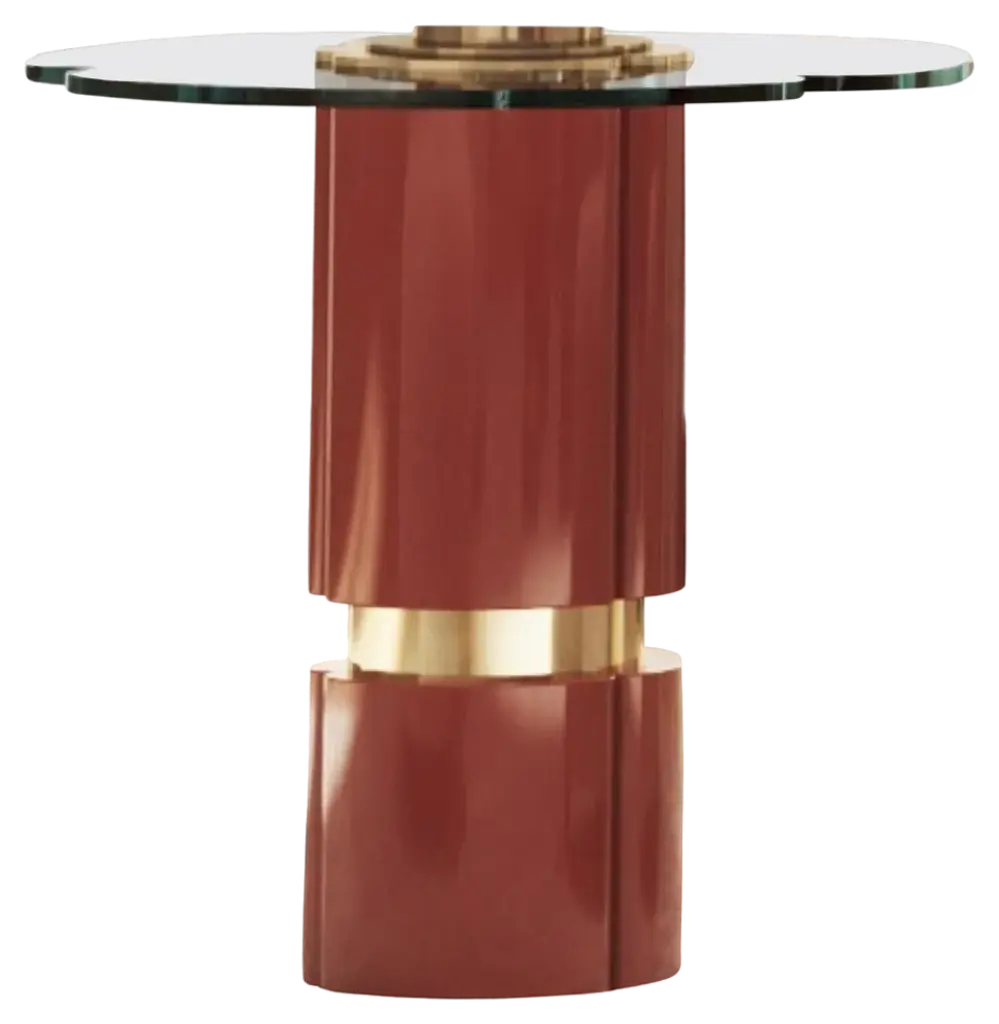 This eclectic design exudes a mesmerizing character that will make an iconic addition to a contemporary interior. Handmade of ceramic, the stem is comprised of four cone-shaped elements combining red and orange hues. The round base is in brass, while the round top is made of lacquered glass.