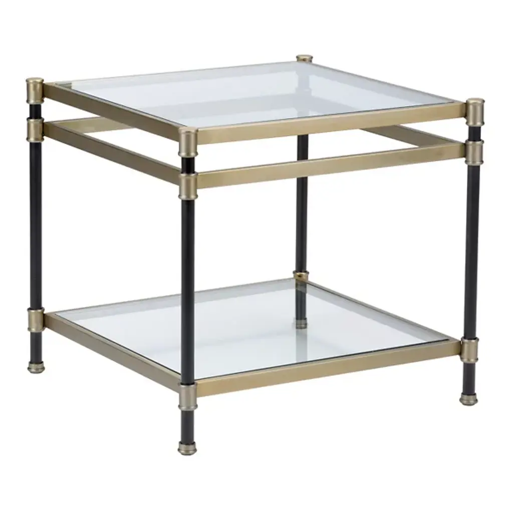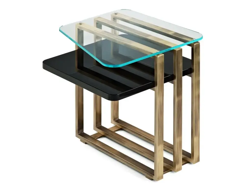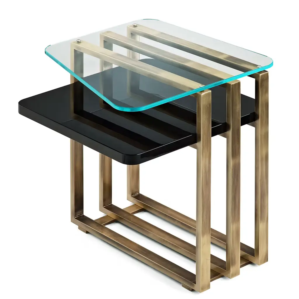 This elegant side table will add a refined contemporary flare next to a couch or between armchairs in a modern home. Designed for Marioni by Piero Angelo Orecchioni and presented at the 2019 edition of Milan's Salone del Mobile, the structure comprises two tops layered with a black-lacquered wooden shelf below and an extra-clear glass above. The support consists of three brushed brass bars that give the piece a sculptural allure. The combination of materials can be varied upon request, please ask the Concierge for details.