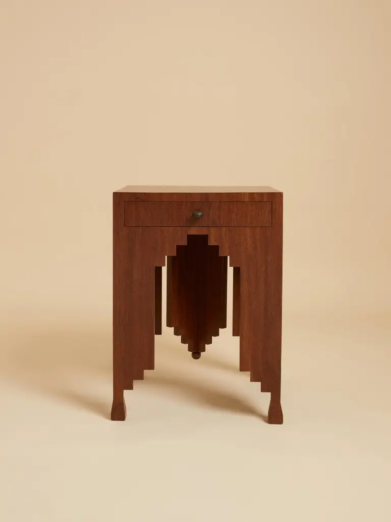 Palmyre Side Table by EBURDimensions: W 47 x D 47 x H 63 cm.Materials: Sucupira, bronze.Weight: 14 Kg. The Palmyre side table in sucupira, with its jagged forms, is inspired by Middle Eastern art and crafts- manship. The drawer is adorned with a bronze pull knob.EBUR is a multidisciplinary studio specializing in furniture and space design.
