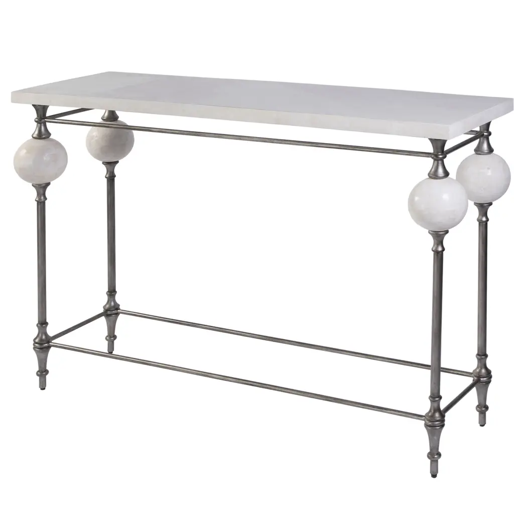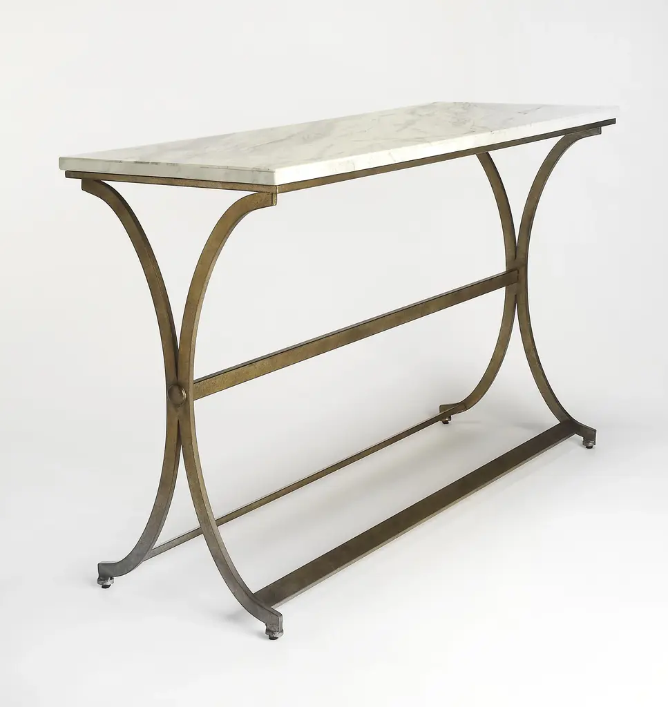 Featuring a polished marble top and antiqued gold toned base This console table brings an airy open style to any space. Try topping it with a vase of blooms for a charming entryway focal point or behind the sofa paired with a lamp for evening reading. Durably Constructed With: Marble, Kala, Metal Product Construction Features: Finish Distressing Product Assembled Measurement & Weight: 30.0" H x 48.0" W x 18.0" D -- 77.0 lbs. 200 lbs. Suggested weight capacity Item Arrives: Needs Assembly Marble is a natural stone product and is known for its variation in color, carbon deposits and veining patterns. Variations in shade and markings are normal and can be expected with the natural materials used in the construction of this product. Due to the porous nature of marble, it is vulnerable to staining agents and high heat. Avoid placing hot or wet items on surface. Coasters recommended Photo may slightly differ from actual item in terms of color/finish due to the lighting during photo shoot or the monitor's display.