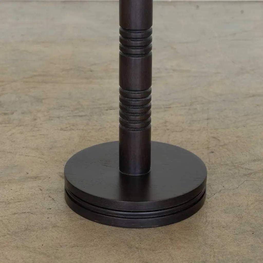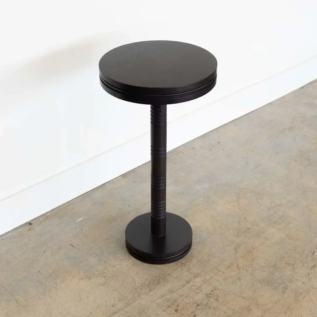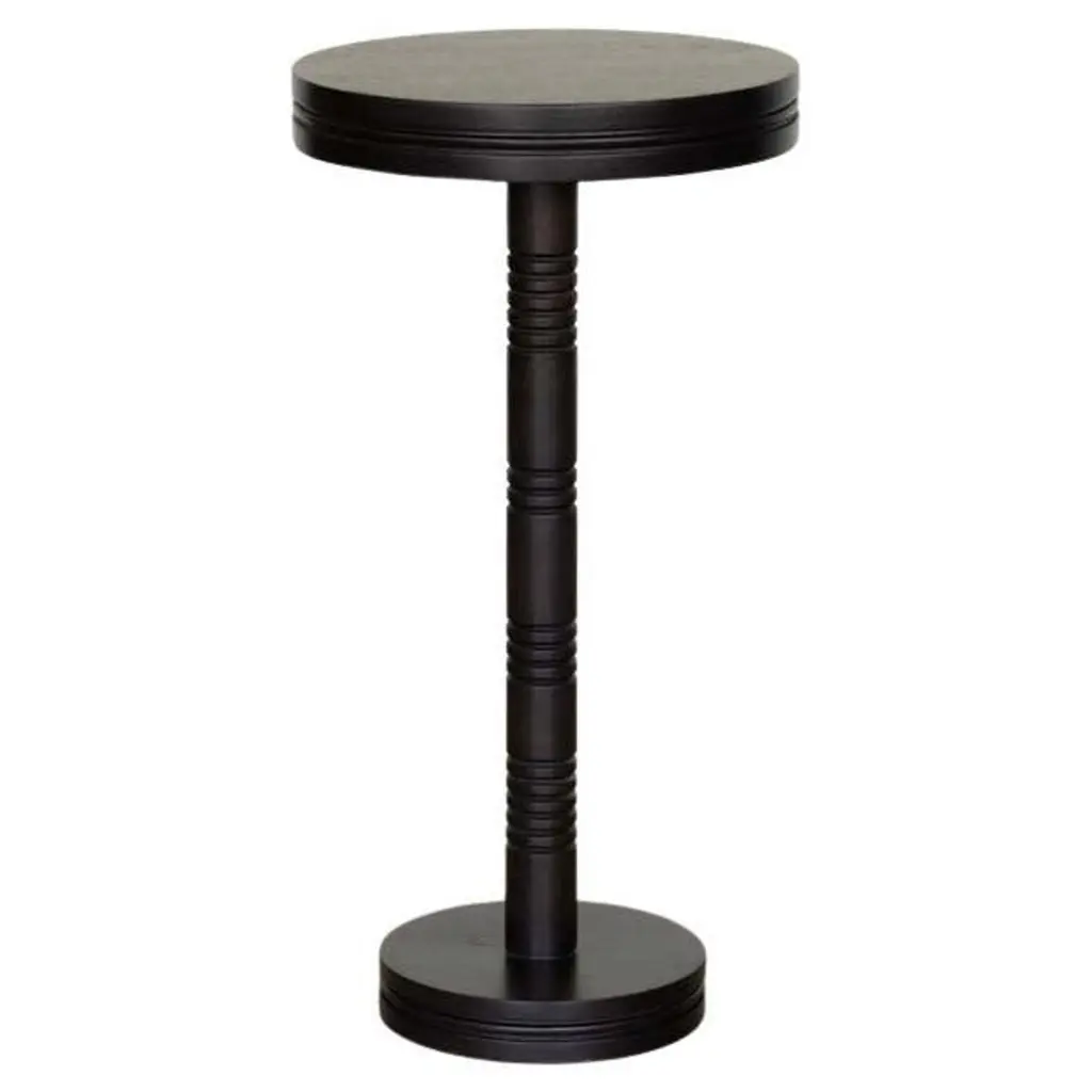 Solid oak circular drink table with carved ribbed detailing in an ebony stain; inspired by French design.