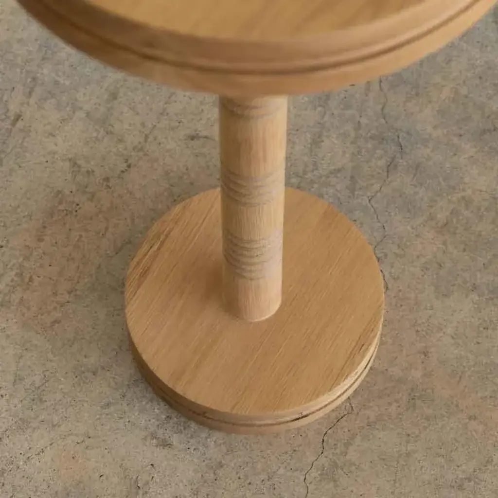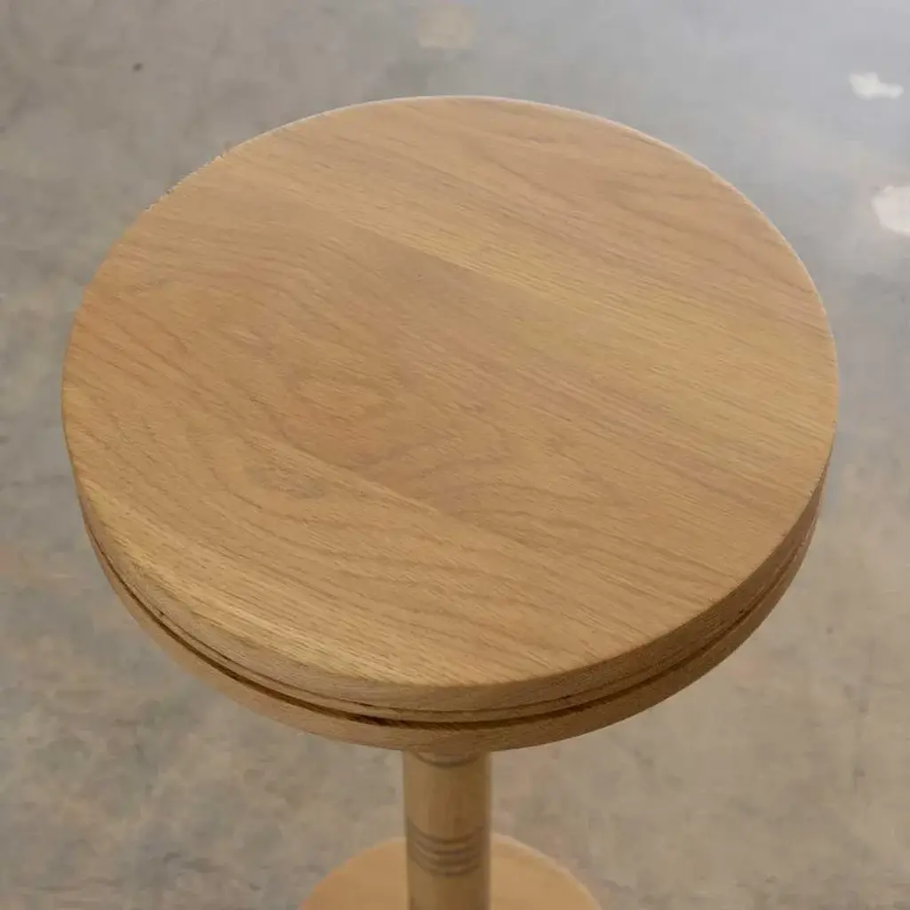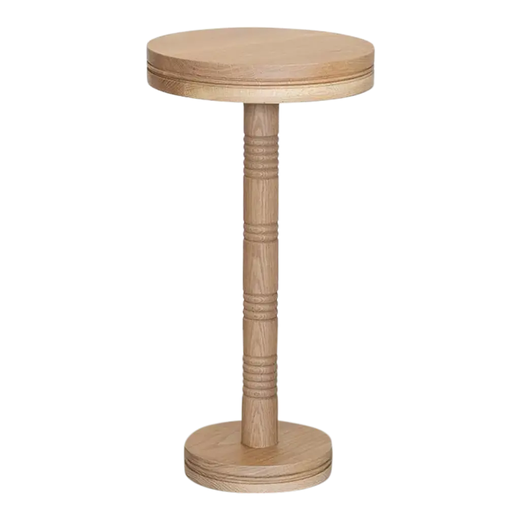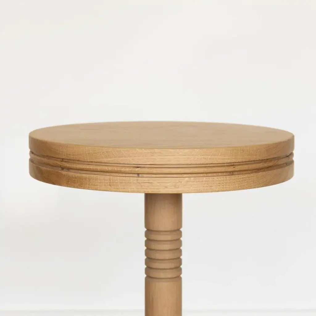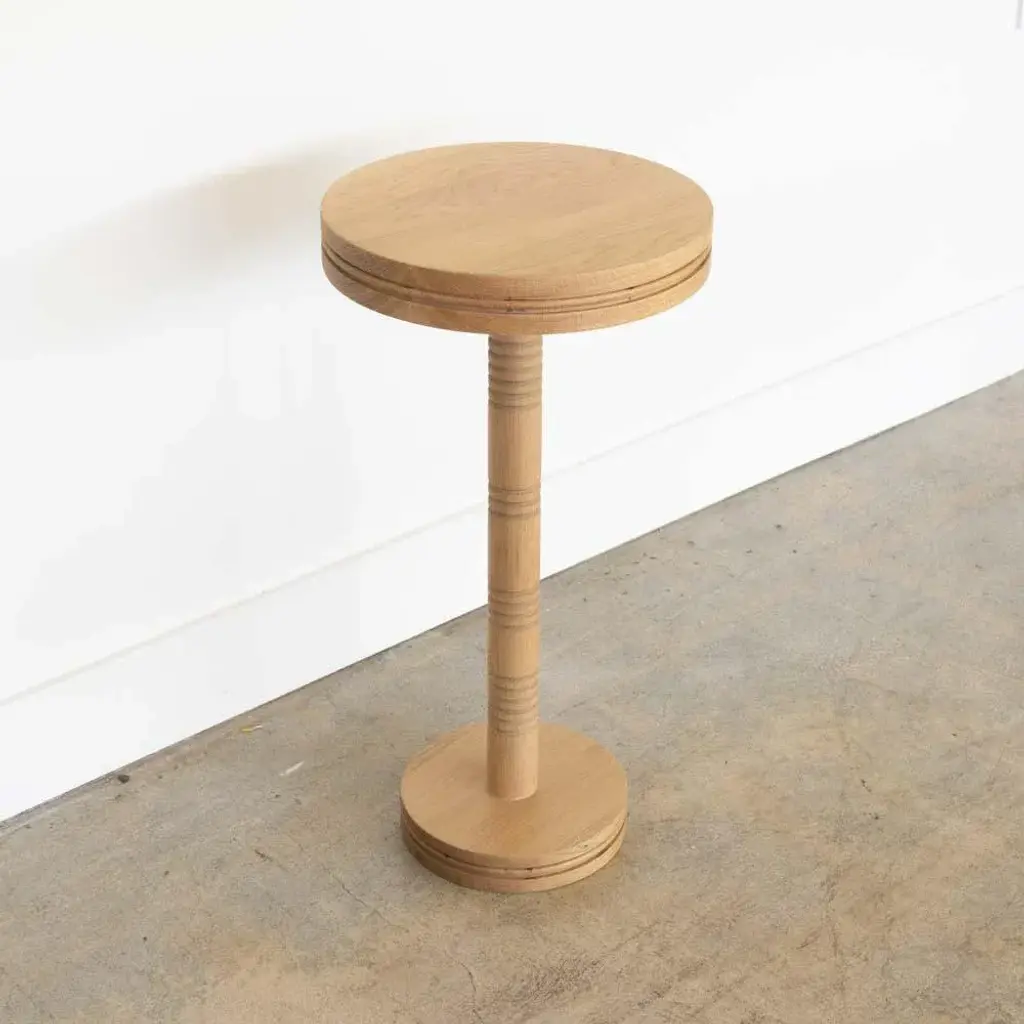 Solid white oak circular drink table with carved ribbed detailing; inspired by French design. Measures 23.25" H x 12" D. Made in Los Angeles.