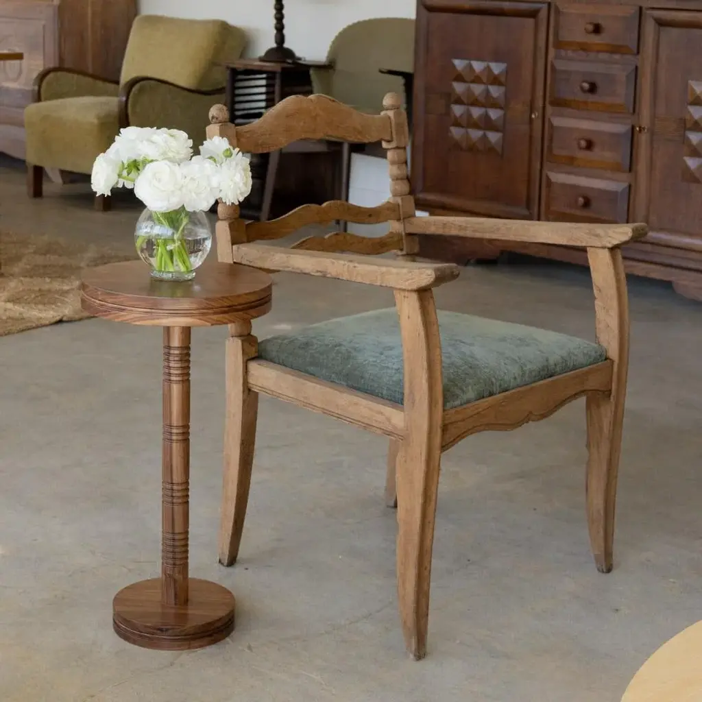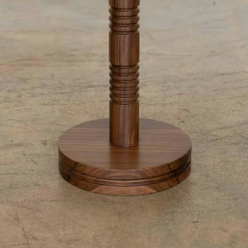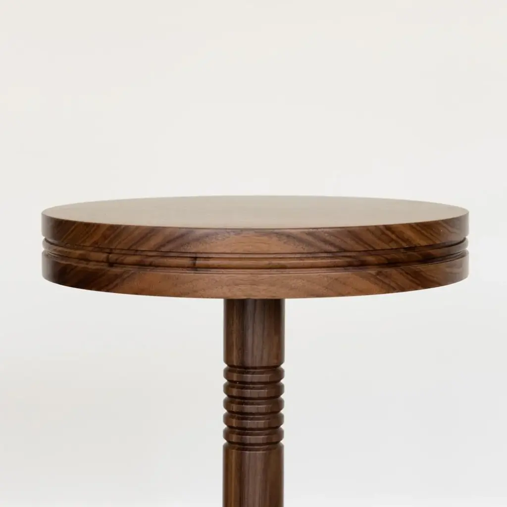 Solid walnut circular drink table with carved ribbed detailing, inspired by French design. Measures 23.25" H x 12" D. Made in Los Angeles.