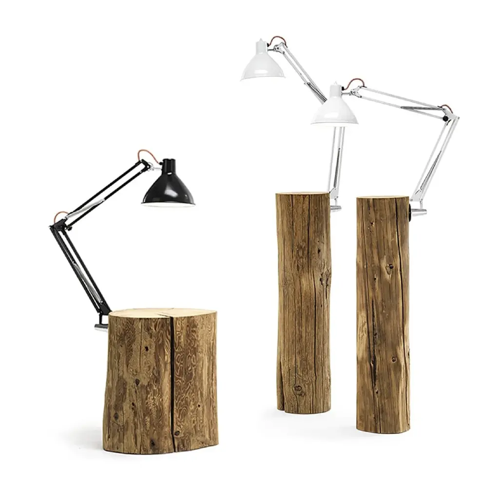Introducing the Piantama side table and lamp from Mogg. This unique piece features a solid wood top and a pantograph lamp, available in elegant black or white. The perfect combination of nature and industrial design. Elevate your space with this luxurious and functional statement piece.