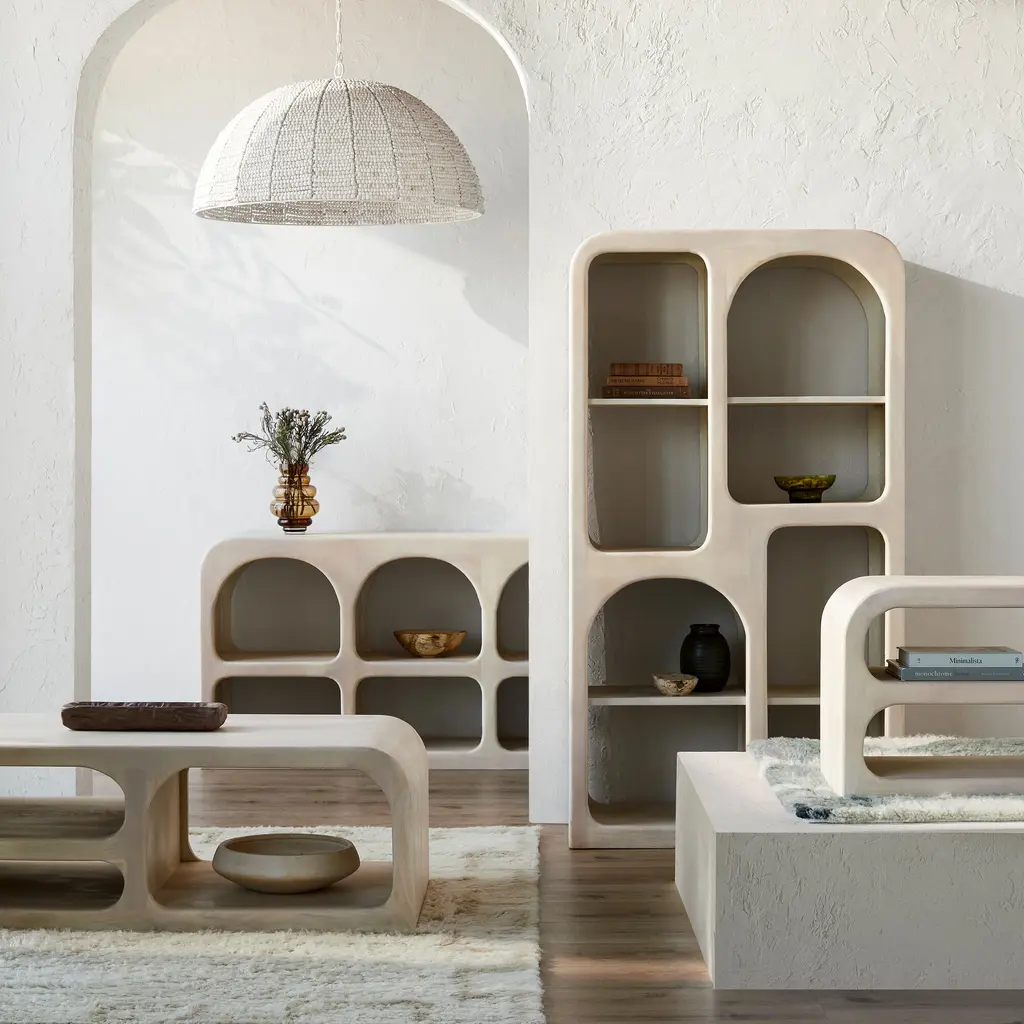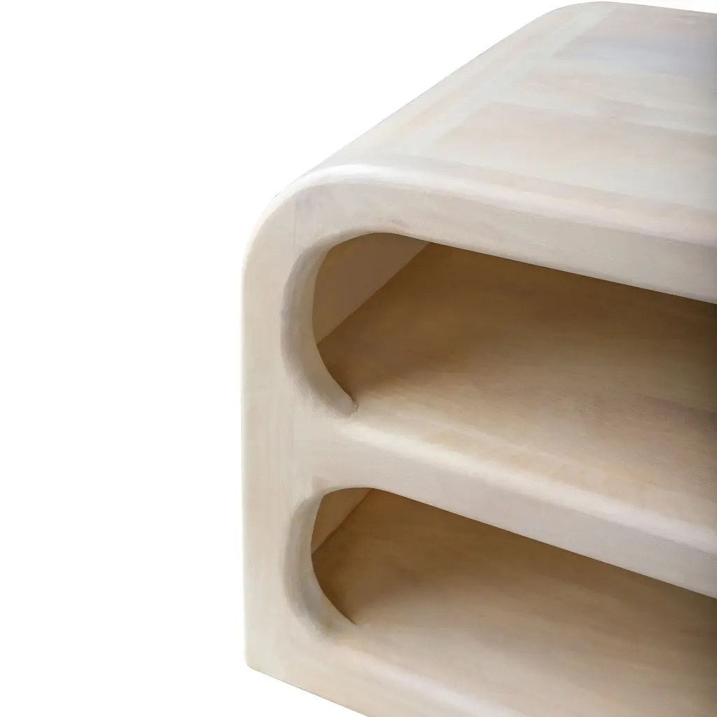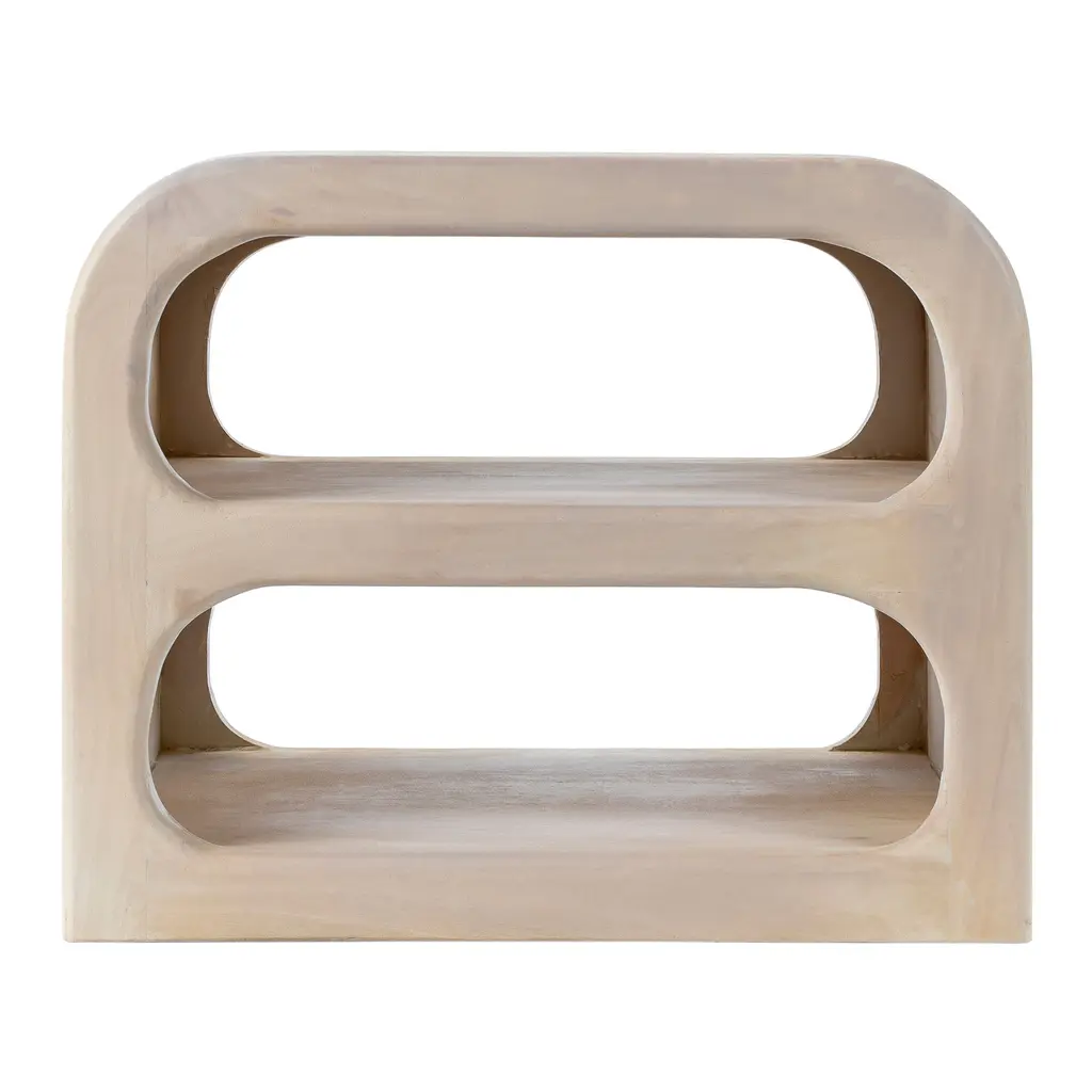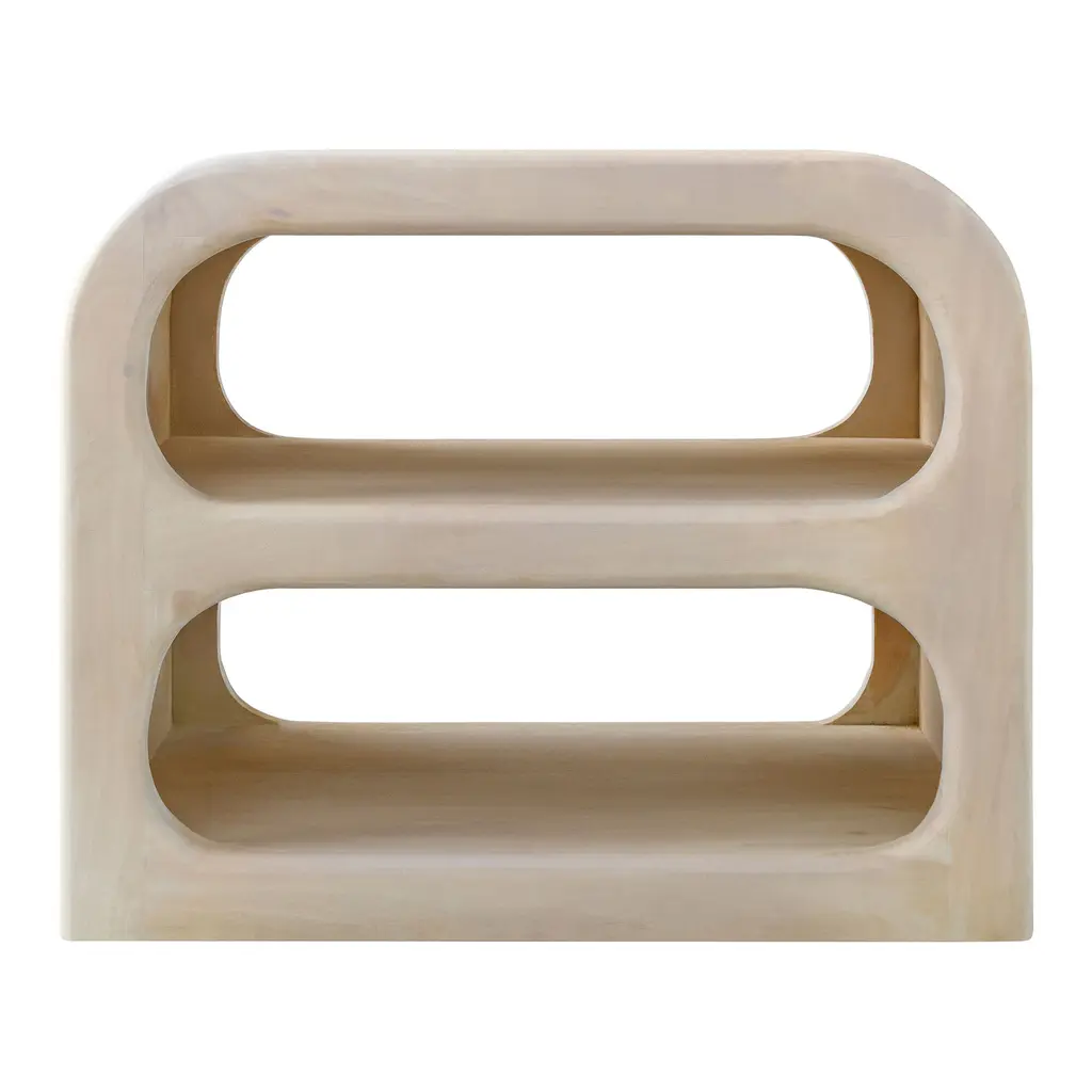 Masterfully crafted of ivory mango wood, the enchanting Panyer end table integrates two oval shelf compartments into its arched silhouette. An artful storage table for living rooms of all sizes, it saves space beside the sofa with its open shelving and spacious top. A bright and neutral highlight for any decor with an alluring boho-chic aesthetic, its durable craftsmanship is made to last.