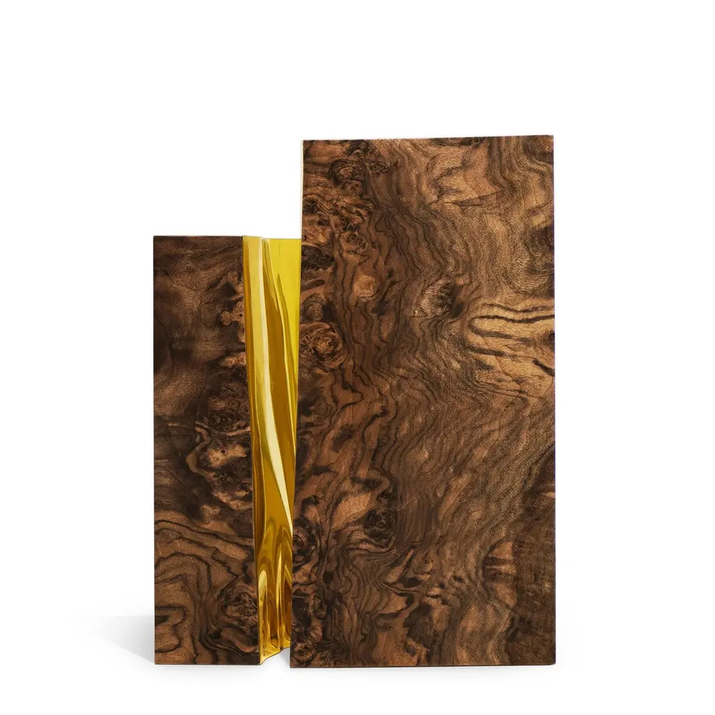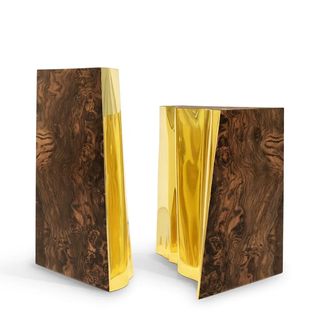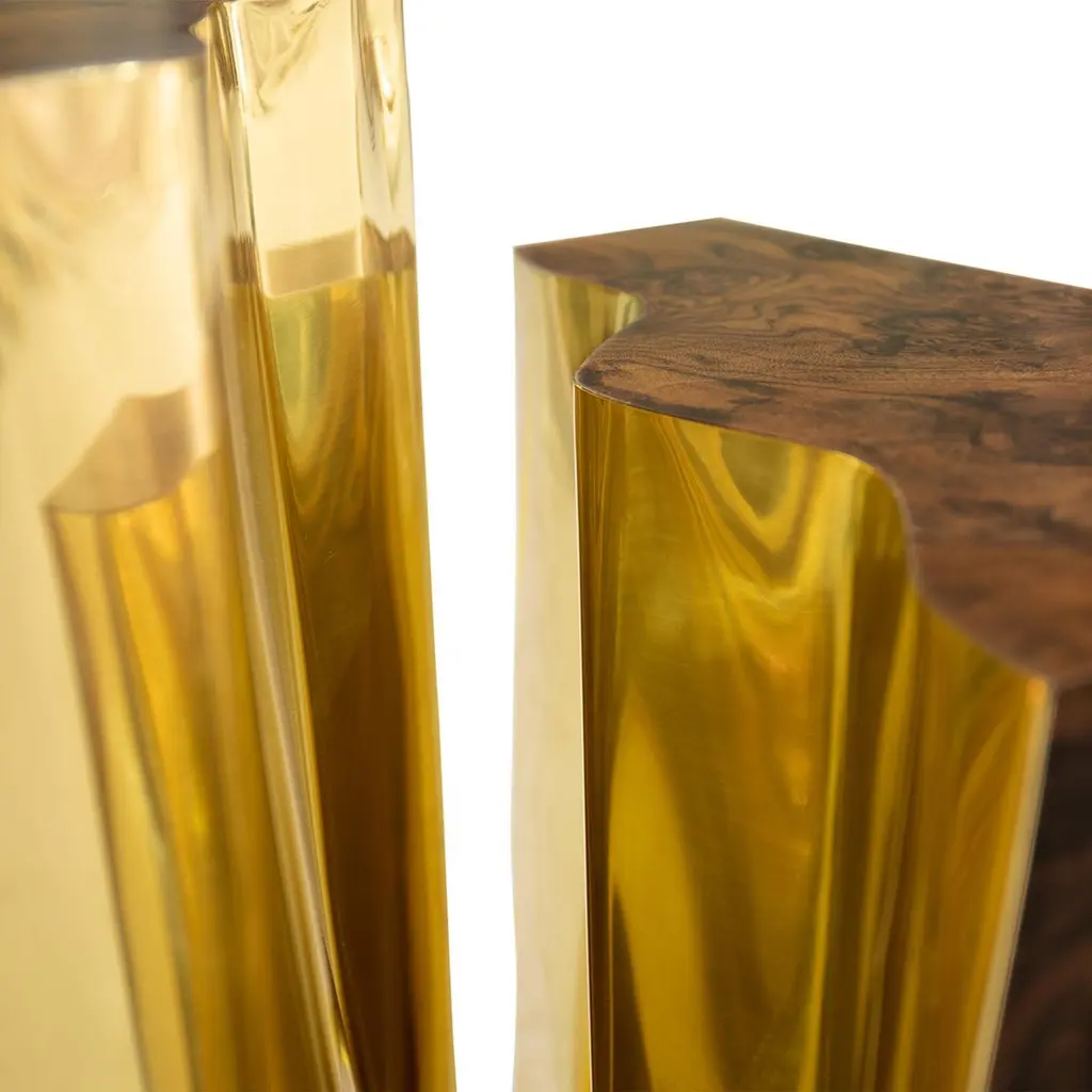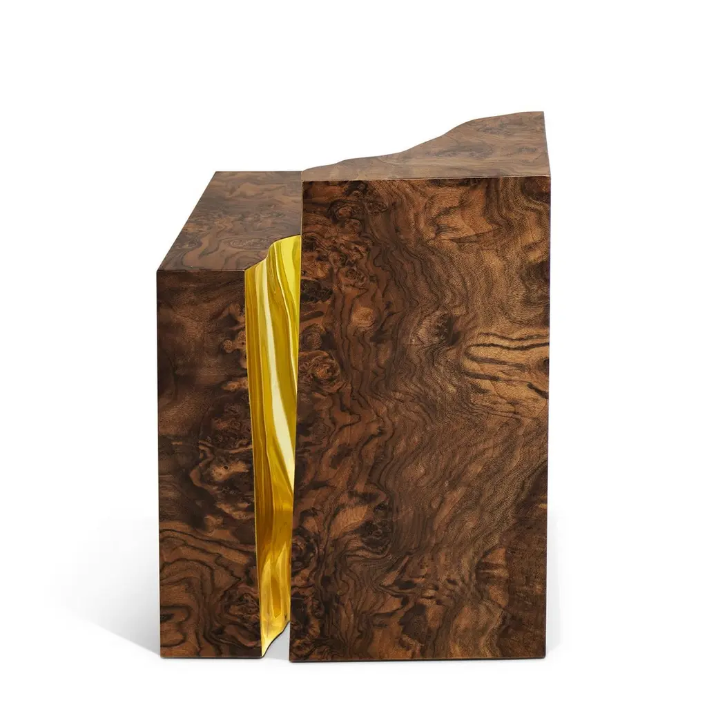 Side Table Paradise Walnut features a Walnut root veneer structure with its inside finished in polished brass, outsides finished in veered and varnished solid walnut wood.