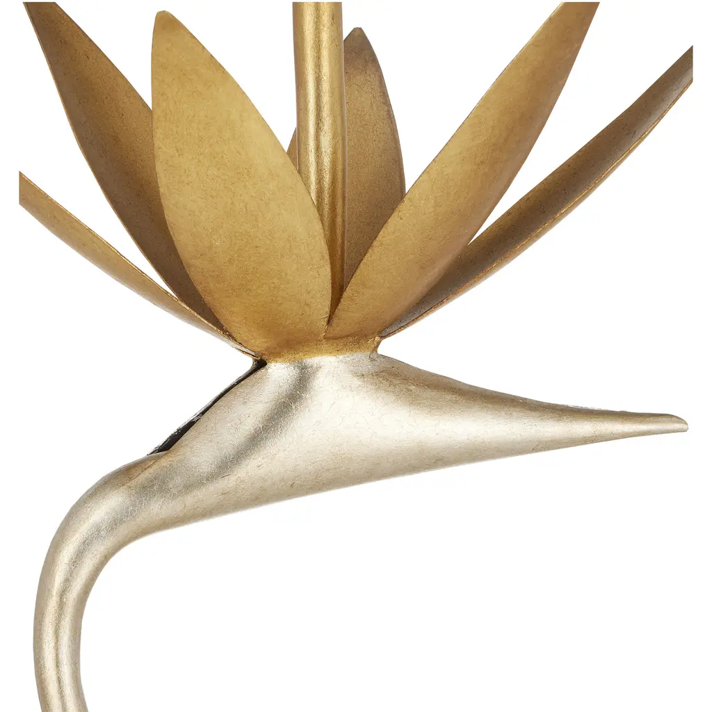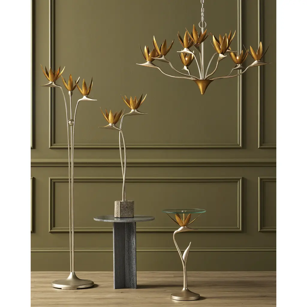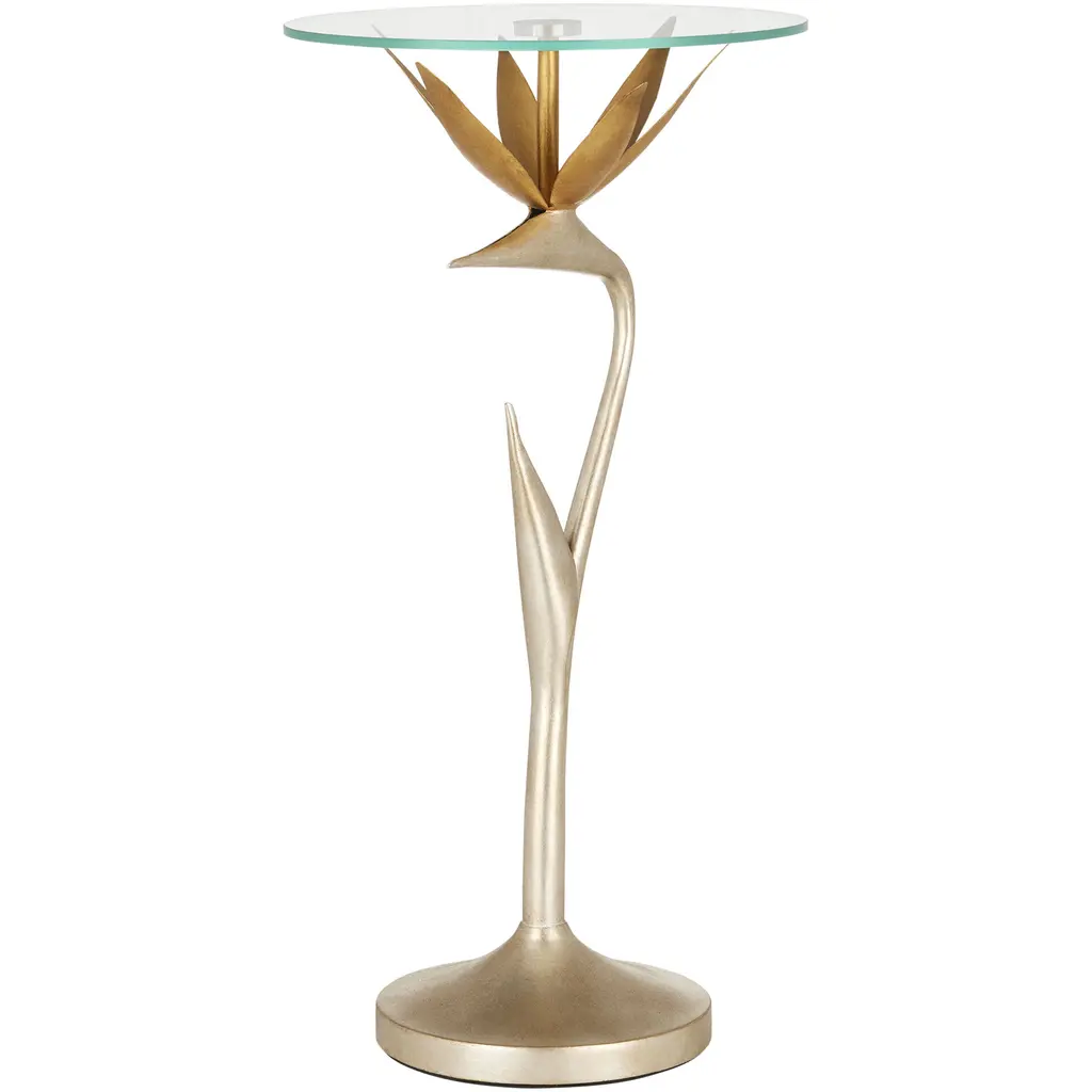 With a body made of steel, the Paradiso Accent Table has a lyrical shape inspired by the Strelitzia reginae, more commonly known as the Bird of Paradise plant. The limb that arcs up, in a contemporary silver leaf finish, holds a blossom in a contemporary gold leaf finish. The two work in concert to balance the glass top. This silver and gold occasional table is an example of how nature-inspired design elements are driving the biophilic movement.