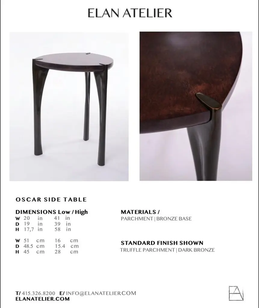 Made to order Low Oscar Side Table with parchment top and cast bronze legs by Elan AtelierThe Oscar Side Tables, tall and low, are an elegant statement inspired by early to mid-century French furniture. The tapered bronze legs are in dark bronze and the top is in our rich brown truffle parchment. Custom finishes are available.This entry is for a LOW Oscar Side Table. Dimensions:w 20 x d 19 x h 17.7 inw 51 x d 48.5 x h 45 cmIt can also be ordered as a TALL Oscar Side Table. Dimensions:w 16 x d 15.4 x h 22.8 inw 41 x d 39 x h 58 cm This piece is cast in bronze at our workshop in Asia. The shipping cot is additional. Please provide the exact address so we can respond with the shipping cost.Production time: 8-10 weeks International ocean freight: 8-12 weeks