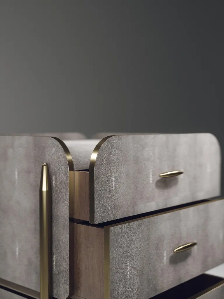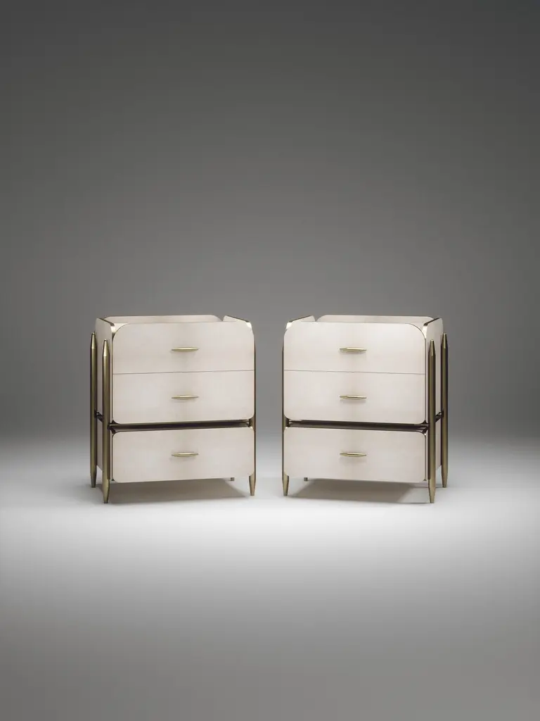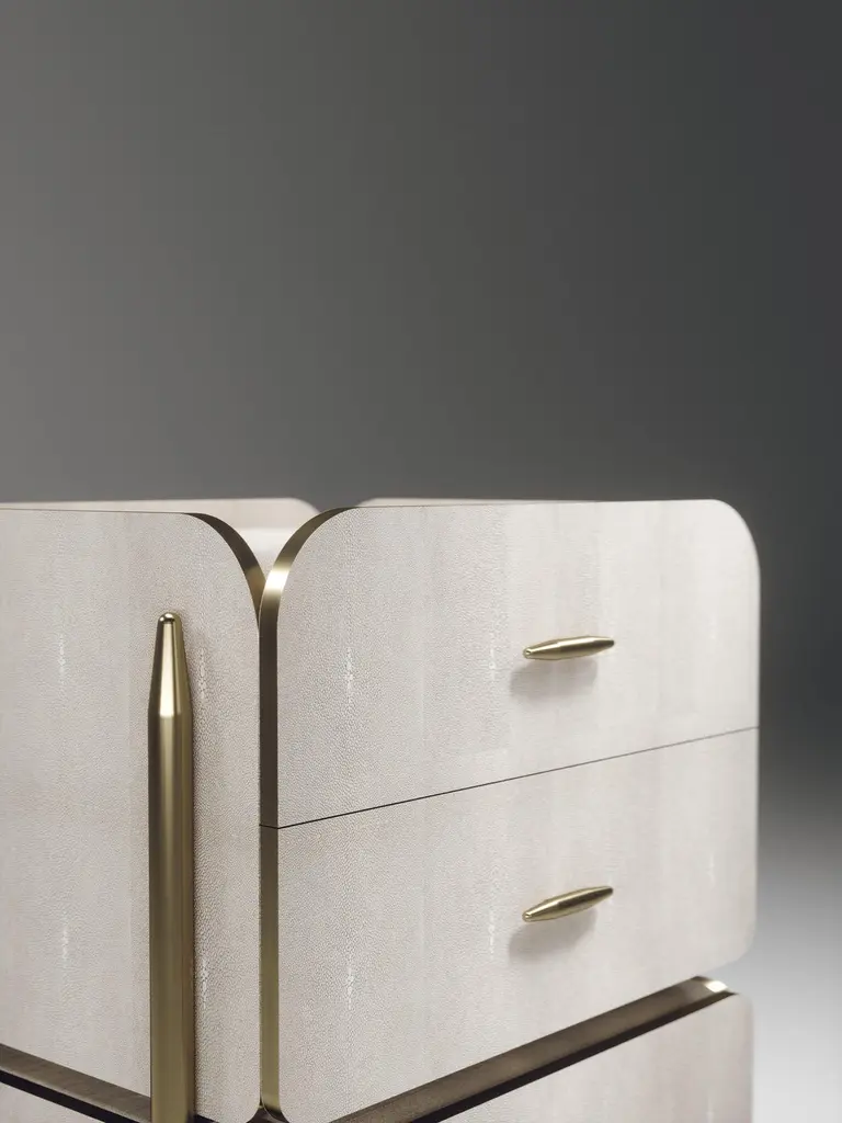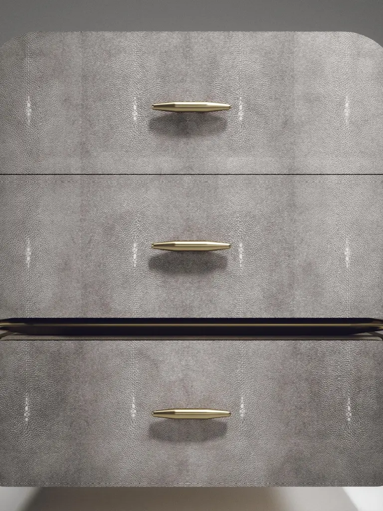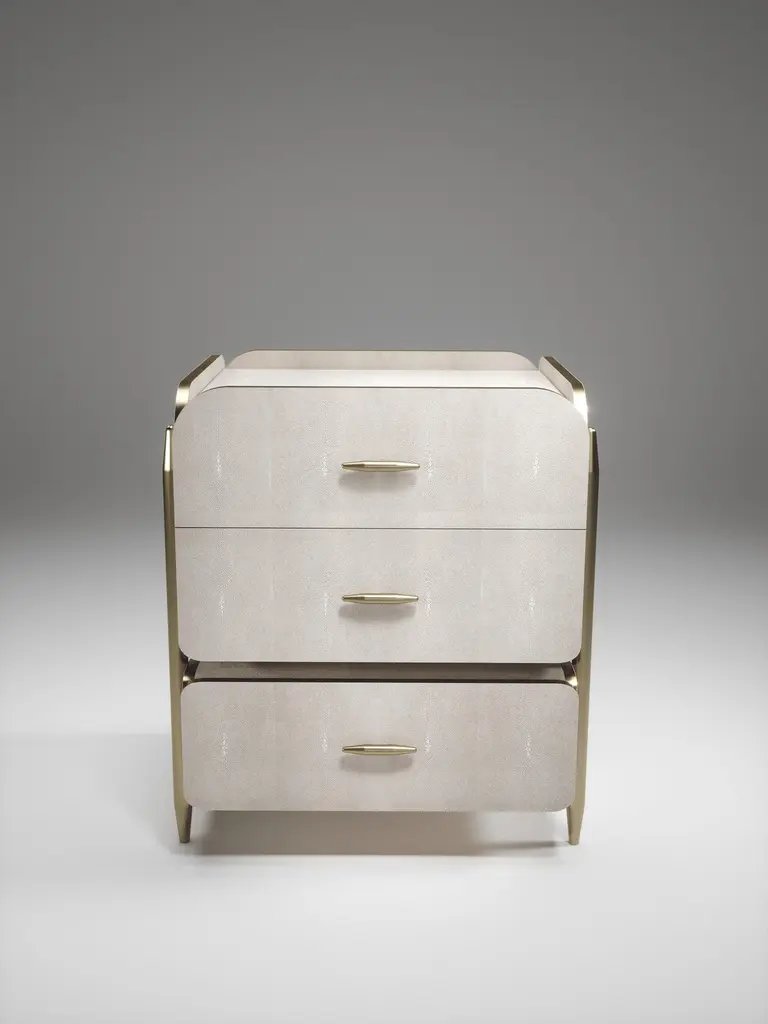 The Paris based label has distinguished themselves since their launch, with their iconic use of shagreen mixed with brass and other exotic materials. All furniture is handcrafted by skilled artisans, ultimately making each piece unique, designed in Paris and produced in the Philippines.The Dandy square bedside table by Kifu Paris is an elegant and a luxurious home accent, inlaid in cream parchment with bronze-patina brass details. This piece includes 3 drawers total and the interiors are inlaid in gemelina wood veneer. Available in shagreen and as a round version; see images at end of slide. This piece is designed by Kifu Augousti, the daughter of Ria and Yiouri Augousti. Custom sizing/finishing available on request.All shagreen pieces are hand-dyed by artisans.The dimensions of this piece are 50 x 45 x 62.7 cmAll Kifu Paris pieces are handmade by artisans, ultimately making each piece unique. Custom color or sizing available on request. Wipe clean with soft dry cloth.Although inspired by her parents, her collection of home accessories and furniture is a distinct identity of its own. Kifu uses handmade techniques of elaborate inlay patterns of shagreen, shells, semi-precious stones, materials she experienced as a child growing up in her parent’s studio, but interpreted in a younger quirkier way reflecting her youth. From her "jewelry inspired knobs" on decorative boxes, gold bar boxes and an extravagant inlay pattern mix of shagreen and shell inspired by galactic constellations, as seen on her enormous round mirror is refreshing to see. Kifu embodies whimsical elements throughout her collection and is not afraid to be daring and unexpected in her approach to design.All shagreen-covered items should be kept out of direct sunlight, color variants may occur on the stingray and other exotic finishes, but this showcases the Parisian label's commitment to creating authentic luxurious products using natural components.For all pieces inlaid with stone and semi-precious stones, due to the natural quality of the material color tonality and pattern placement may differ slightly per piece.