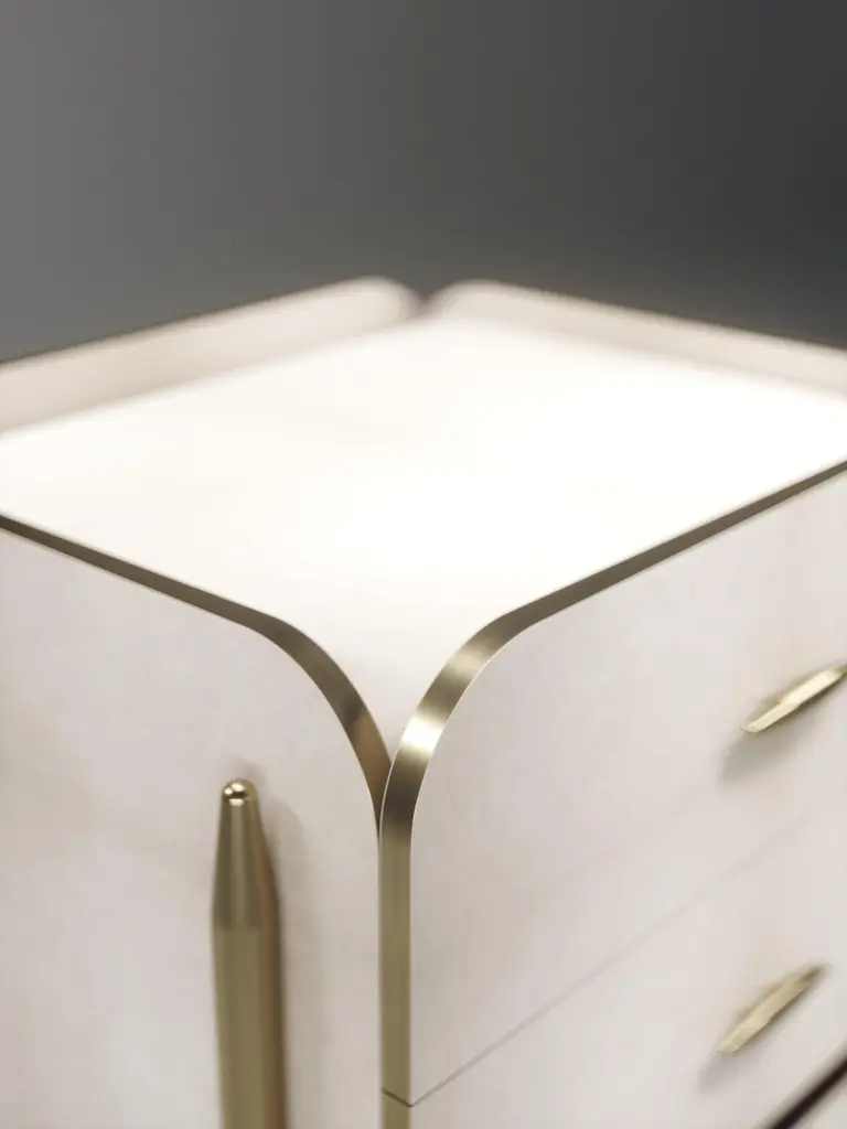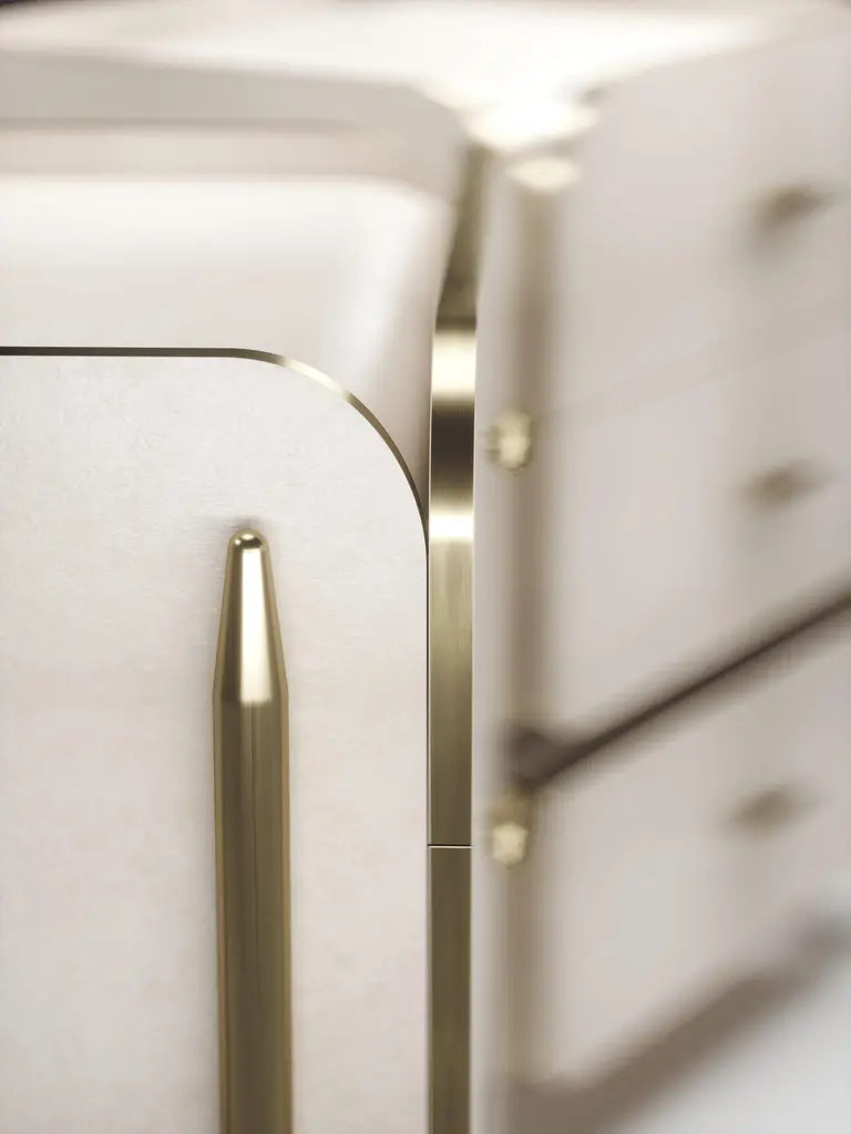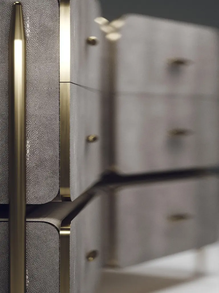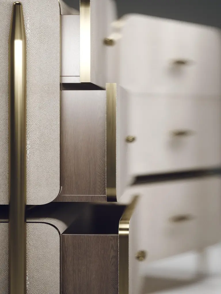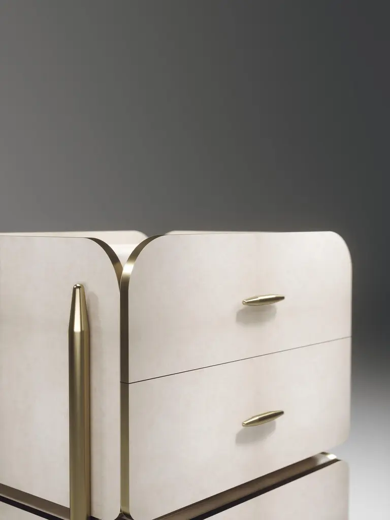 The Paris based label has distinguished themselves since their launch, with their iconic use of shagreen mixed with brass and other exotic materials. All furniture is handcrafted by skilled artisans, ultimately making each piece unique, designed in Paris and produced in the Philippines.The Dandy square bedside table by Kifu Paris is an elegant and a luxurious home accent, inlaid in cream parchment with bronze-patina brass details. This piece includes 3 drawers total and the interiors are inlaid in gemelina wood veneer. Available in shagreen and as a round version; see images at end of slide. This piece is designed by Kifu Augousti, the daughter of Ria and Yiouri Augousti. Custom sizing/finishing available on request.All shagreen pieces are hand-dyed by artisans.The dimensions of this piece are 50 x 45 x 62.7 cmAll Kifu Paris pieces are handmade by artisans, ultimately making each piece unique. Custom color or sizing available on request. Wipe clean with soft dry cloth.Although inspired by her parents, her collection of home accessories and furniture is a distinct identity of its own. Kifu uses handmade techniques of elaborate inlay patterns of shagreen, shells, semi-precious stones, materials she experienced as a child growing up in her parent’s studio, but interpreted in a younger quirkier way reflecting her youth. From her "jewelry inspired knobs" on decorative boxes, gold bar boxes and an extravagant inlay pattern mix of shagreen and shell inspired by galactic constellations, as seen on her enormous round mirror is refreshing to see. Kifu embodies whimsical elements throughout her collection and is not afraid to be daring and unexpected in her approach to design.All shagreen-covered items should be kept out of direct sunlight, color variants may occur on the stingray and other exotic finishes, but this showcases the Parisian label's commitment to creating authentic luxurious products using natural components.For all pieces inlaid with stone and semi-precious stones, due to the natural quality of the material color tonality and pattern placement may differ slightly per piece.