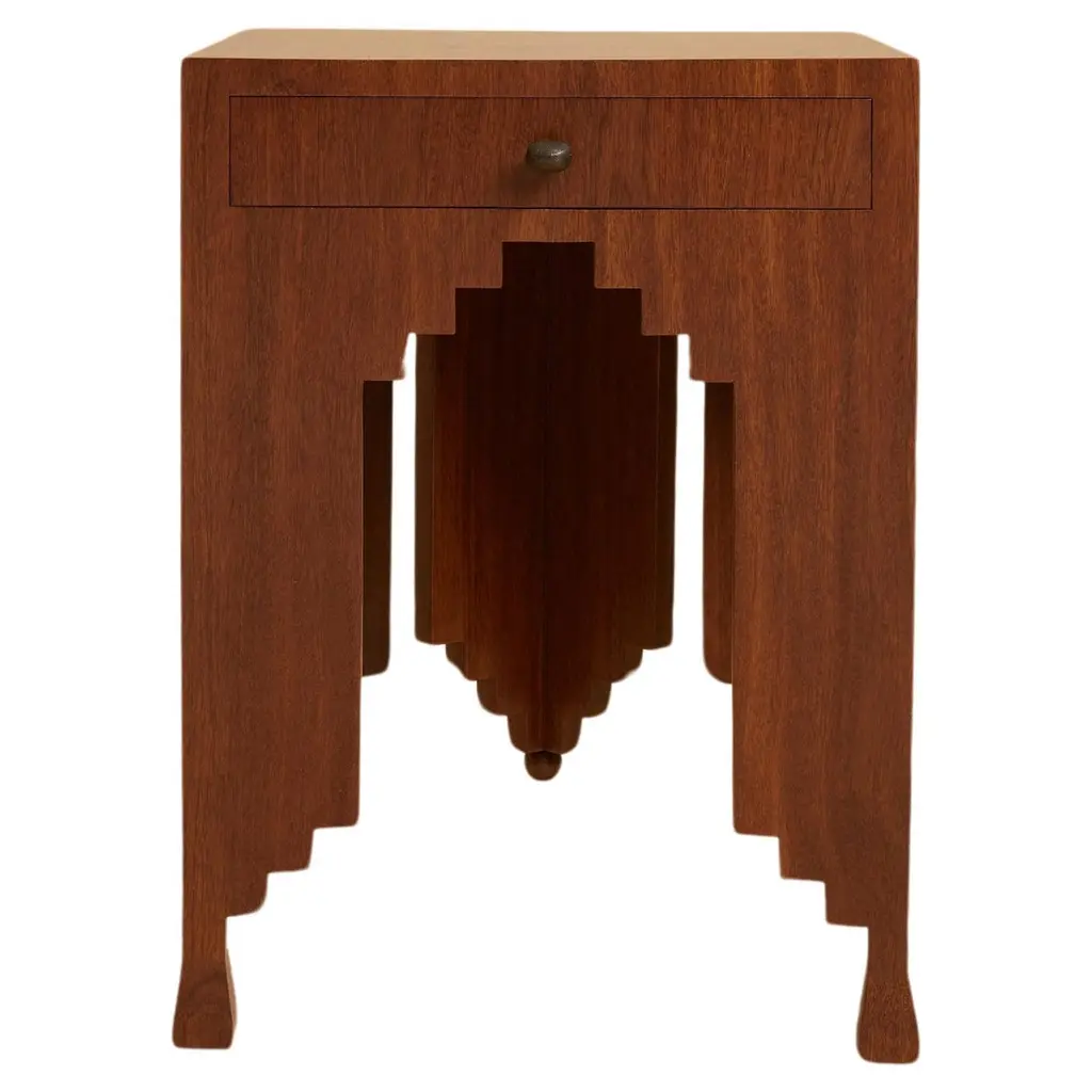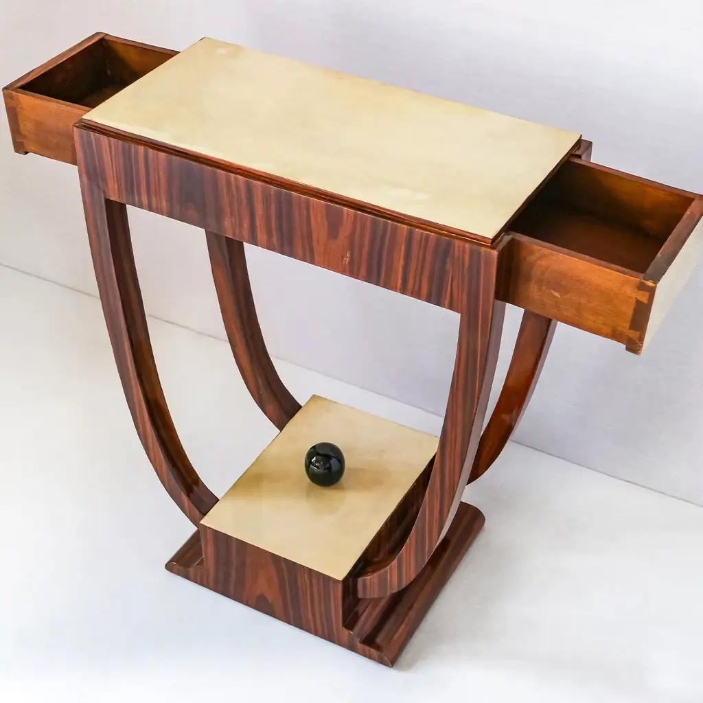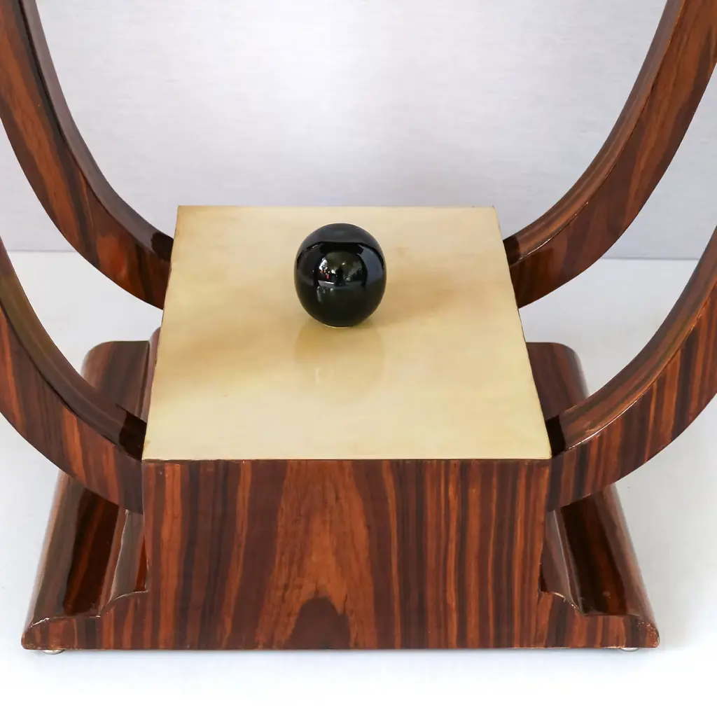 This marvelous side table is an eclectic design of Art Deco inspiration, comprised of a striking variety of sleek shapes, charming shades, and practical features. Made of fir wood, the structure is veneered with precious rosewood, while the top and the bottom shelf are covered with natural parchment. The latter is also adorned with a fascinating, polished black-lacquered sphere in beechwood, adding geometric allure to its elegant design. The top features two side drawers.