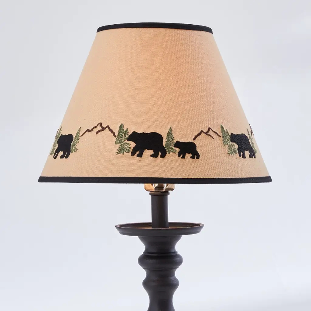 This nature lampshade features an embroidered scene with black bears strolling through the woods and mountains. The table shade is crafted from 100% cotton fabric over an opaque backing which is hand trimmed and sewn and has a washer fitting for use with a harp and finial. A perfect bedside, office desk or end table addition in a rustic or country home.