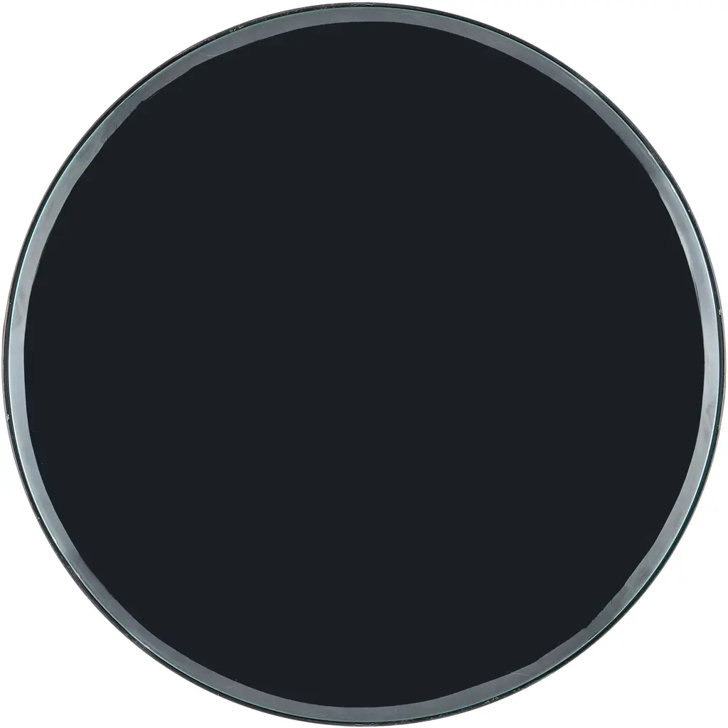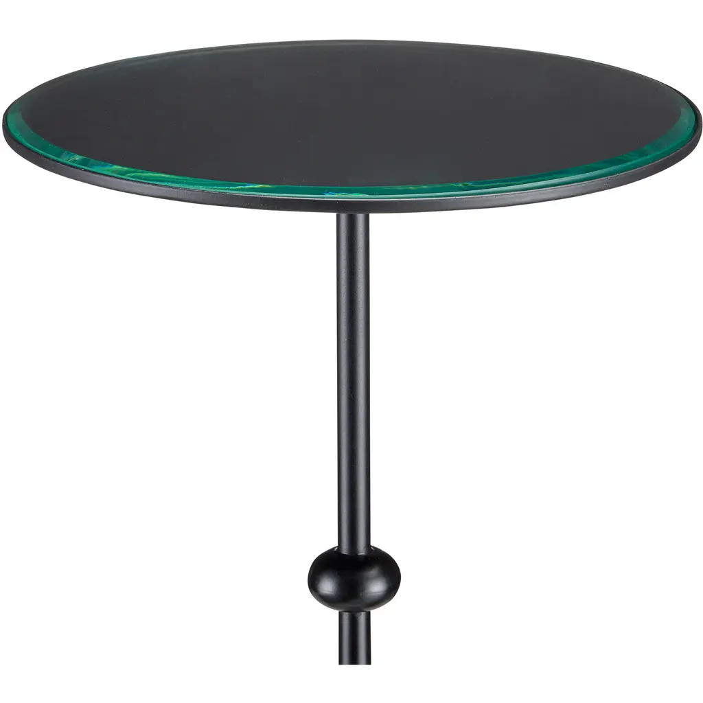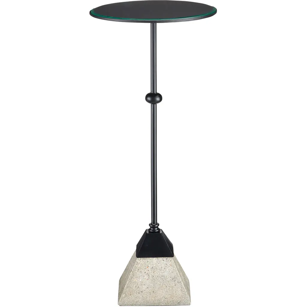 The Parna Concrete Accent Table has a stealth profile created by wrought iron in a satin black finish that rises above a pyramid-shaped base made of polished concrete. An inset clear glass disc with beveled edges fits seamlessly into the top.
