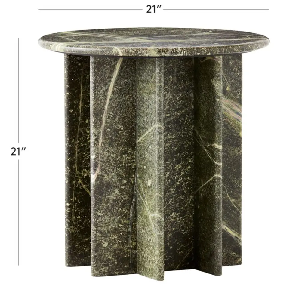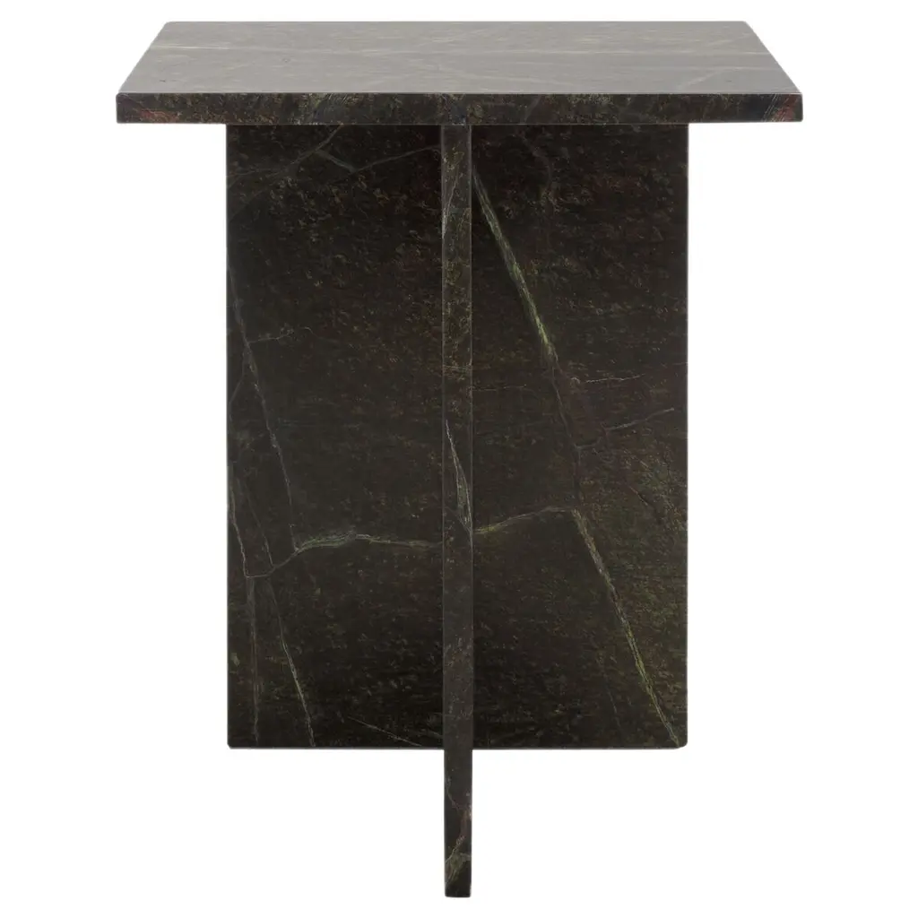 Crafted with highly active forest green marble, side table by Melbourne-based VUUE incorporates geometric design elements for a stunning silhouette. The marble's dynamic veining and striking tones of moss and cream give it mesmerizing allure, and the variation inherent to natural stone ensures that no two tables will be alike. CB2 exclusive.