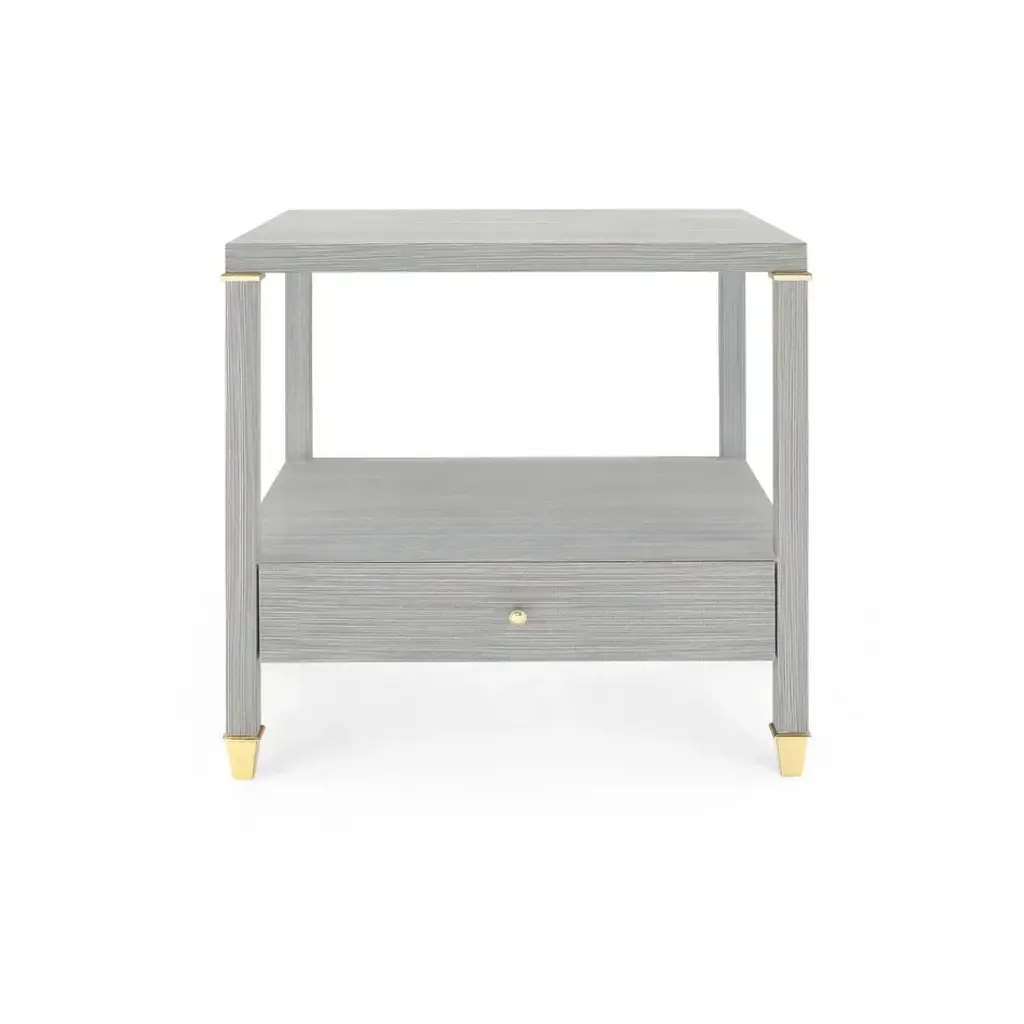 Villa & House’s designs provide an air of tasteful luxury fit for every corner of your home. The Pascal 1-Drawer Side Table is an example worth embracing. Its open silhouette is equal parts structured and airy, with a cubic profile that speaks to modern tastes. In addition to its top, its framed lower shelf works as a display area for small decorative statues, petite pottery, or a stack of books you want to show off. A sleek drawer makes up its base, with stained interiors for storing any living room or bedside essentials. The handsome piece is sumptuously wrapped in our signature silky grasscloth and finished in a coat of lacquer for added sheen and softly textured sophistication. Thoughtfully placed brass accents secure the Pascal’s upscale look, from the sabots on its feet to the pull on its drawer. Whether solo or styled as a pair, the Pascal elevates any room with its rich materials and fresh shape.