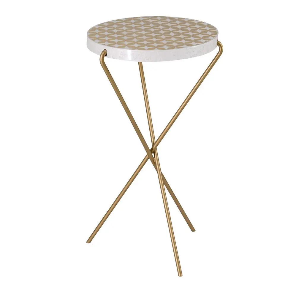 Extra-thin metal rods intricately intersecting in a willowy golden base lend this side table its distinctive lightness. The circular erable top boasts luminous brass inlays for a contrasting geometric pattern attesting to an exceptional artisan quality perfected by the chromatic interaction between white and gold. Traditional materials trace a contemporary silhouette, lending the piece its distinctive versatility.