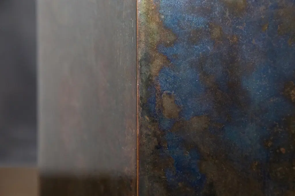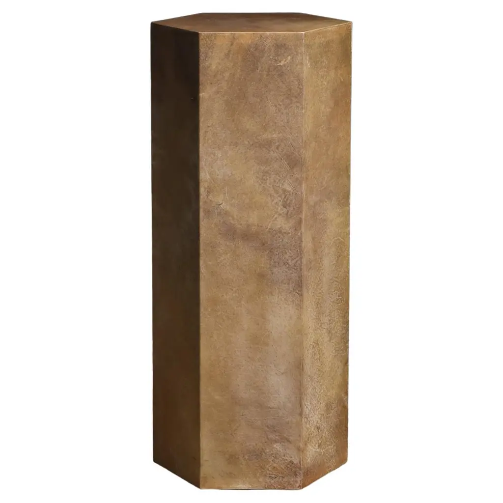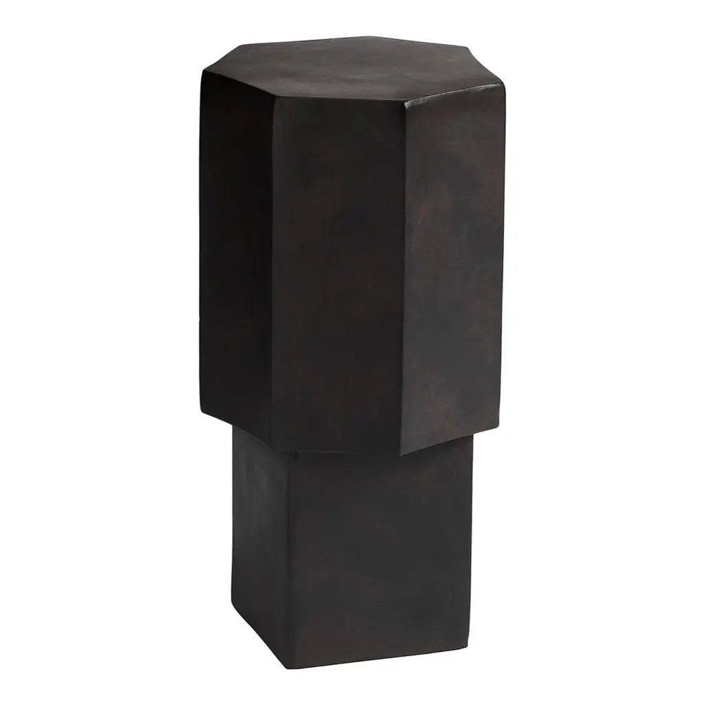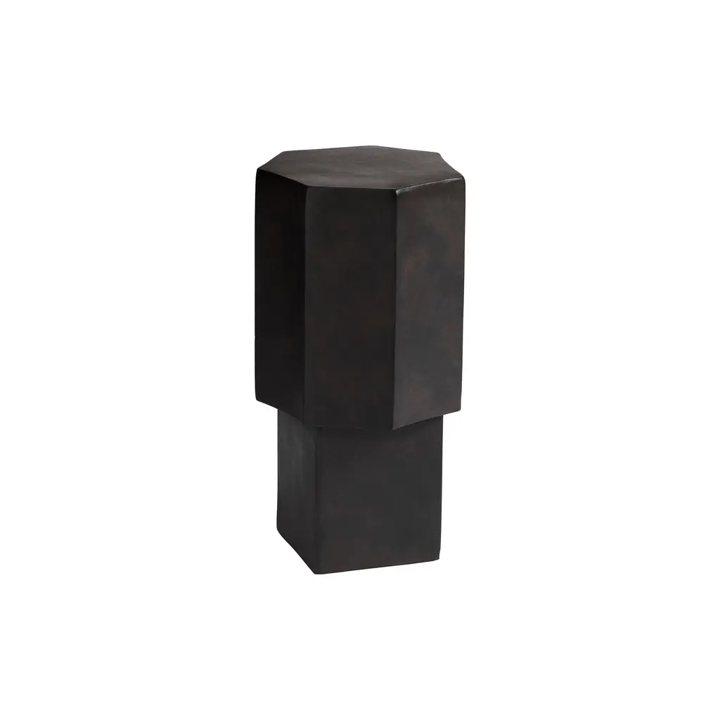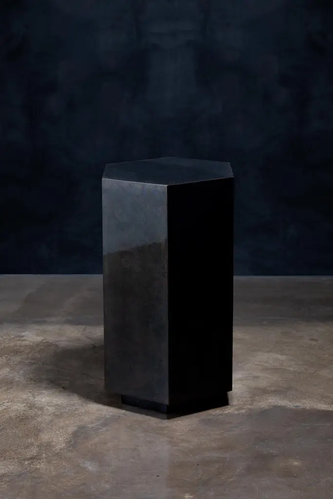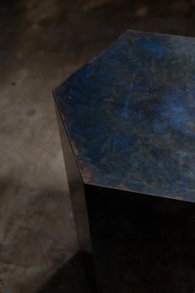 Ettore Hex's name comes from its hexagonal shape and can be specified in any of Costantini’s available materialsand finishes. Shown here in patinated steel, this side table feature a modern, geometric shape that allows thesubtle variations of the chosen material's finish to be the focus of the work.