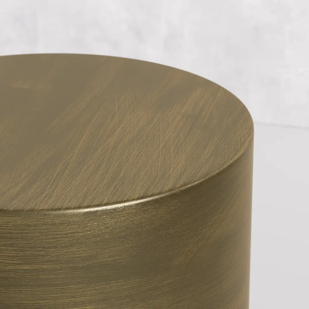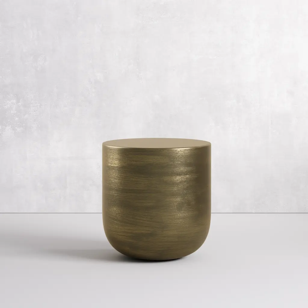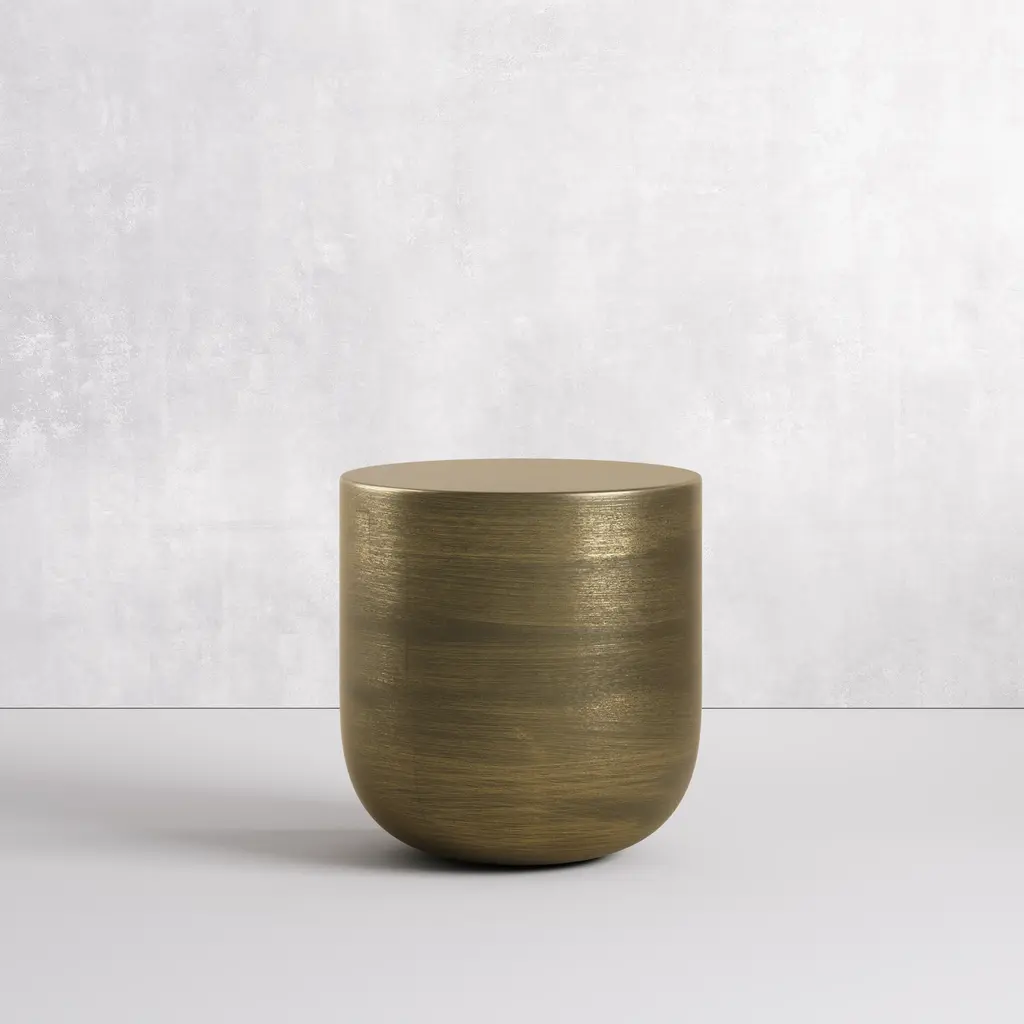 Our Pattaya side table is made of a hammered aluminum surface in a glossy brown shade. An effortlessly natural look, this side table is an earthy take on contemporary design. Add warmth to your living room with this slightly-exotic accent piece. Dimensions: 17.25''W x 17.25''D x 18.0''H Tear Sheet