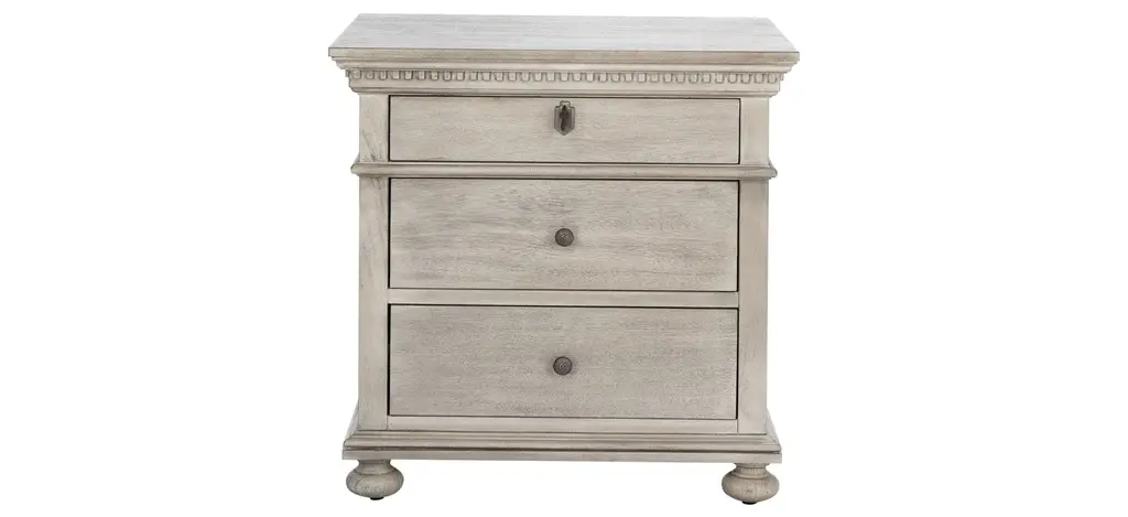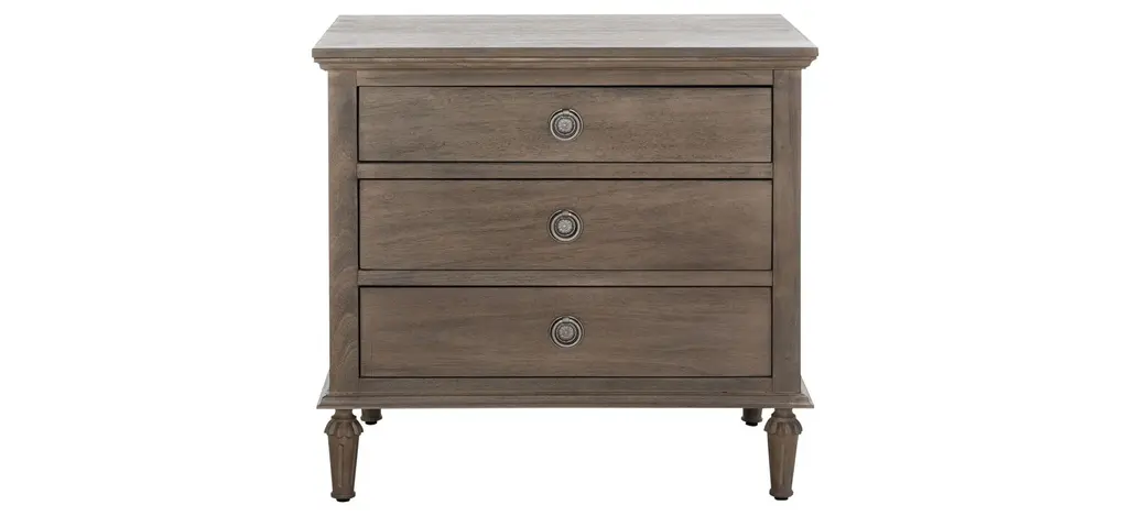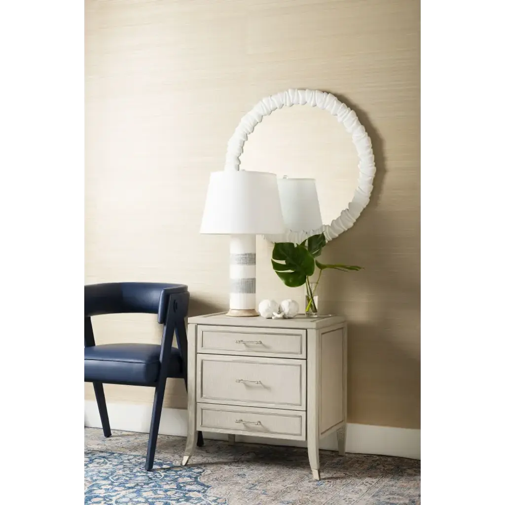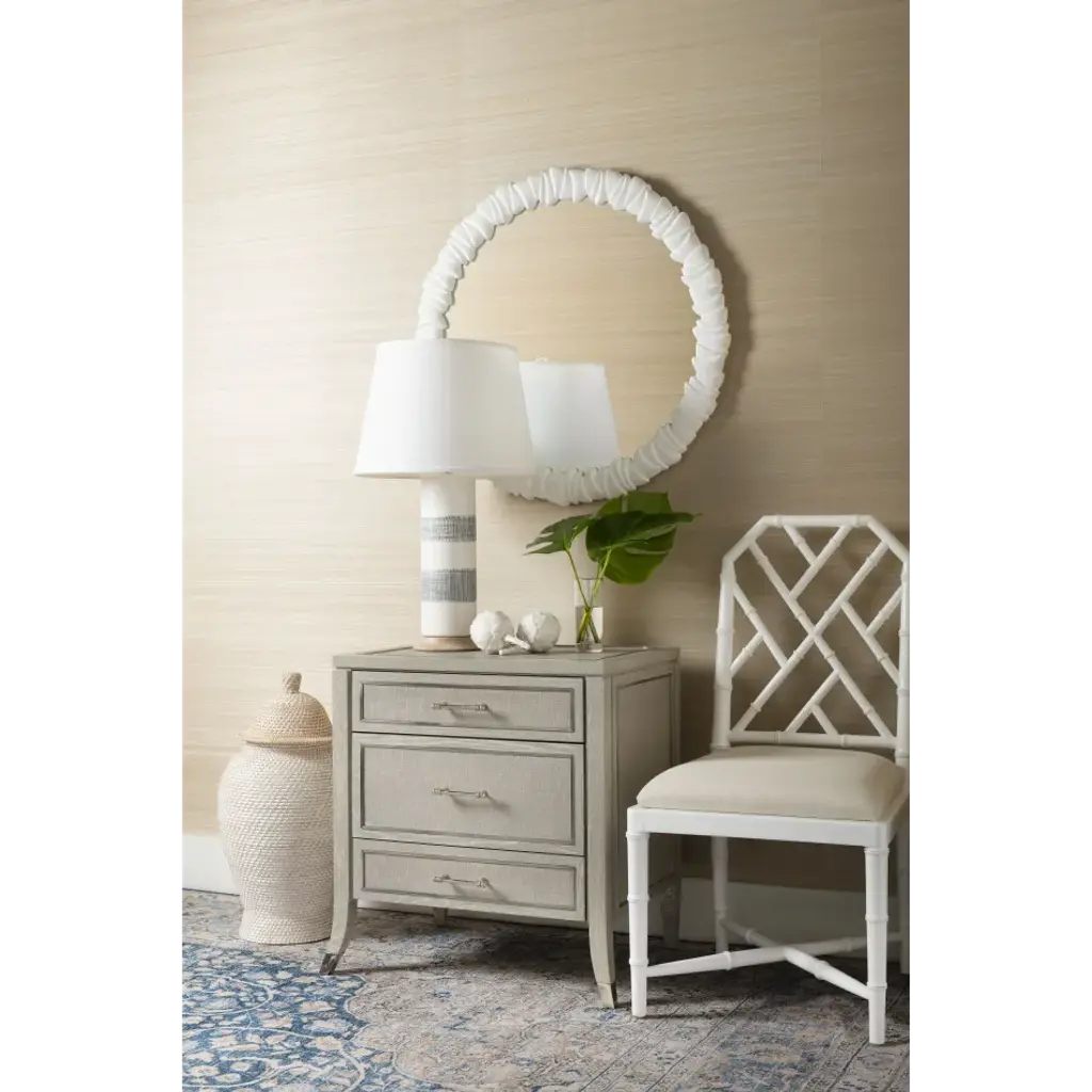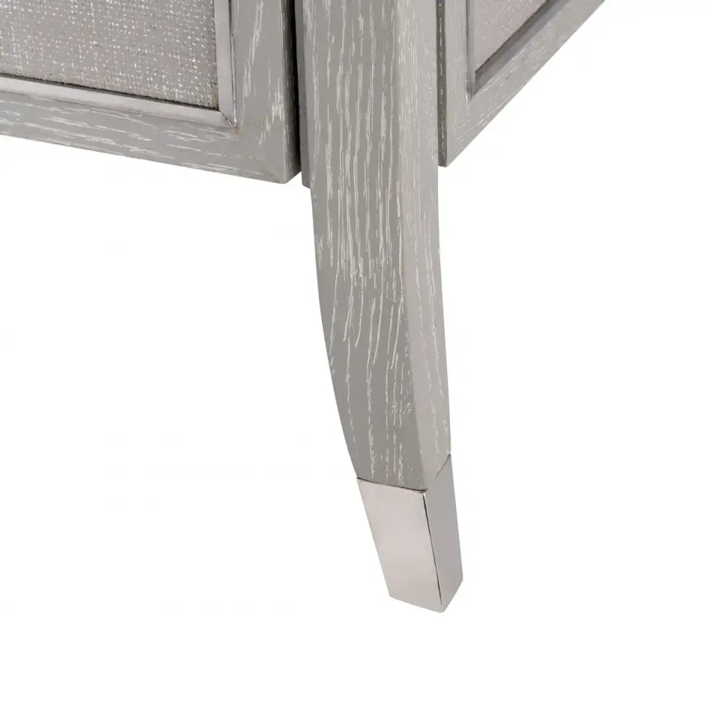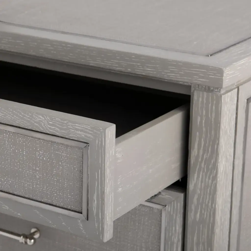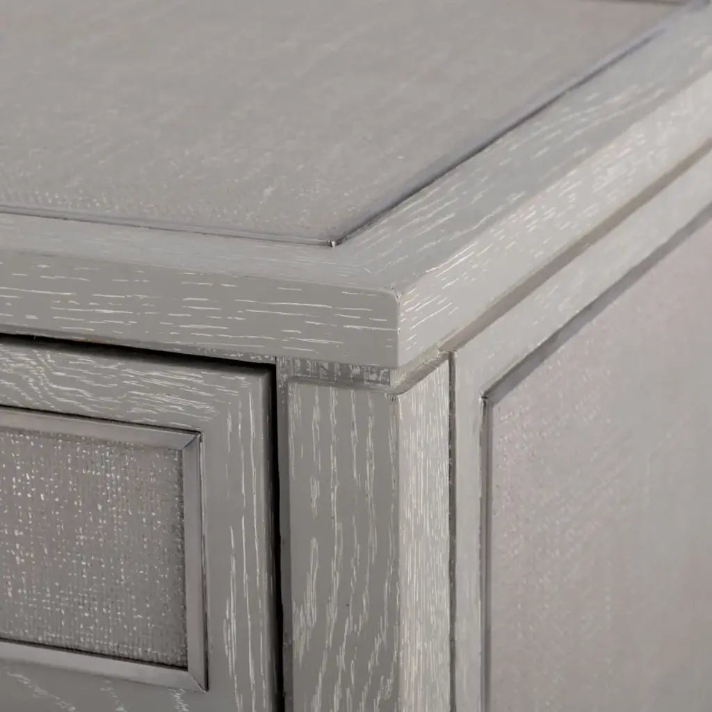 The old world sophistication and polished presence of the Paulina 3-Drawer Side Table make it truly hard to resist. Its silhouette embraces the expressive elegance of vintage Chinoiserie design, while its construction boasts the unmatched quality of Villa & House’s contemporary craftsmanship. A marriage of organic materials, the Paulina brings a framework of gray cerused oak together with carefully woven and lacquered jute panels, which adorn the top, sides, and trio of drawers. Gorgeous details bring the piece together, and act as a true testament to the skills of our artisans, from the gracefully flared front legs to the glittering accents of nickel appearing on its drawers and sabots. For cultured tastes and cosmopolitan spaces, this side table is a must.