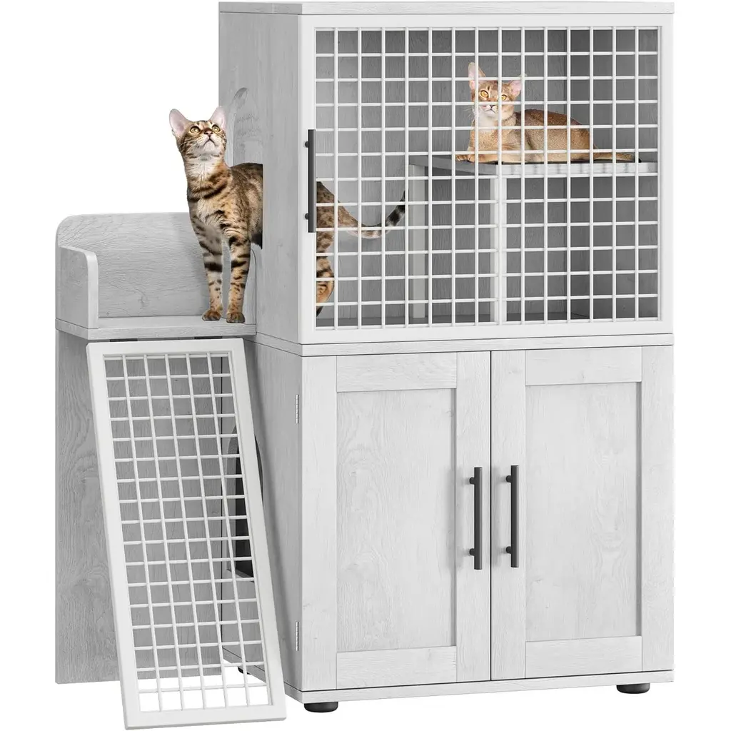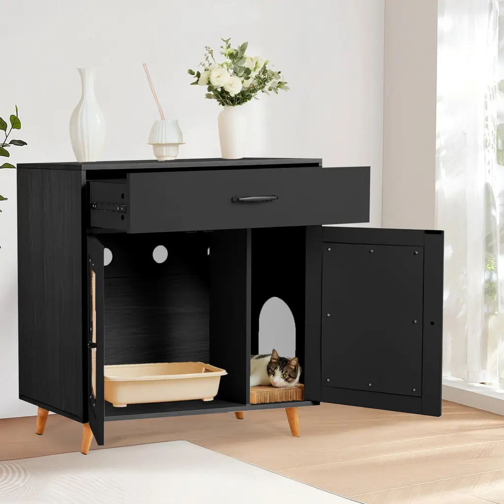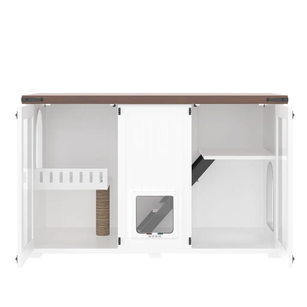 Adjustable Partition: Adapt the interior to you and your cat's preference with a removable and adjustable wall that provides more space on either the left or the right. Customize this design to fit your belongings and your pet.Multi-Functional: Featuring end table functionality, this hidden litter box furniture provides an extra large tabletop and a spacious interior for keeping more items on the roof surface and allowing a large amount of space for your pet.Magnetic Doors: Let the doors do the rest of the hidden cat litter box for you with magnetism. The quick-closing saves effort.Easy to Clean: The glossy finish is easy to clean with a quick wipe down. The bottom of the enclosed litter box is off the ground, and there are no insects due to moisture.Hidden Cat Box Information: Overall Dimensions: 29.5" W x 20.75" D x 20" H. Interior Space: 18" W x 19" D x 17.75" H (Left), 8.75" W x 19" D x 17.75" H (Right). Suitable for Cats Up to 11 lbs. Assembly Required.