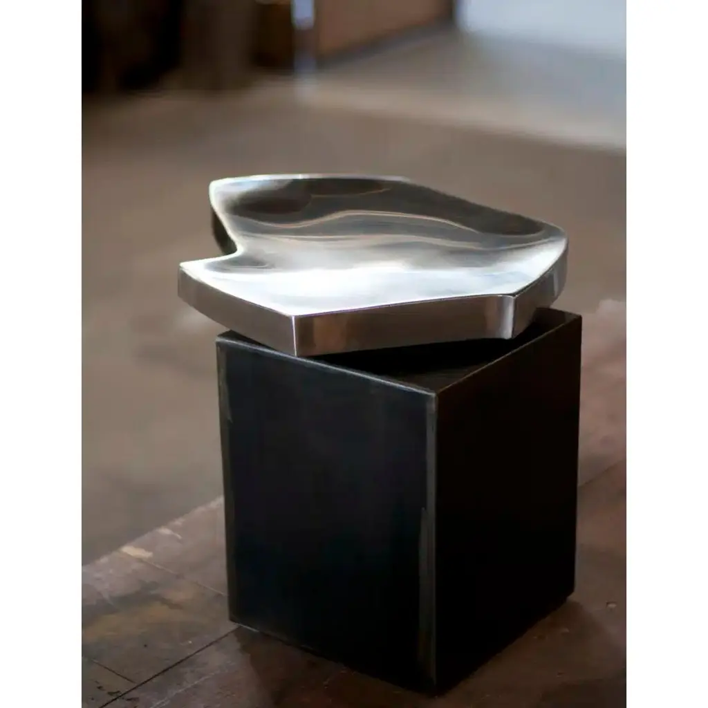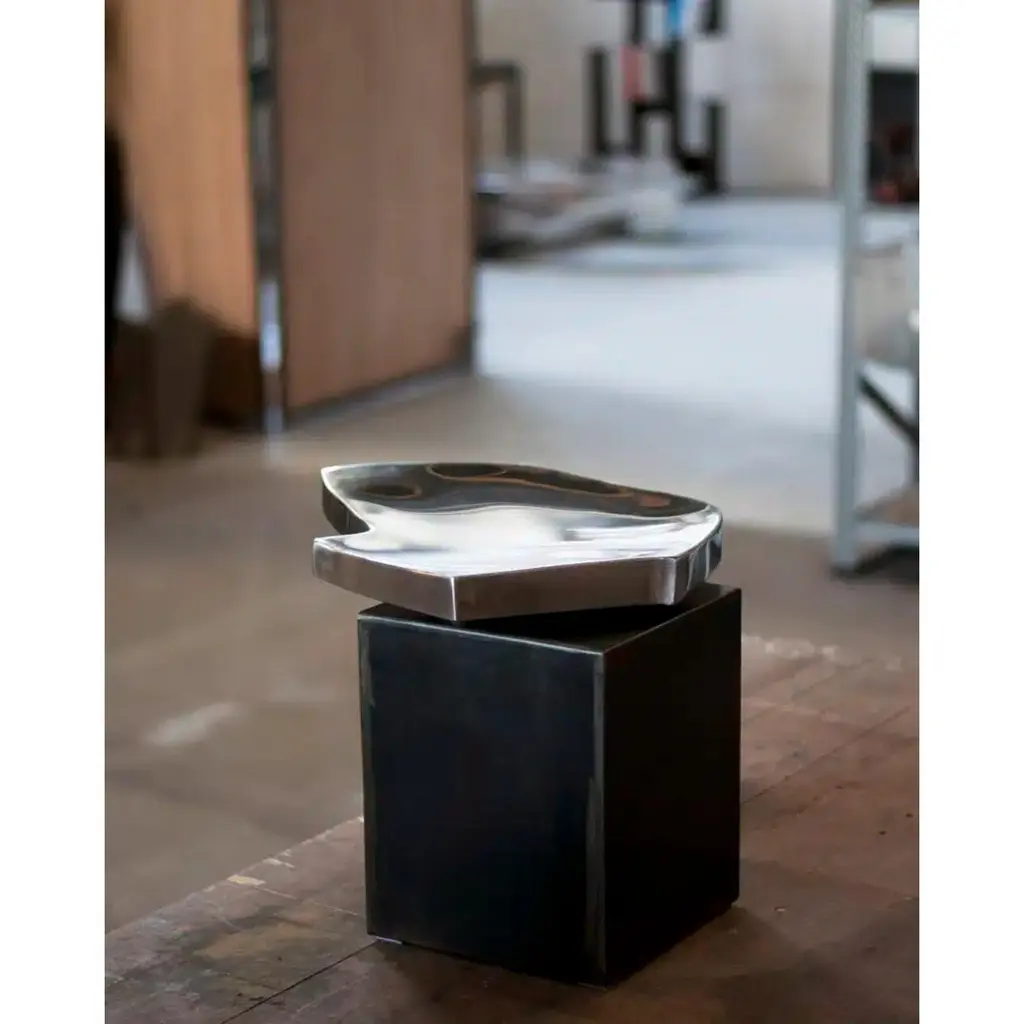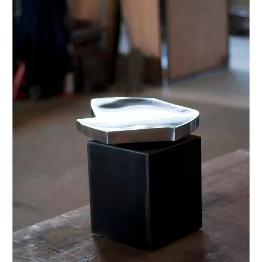 Pebble Side Table by Pol Quadens Limited Edition Of 24+4 Pieces.Dimensions: D 55 x W 55 x H 35 cm.Materials: Polished stainless steel and linen.Pol Quadens was born in Brussels. His father was active in the fields of composites the metal industry, and the world of materials, therefore, surrounded Pol since his early childhood. After his artistic studies, he starts restoring vintage cars. This experience has allowed him to gain strong practical skills and a deep knowledge of all materials.In 1987, he made his first creations and production of objects. His sensitivity and passion for the arts led him to create functional artworks. His CD shelf has sold more than 100,000 pieces and has become iconic in its category.