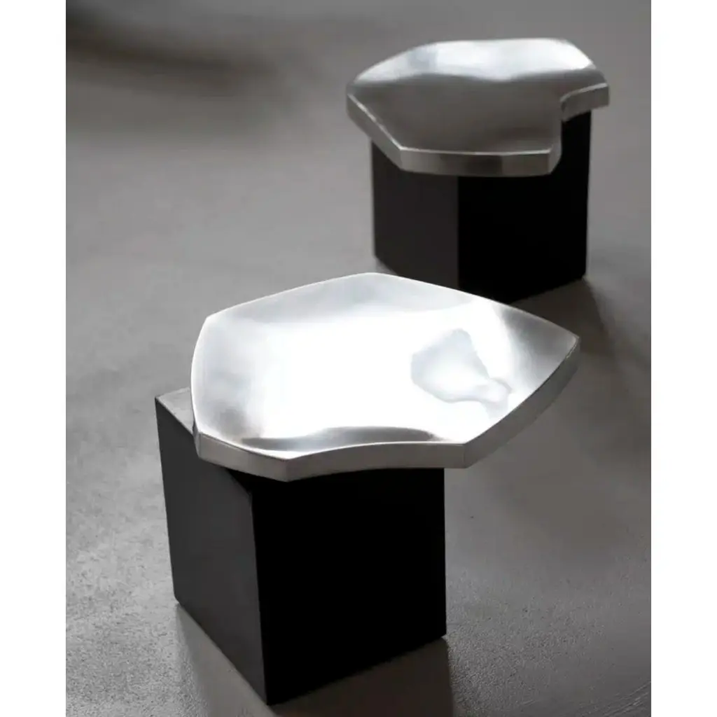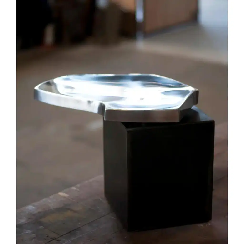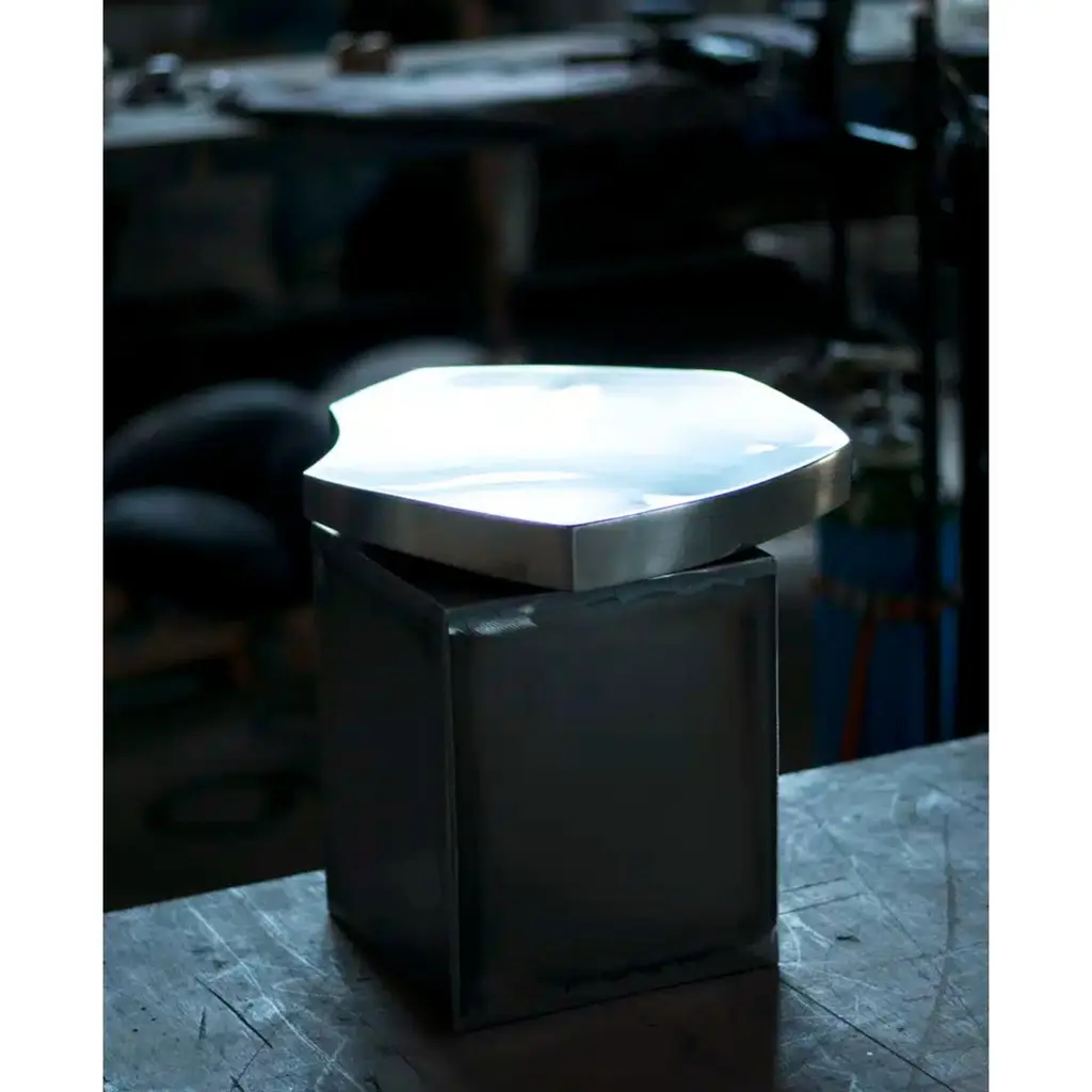 Pebble Side Table by Pol Quadens Limited Edition Of 24+4 Pieces.Dimensions: D 55 x W 55 x H 35 cm.Materials: Polished stainless steel and linen.Pol Quadens was born in Brussels. His father was active in the fields of composites the metal industry, and the world of materials, therefore, surrounded Pol since his early childhood. After his artistic studies, he starts restoring vintage cars. This experience has allowed him to gain strong practical skills and a deep knowledge of all materials.In 1987, he made his first creations and production of objects. His sensitivity and passion for the arts led him to create functional artworks. His CD shelf has sold more than 100,000 pieces and has become iconic in its category.
