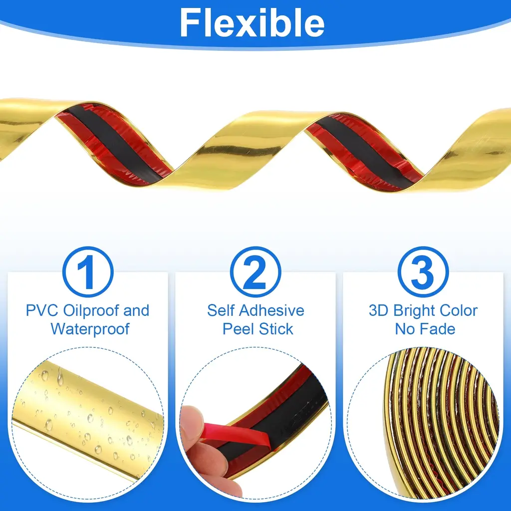 DescriptionMaterial - Crafted from PVC material. Unlike traditional wood trim, It is moisture-proof, anti-corrosion, oil-proof, dust-proof, and waterproof, and easy to clean. Flexible materials and self-adhesive molding trim can be attached to many smooth surfaces.Self-Adhesive Design - The robust adhesive backing ensures effortless application on various surfaces including walls, doors, mirrors, floors, and windows. It leaves no residue behind, ensuring a seamless fit.Wide Application - Suitable for most corners and surfaces (tile, plastic, marble, metal, glass, wood, smooth wall, exterior wall), great for bathroom, bedroom, living room, kitchens, borders, cabinets, mirrors, etc. It can cope with all kinds of situations and especially helps you to hide many defects and uneven surfaces.How to Install - Clean the wall, then cut the desired length of the wall base and peel off the adhesive film on the back to install.Durable Feature - It's bright in color, does not fade or deform over time and will keep a long time different from the traditional trim. It is easy to clean with a wet towelSpecification:Total Size: 2 x 100 cm/0.8" x 3Ft (W*L)Material: PVCColor: GoldPackage Content: 1 x Molding Trim