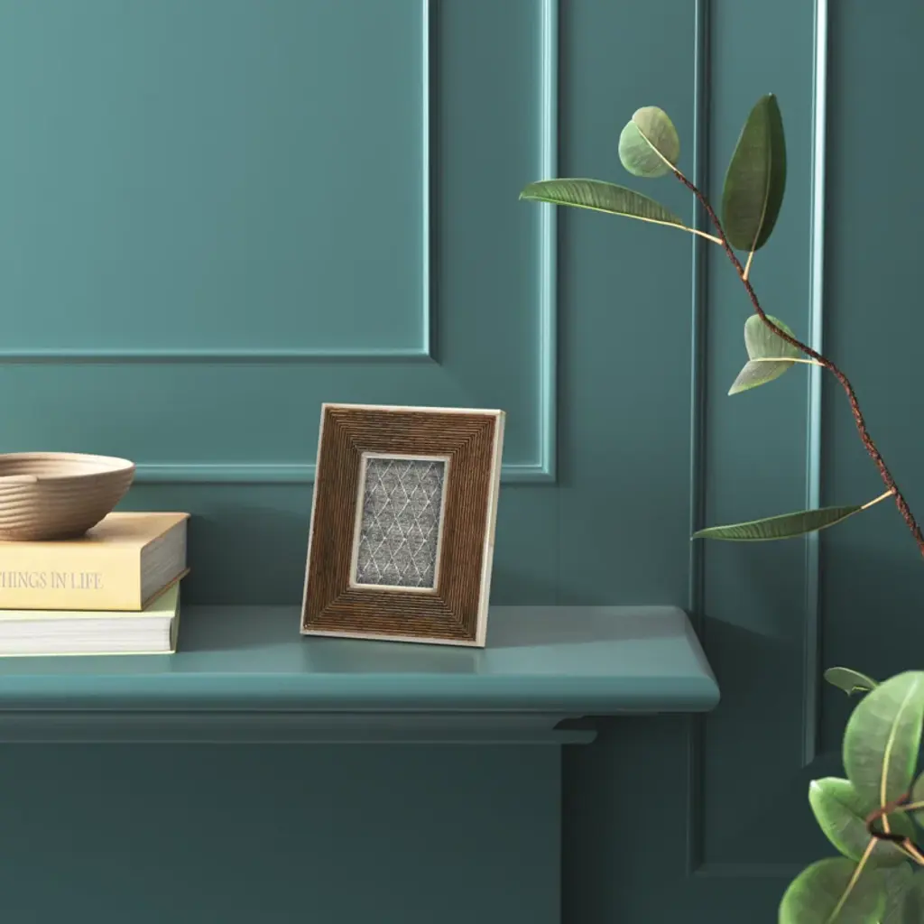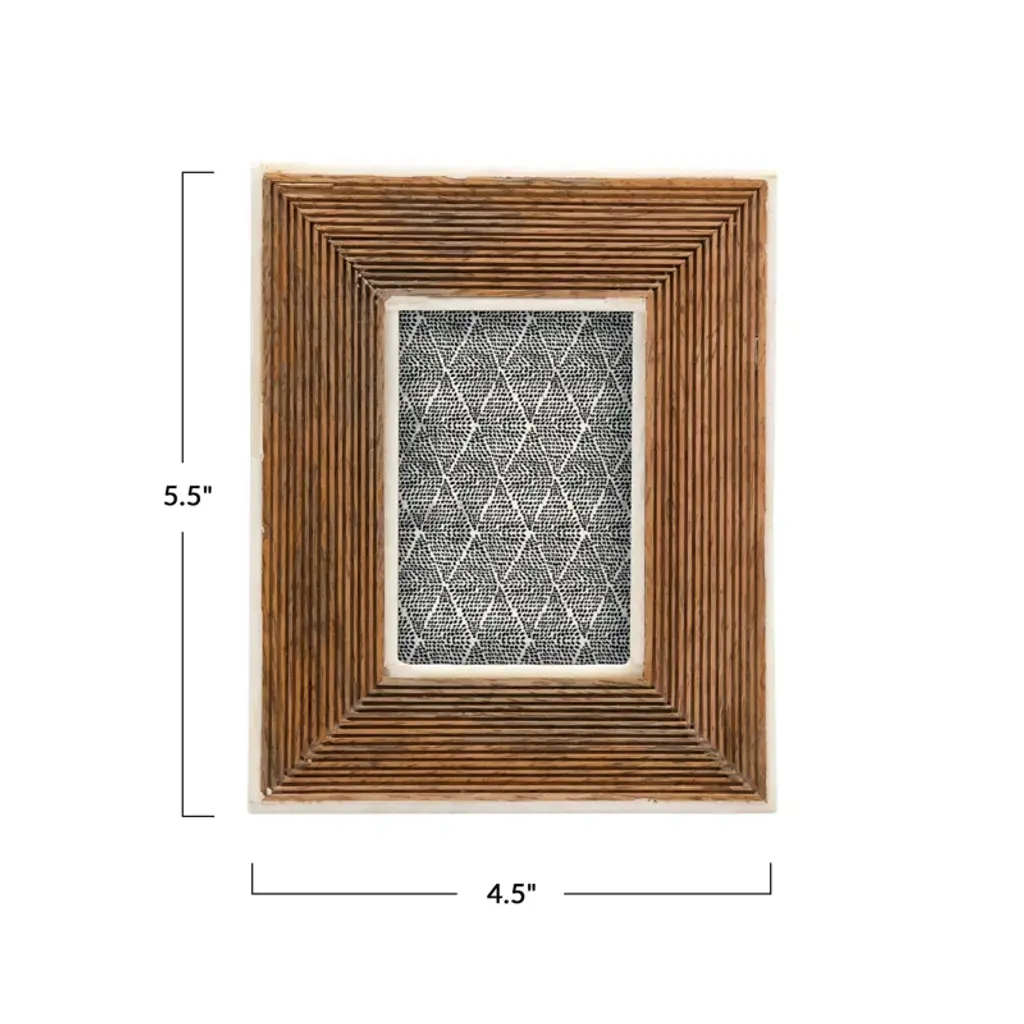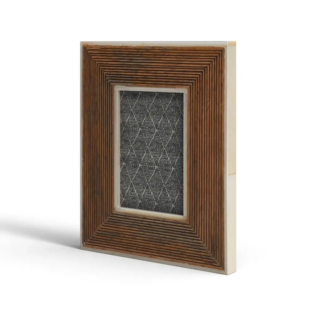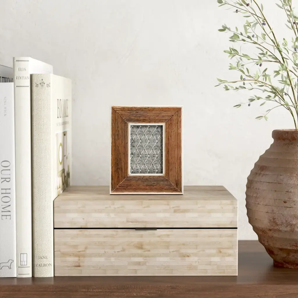 This photo frame is perfect for displaying your favorite memories. Hand-carved, this frame is made out of mango wood and features a ribbed pattern with a bone edge that matches any décor style. Looks great placed on shelves, side tables, and dressers for an easy decoration
