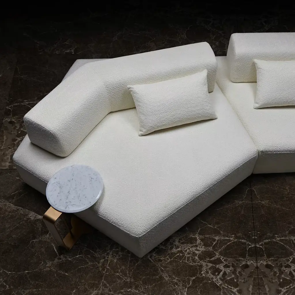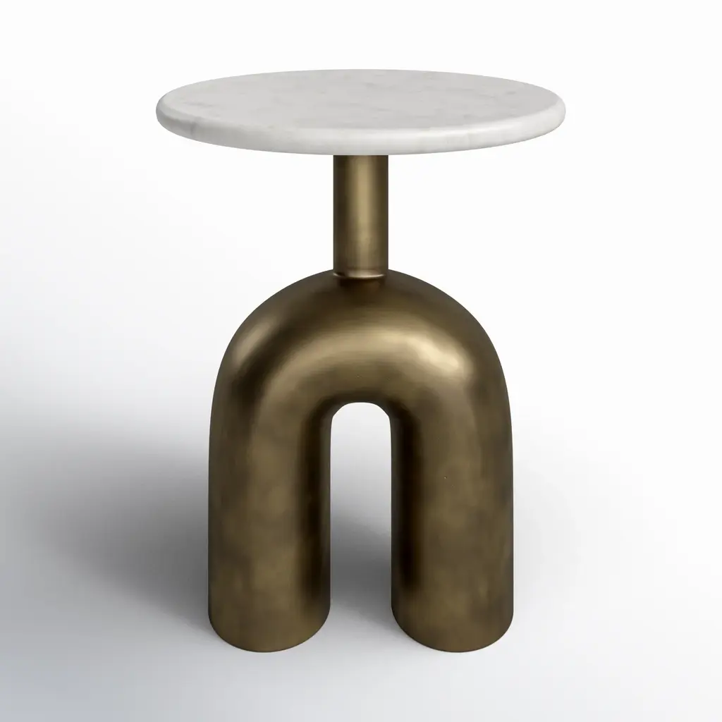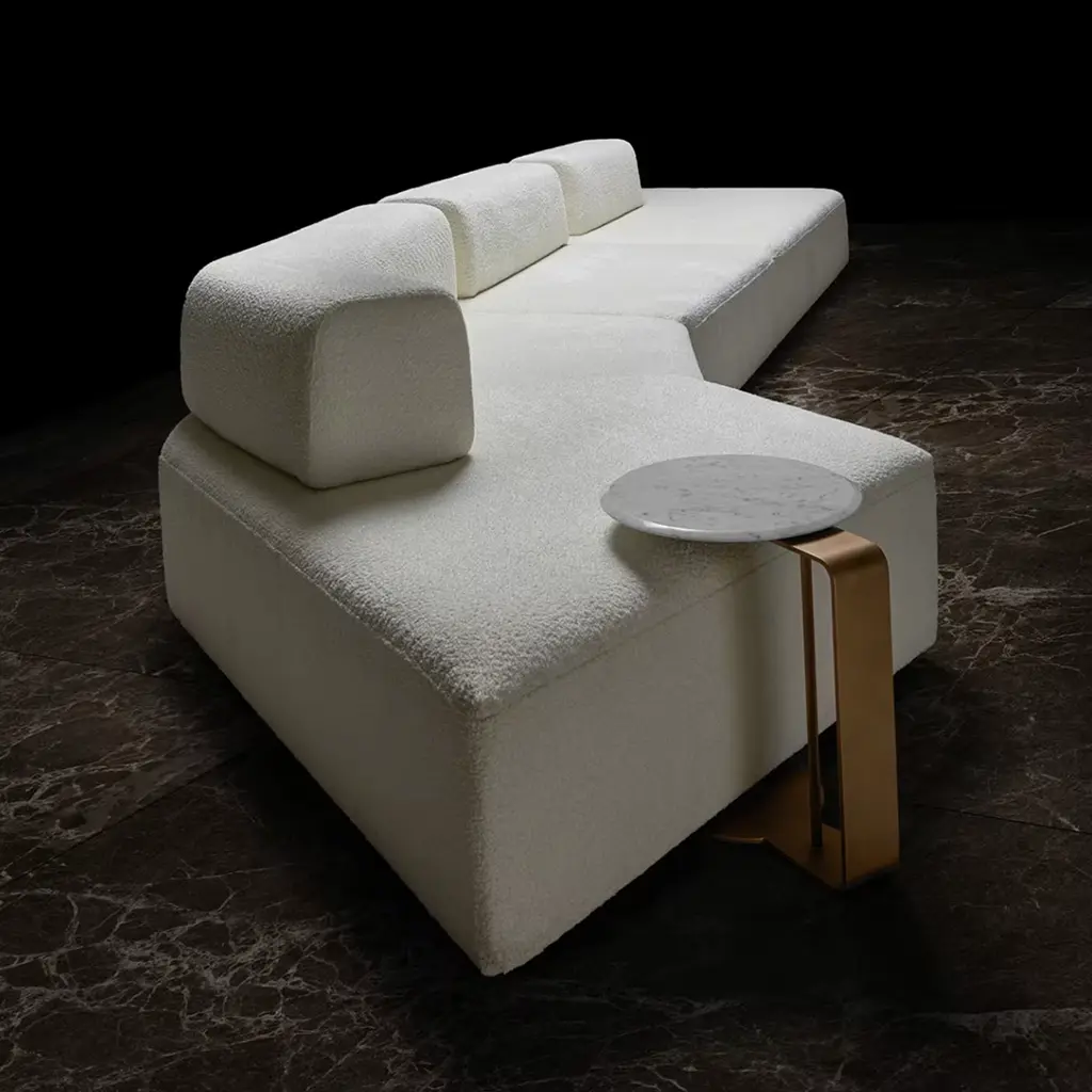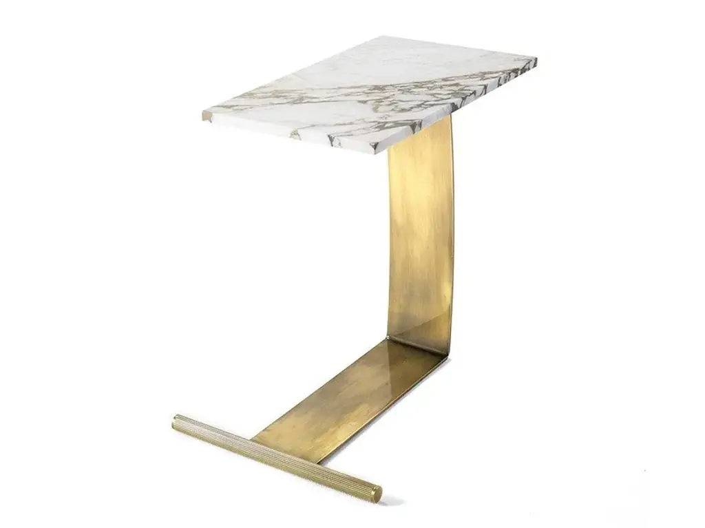 Side table in bronze painted metal with Carrara marble top. The metal finish has the characteristic of having crossed streaks created specifically to give depth and value to the element. It can be used alone or combined with our Penta sofa by inserting it at the base of this. It is a sculptural element of great aesthetic impact but at the same time useful and functional to support a laptop.