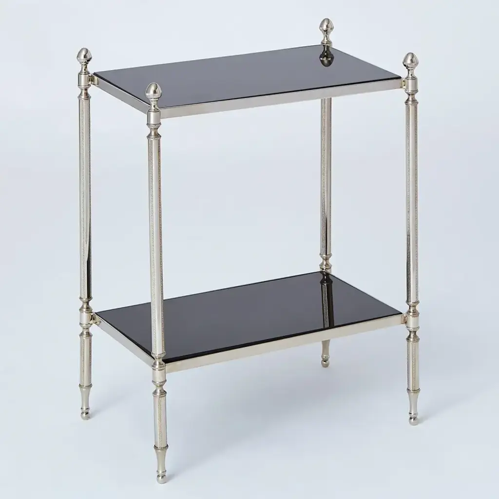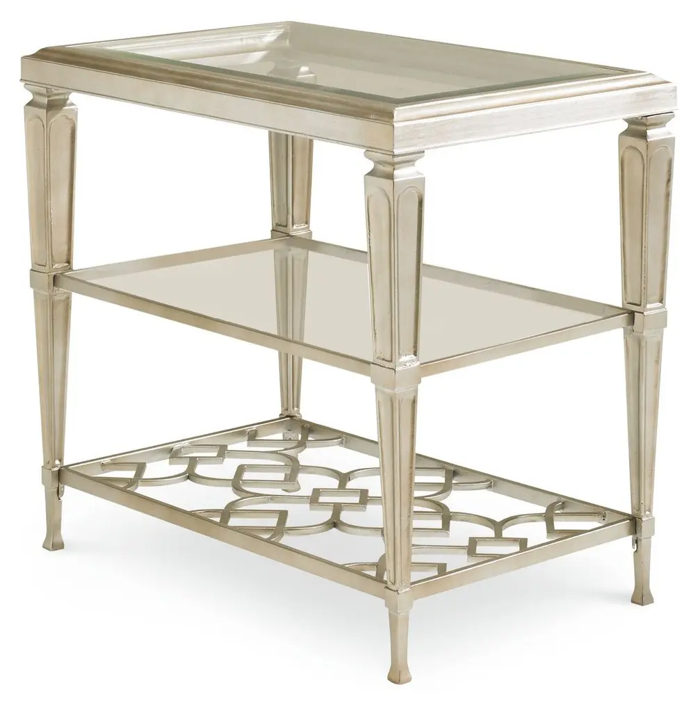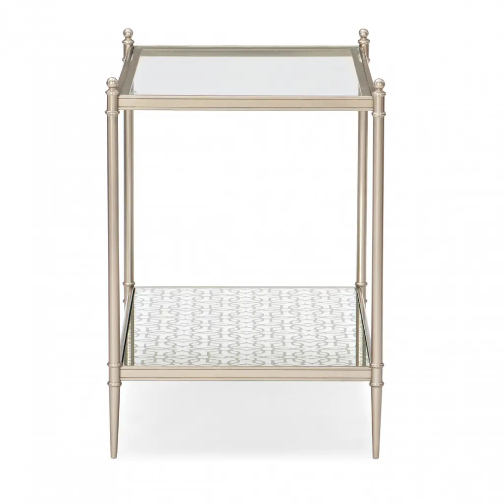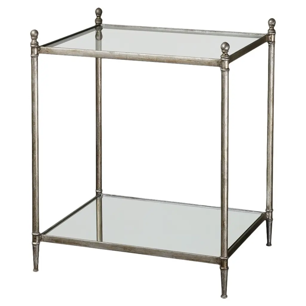 Perfectly balanced in every way, this brilliant table is a true essential. Minimal by design, its streamlined form is smartly scaled and designed to blend seamlessly into any setting. Its modern mix of materials includes a clear glass top, a metal frame finished in Neutral Metallic, and a lower shelf crafted of a back-painted mirror featuring a Silver Leaf pattern. For storage, serving or display—this stylish piece fits the occasion.