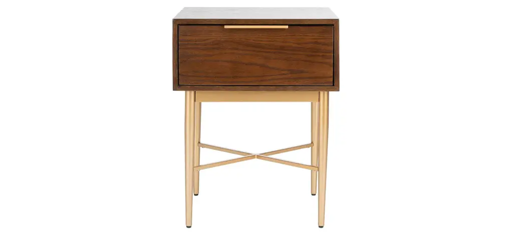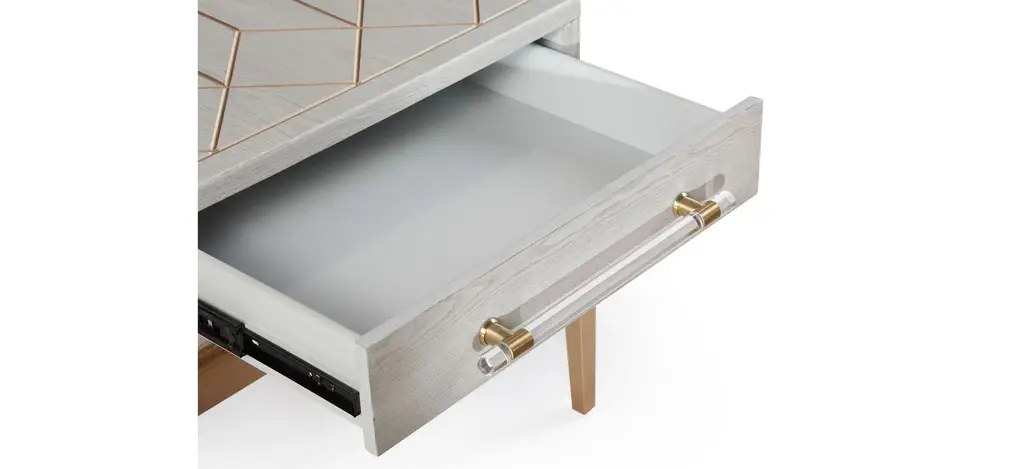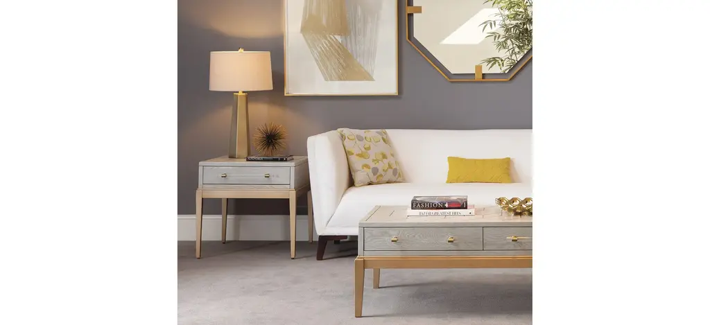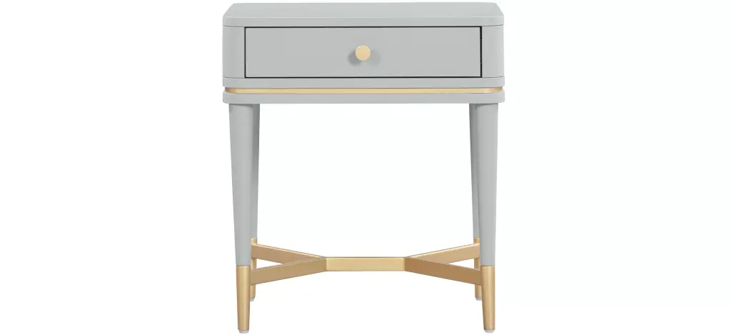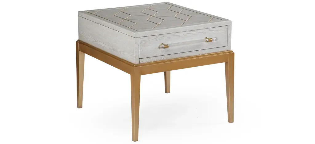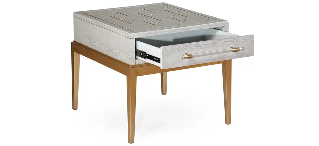 The Perrine End Table is finished in a soft graphite and accented with antique gold geometric design on the top, antique gold base, and acrylic bar pulls on the drawer.