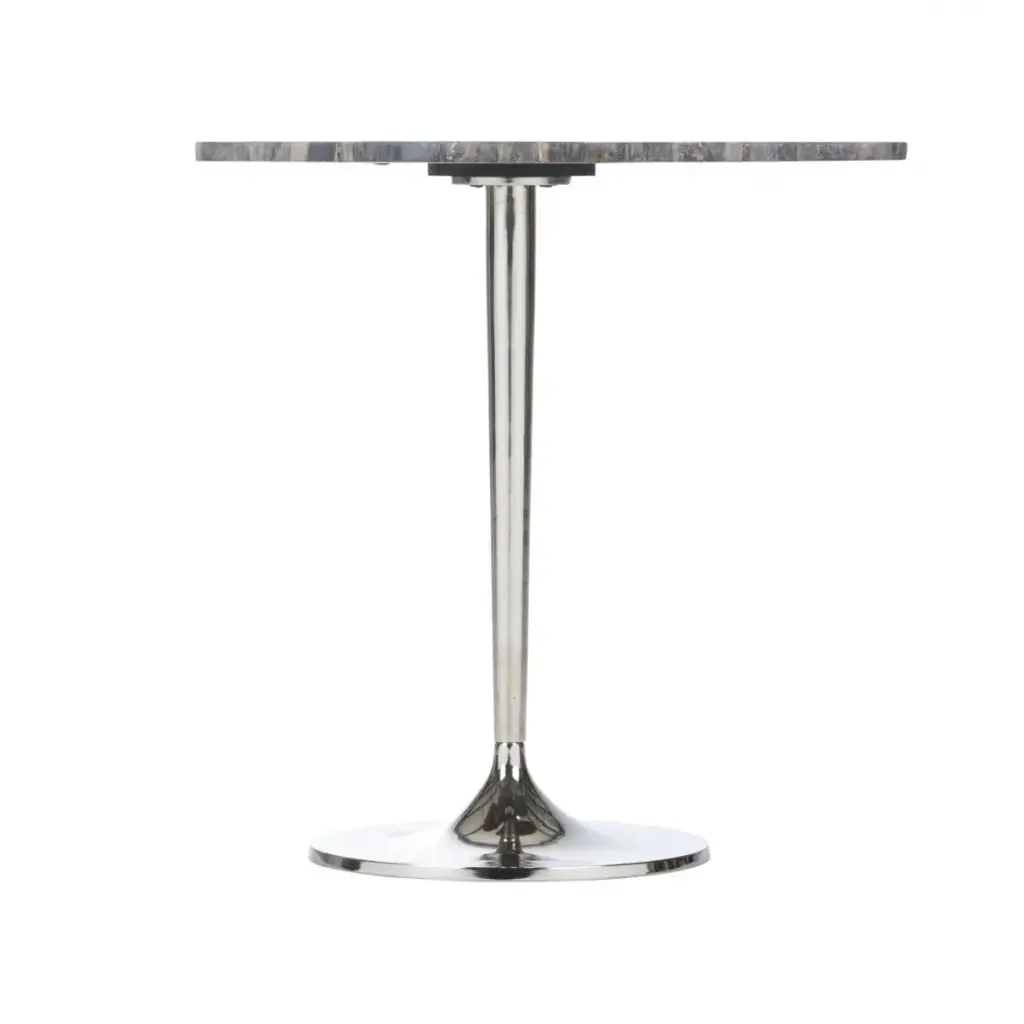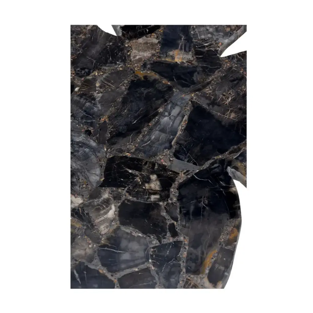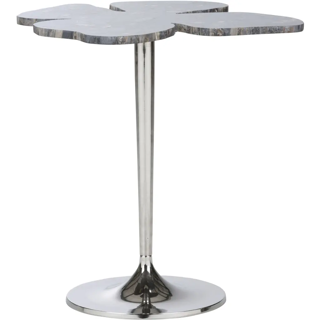 THE PETAL SIDE TABLE HAS A FLOWING ORGANIC FEEL AND FEATURES A HAND CUT PETRIFIED WOOD TOP ON A SILVER METAL BASE. COMES KD. TOP SIZE MAY VARY.