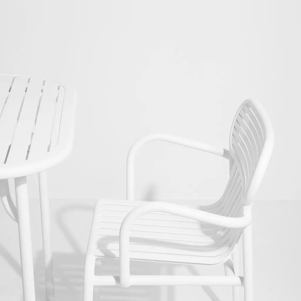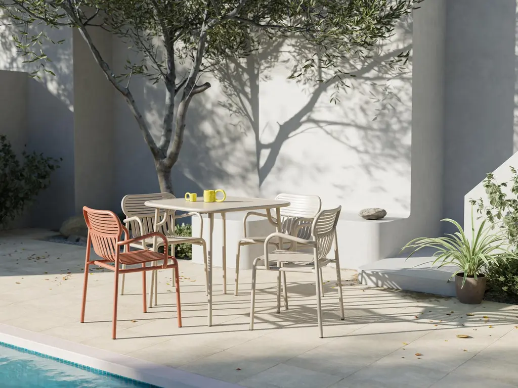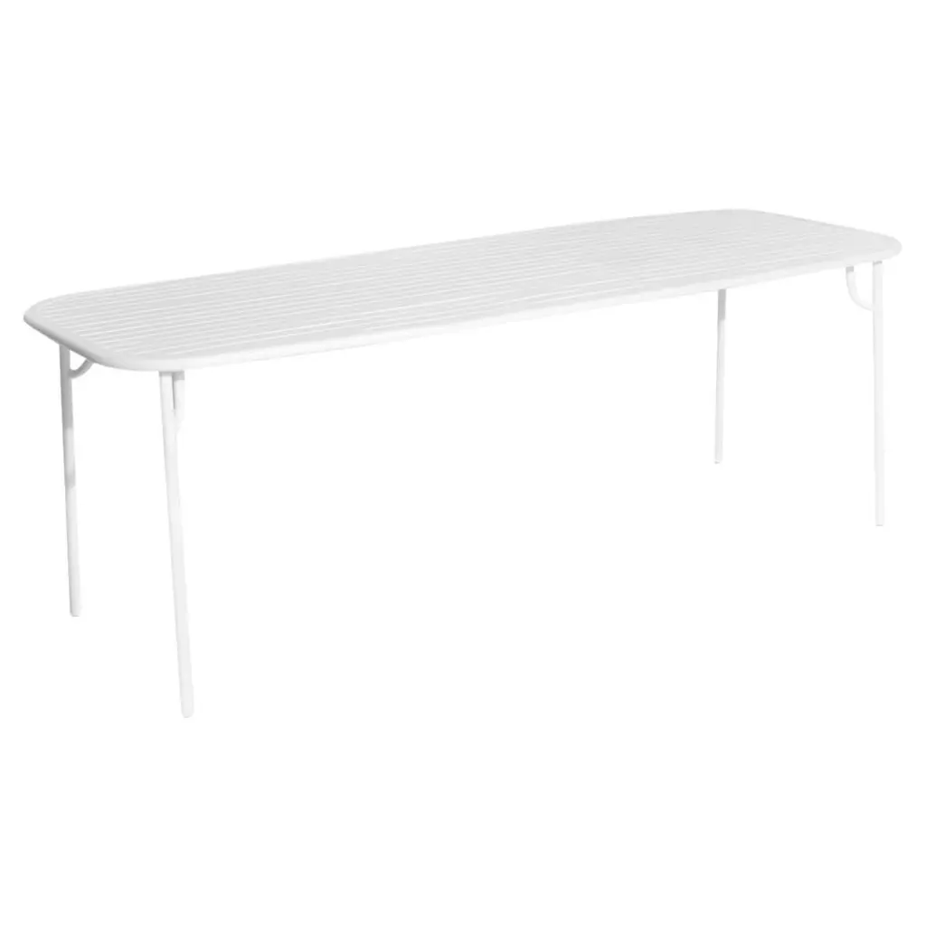 The WEEK-END collection is a full range of outdoor furniture. The impact of the horizontal and vertical slats, so similar to stripes, highlights the full and empty spaces, asserting the identity of the collection. The aluminium slats are laser cut in one piece thereby removing any need for screws or welds, and the semi-rounded edges for the trim mean there are no sharp edgesThis collection presents products of great resistance. Made from aluminium, there is zero risk of rust or corrosion even in humid climates or by the seaside. Anti-UV epoxy textured powder coating guarantees a long-lasting colour-fast finishElevate your outdoor dining experience with the rectangle slatted 8-seater table from Studio BRICHETZIEGLER's WEEK-END collection.Featuring rounded edges and a sleek silhouette, this table strikes the perfect balance between aesthetics and functionality, making it a timeless addition to your outdoor ensemble.All tables are water and UV resistant, are suited for use by the ocean.Add in 4 chairs with or without armrest to wholly embrace the collection’s aesthetic.