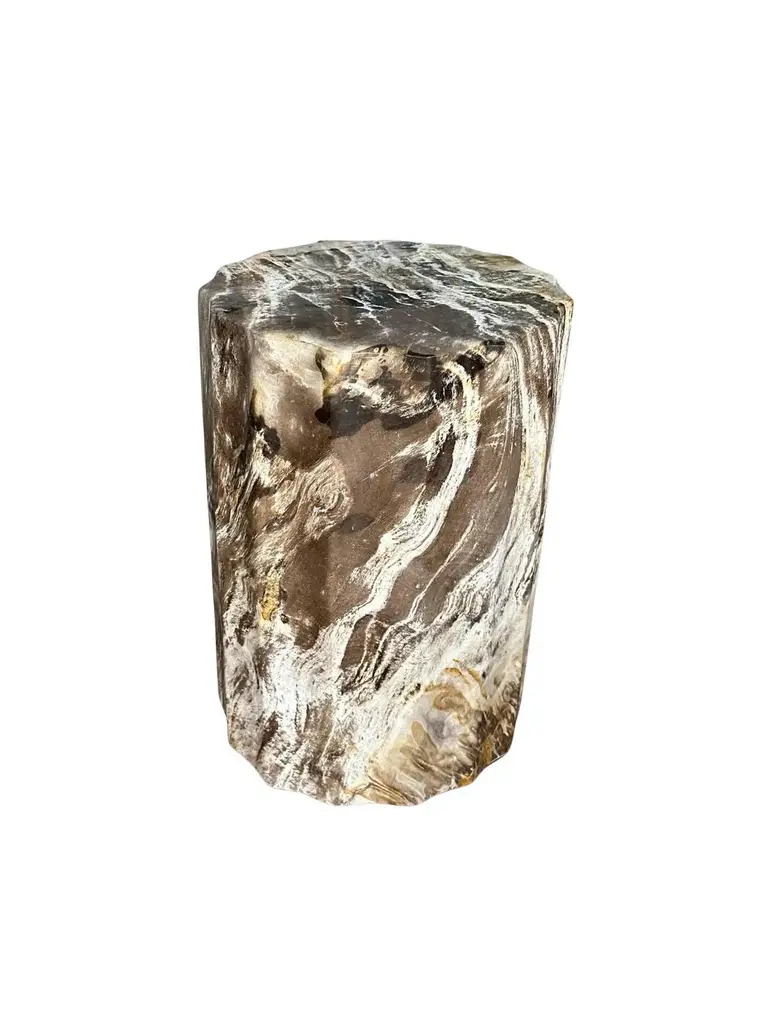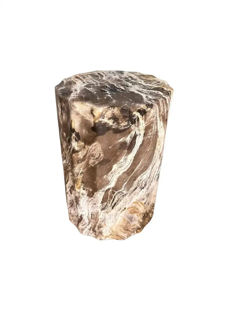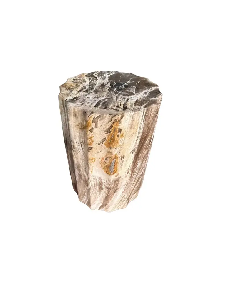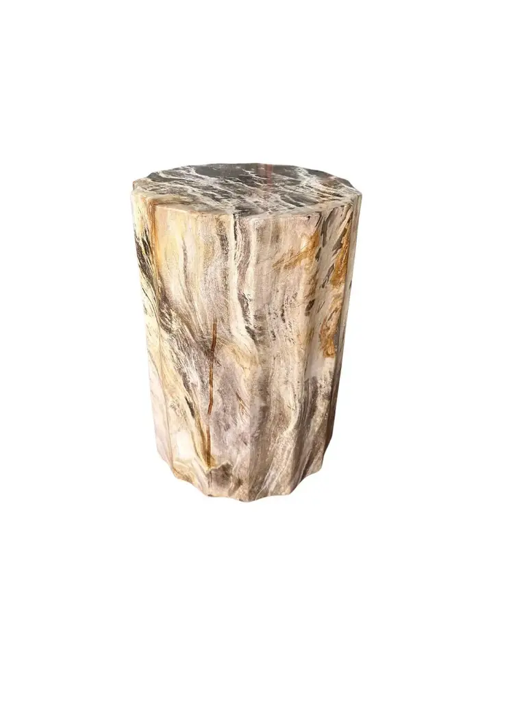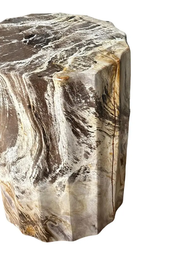 A wonderful example of a petrified wood side table featuring stunning textures throughout. This item was sourced on the island of java, Indonesia after being buried for many hundreds of millions of years. It was then meticulously polished into a modern form serving as a side table or pedestal to bring warmth to any space. Unique to this piece is the carved ribbed detailing the runs downs its sides adding a modern touch to the item.
