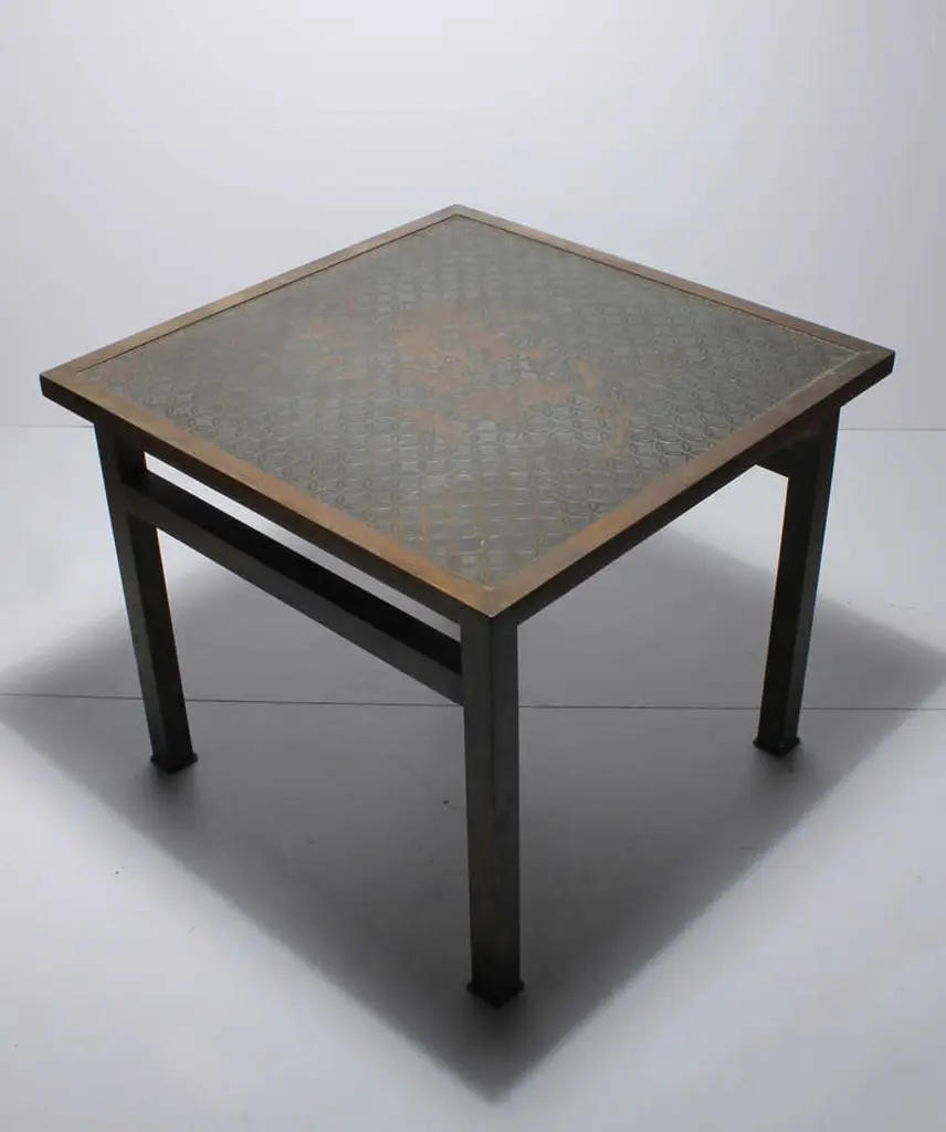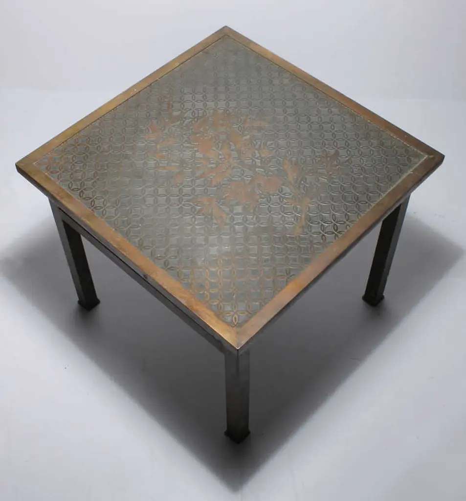 Philip & Kelvin LaVerne side tables with abstract pattern, signed.