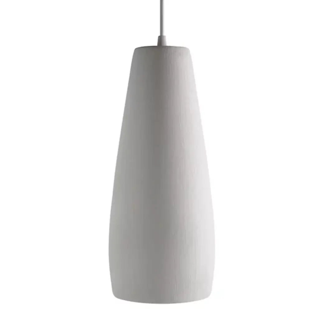 The Phobos Mini Pendant from Geo Contemporary showcases an elongated, vase-like form that exudes grace and simplicity. Its smooth, ceramic body narrows slightly at the top before widening into a gentle curve that flows down to a broader base. The pendant's surface displays a fine, vertical texture, adding depth and character to its monochrome appearance. Suspended by a single, slender cable, the narrow top of the shade suggests focused downlighting, perfect for creating intimate lighting over bar areas, side tables, or in clusters above larger spaces.