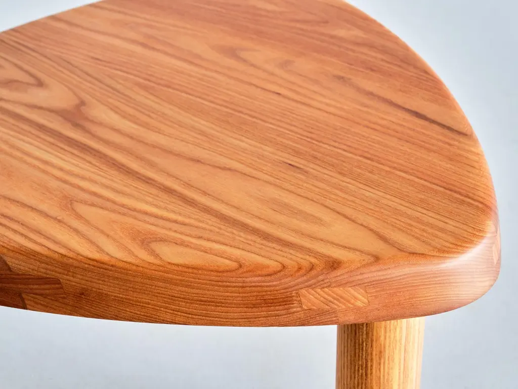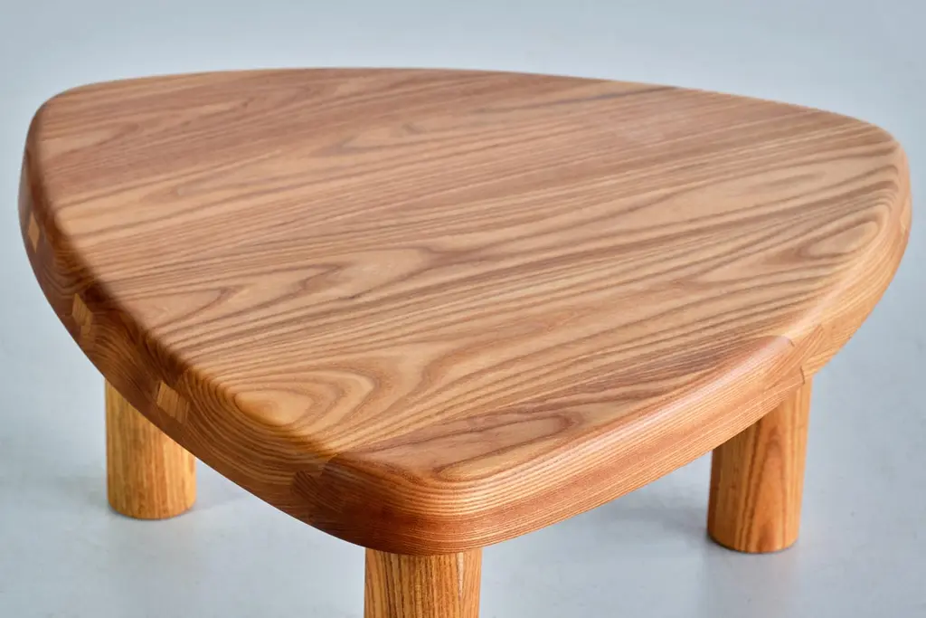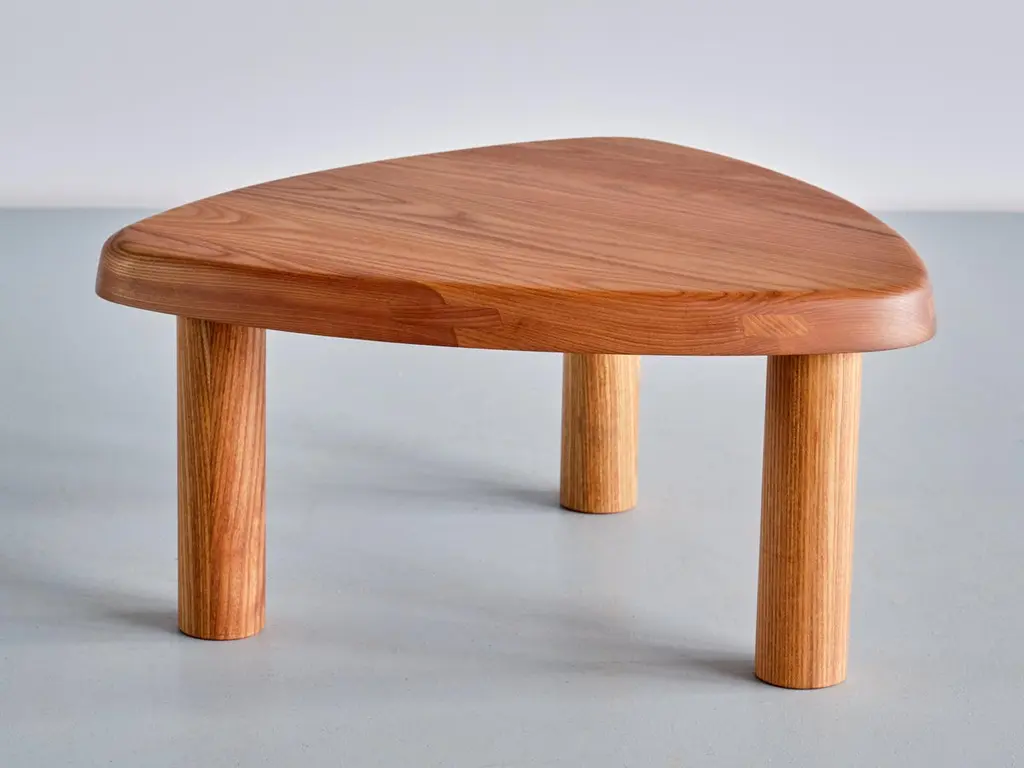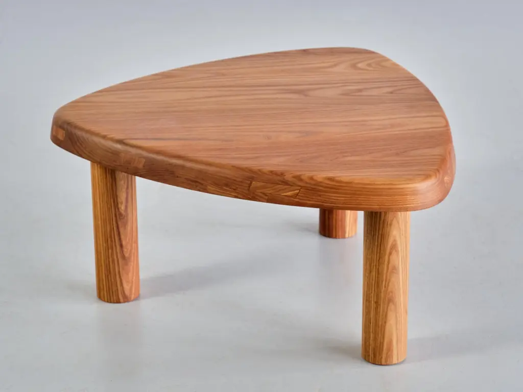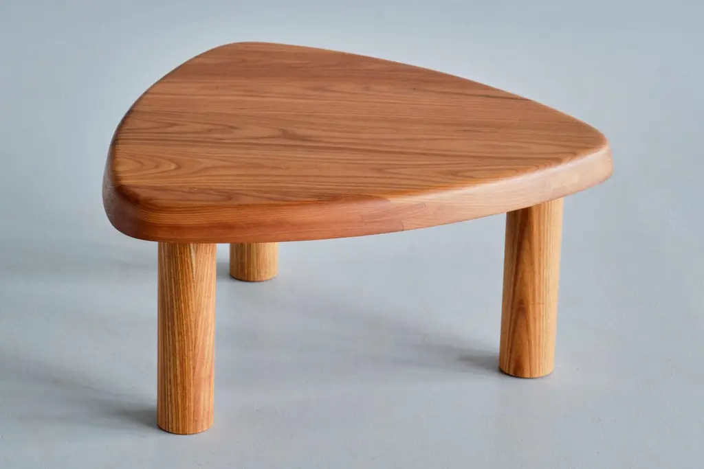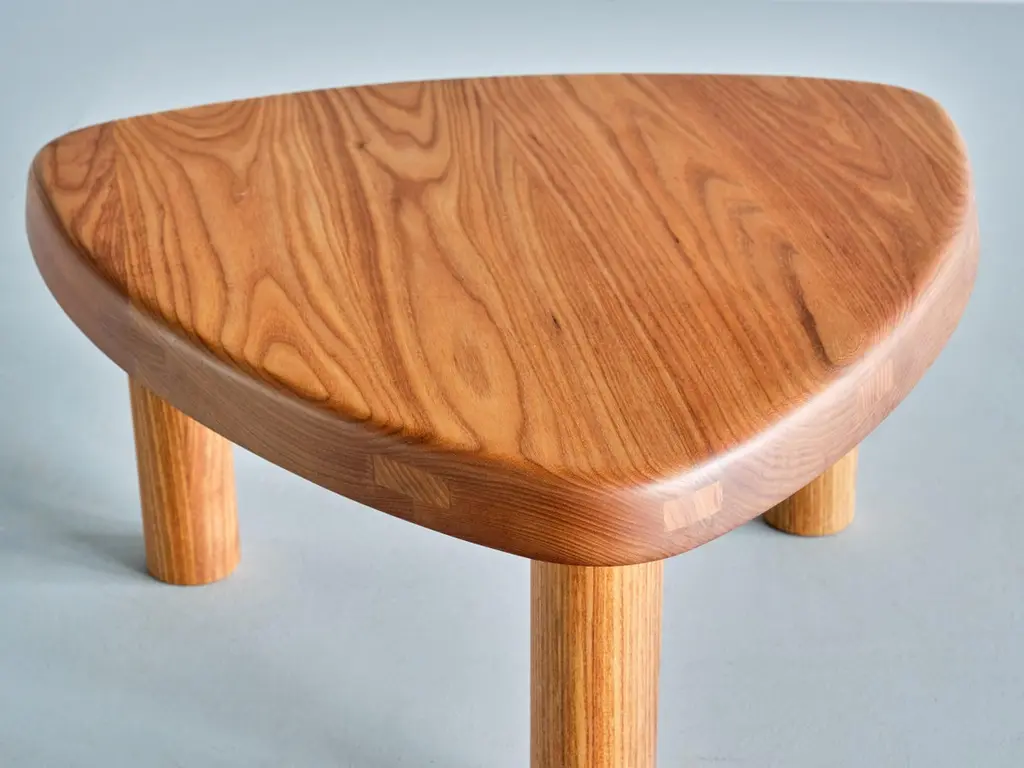 This striking low side table is the model T23 designed by Pierre Chapo in 1960. The table is made of solid elm wood with a beautiful grain. The iconic design is composed of a triangular shaped, thick table top with rounded corners and the three sturdy, cylinder shaped legs.We have multiple pieces in stock and available for immediate shipment. Each table is completely unique, so please note that the wood grain of the top and legs will vary from piece to piece. Please contact us for photos of the exact tables currently available if you'd like to select a specific piece.This new table was made by Chapo Creation, now run by Pierre Chapo's grandson. Based in Southern France, this artisanal company produces the official reissues of Chapo's designs. All pieces are hand made, using the same materials and techniques as the earlier productions (types of elm wood as the earlier productions). Each piece is stamped.