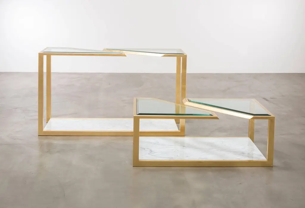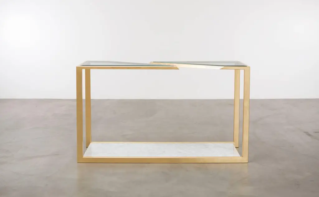 PIERRE CONSOLE TABLE - Modern Gold Leaf over Iron with Beveled GlassIntroducing the Pierre console table - a stunning modern piece that adds a touch of elegance and luxury to any space. Crafted with the utmost care and attention to detail, this console table is made of gold leaf over iron, creating a beautiful fractured effect that catches the eye. The tabletop features a gorgeous Carrara marble finish, with beveled edge glass adding a sleek and contemporary touch.But that's not all - the Pierre console table is fully customizable and made to order in California, ensuring that it perfectly fits your individual style and requirements. With its premium materials and expert craftsmanship, this console table is built to last and impress for years to come. Ideal for use in entryways, living rooms, or dining rooms, the Pierre console table is a versatile and stylish addition to any home. Order now and experience the luxury and sophistication of the Pierre console table.