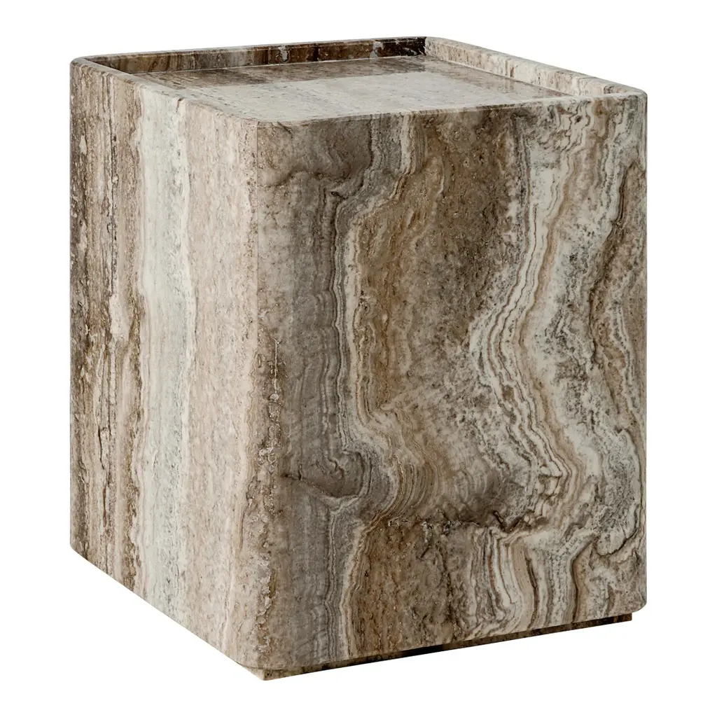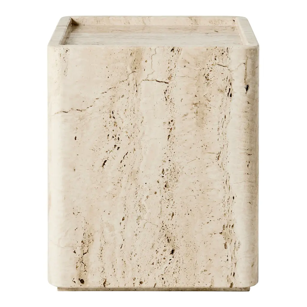 Continuing GamFratesiâ€s material exploration of travertine that began with the Epic and Doric Tables, the Pietra Side Tables celebrate the mesmerizing patterns found in the surface of the stone. Available in two sizes and two colors, the tables are deceptively lightweight, each constructed by hand from six pieces but resembling solid blocks. A raised lip around the gently curving edge of the tabletop creates a useful tray-like surface, ideal for displaying objects or placing a glass securely. Carefully cut, fitted, and finished, the curved edges and corners exemplify the extraordinary level of craftsmanship behind the table, and imbue the stone with a sense of softness. Â