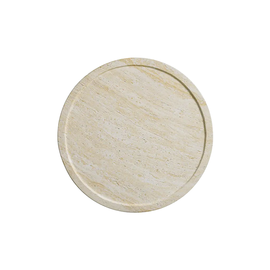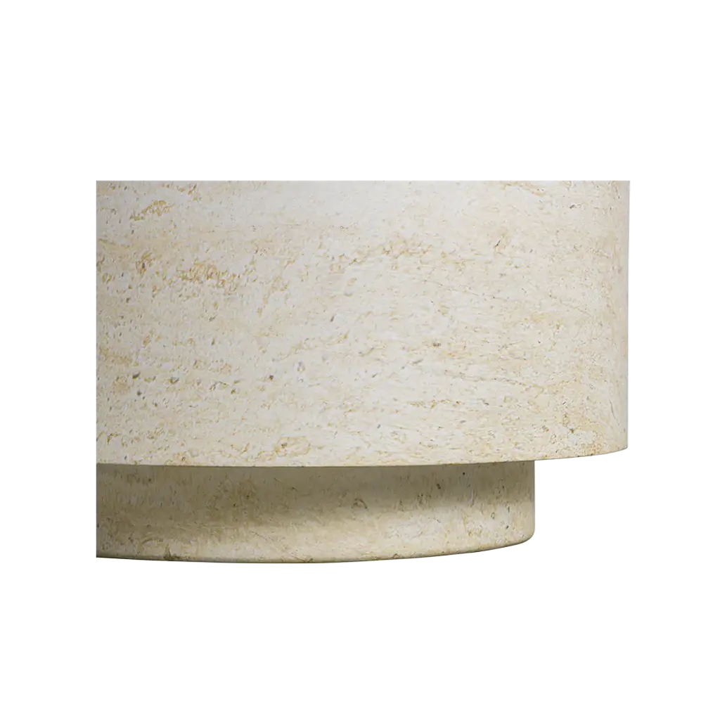 The Pietra Side Table in Travertine showcases a minimalist design, crafted from concrete with a travertine color finish. Measuring 18 inches in diameter and 19 inches high, this sturdy yet elegant piece offers a compact surface for any room, blending natural texture with modern design.