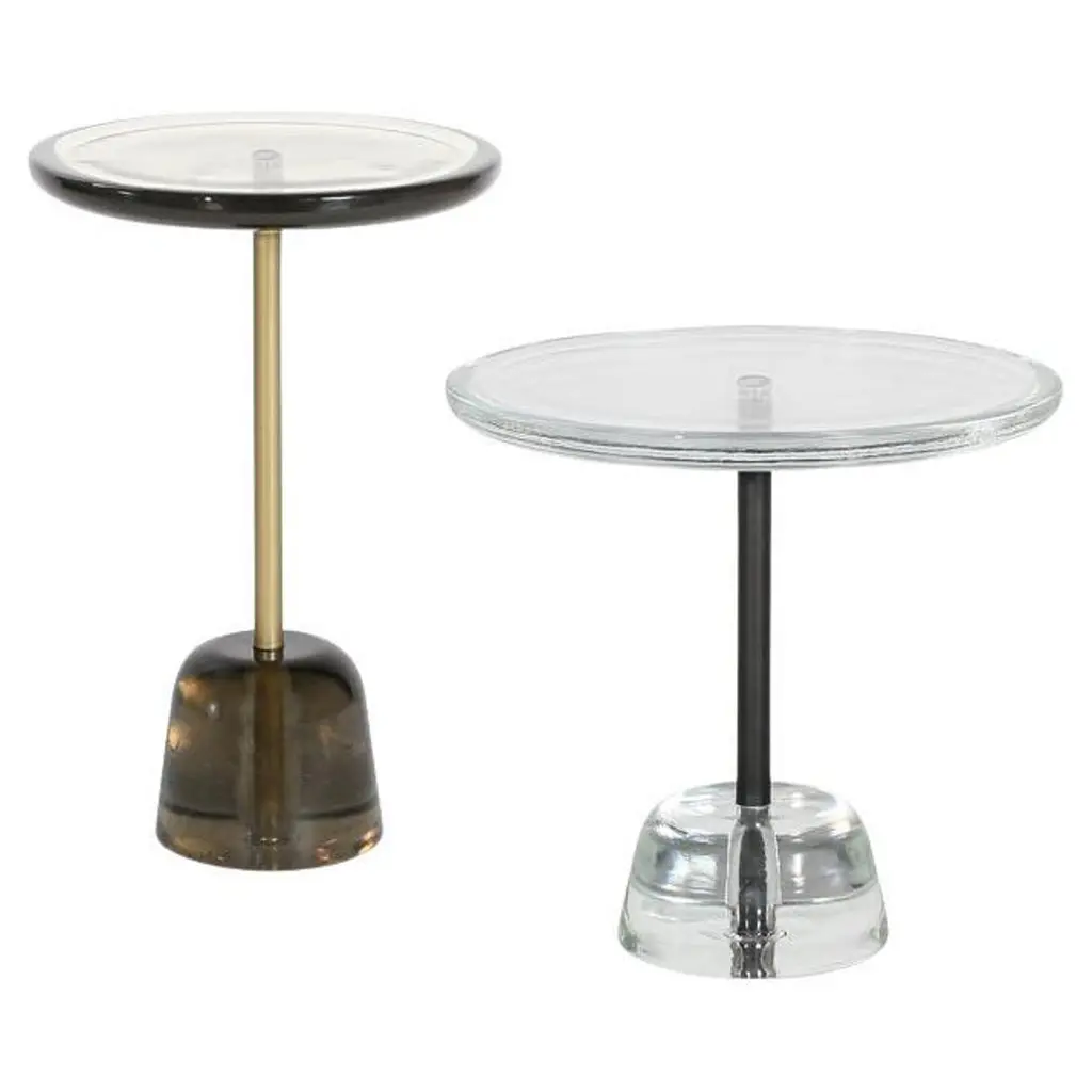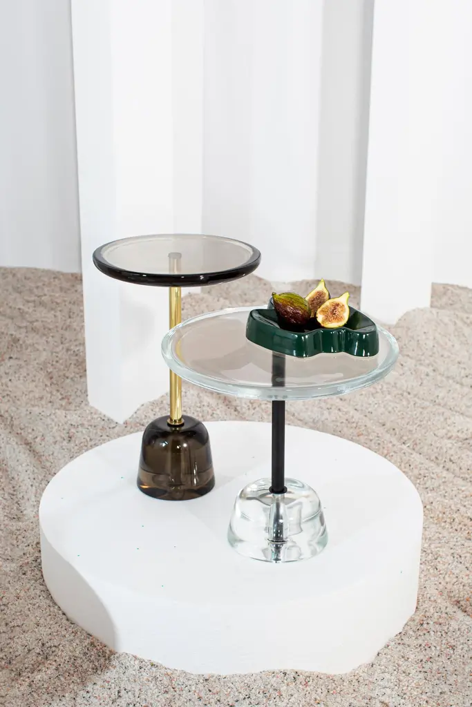 Pina low light grey brass side table by PulpoDimensions: D 44 x H 42 cmMaterials: Glass; brass and steel.Also available in different colours.Sebastian Herkner’s distinctively tall, skinny side table series pina is inspired by the abstract turns and twists of the famous Pina Bausch dance theatre. The basic figurine with base, rod and top shines in different combinations of aqua blue, transparent, green and light grey. Each piece is created fromtransparent or coloured cast glass. Bubbles, streaks and other variations in Size and colour are part of the production process, and not defects of the design or production.Pulpo is a design editor for high-end products in the home sector.Design is our passion. Art is our engine. We are fascinated by the Craft of the ceramic and glassblowing workshops and are guided by the rough aesthetics of these unique pieces.Pulpo’s philosophy goes back to the IDEA of the “carte blanche”. Our designers and artists develop their designs freely and experimentally. A variety of materials and a weakness for structures are our strengths.The headquarters of pulpo is in Weil am Rhein, near the Swiss border. Consisting of the creative and sales department, warehouse and logistics, this is the think tank for our artists and designers. pulpo’s dealer network extends far beyond Weil am Rhein – from Iceland and Dubai to Australia.Pulpo is movement – is possibility – is passion.In 2006, pulpo was founded by Ursula and Patrick L’hoste as a design brand at the interface between shape and Material. pulpo’s conception is to edit lighting, furniture and accessoires on editor’s choice. The company’s focus is to conduct up-and-coming designers and selected manufacturers, using the nature of Material’s to form the score. Materials such as ceramics, stone and especially glass, which is pulpo’s primary focus since 2013.