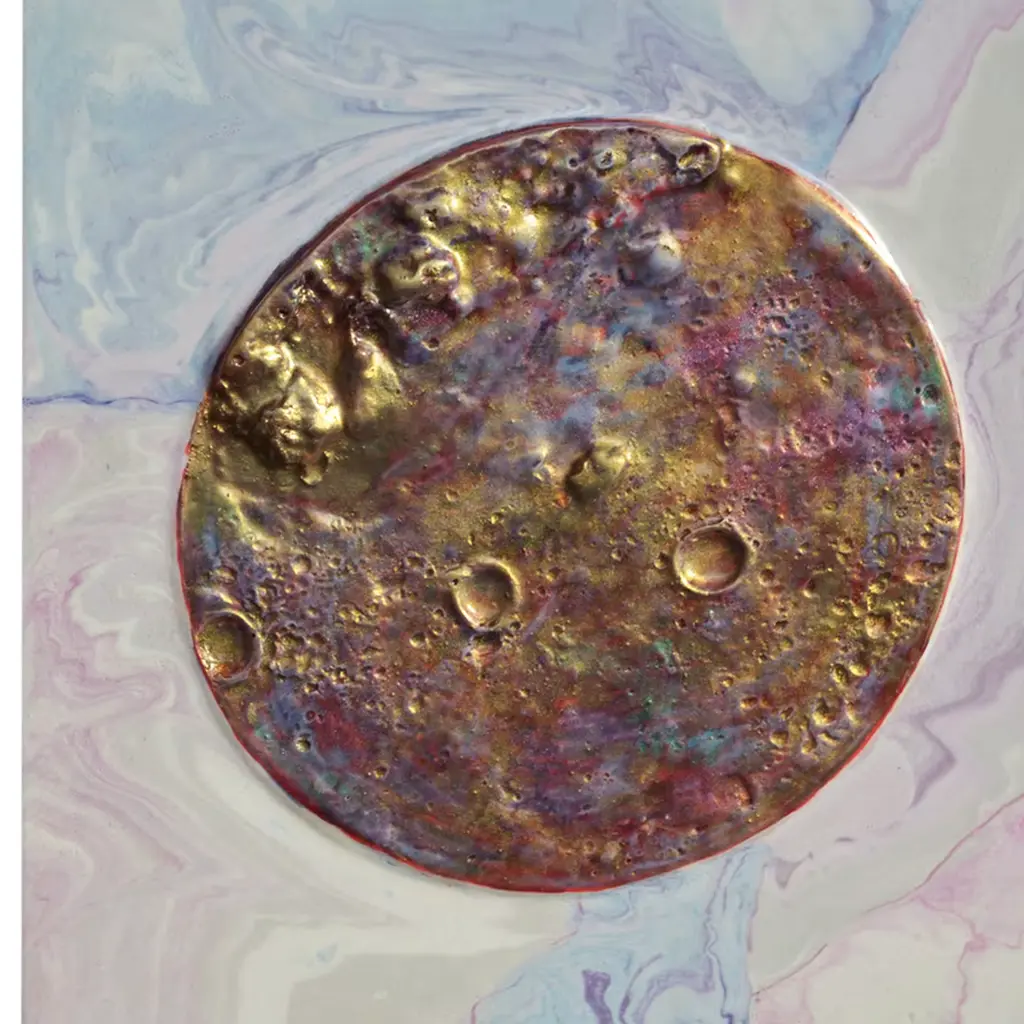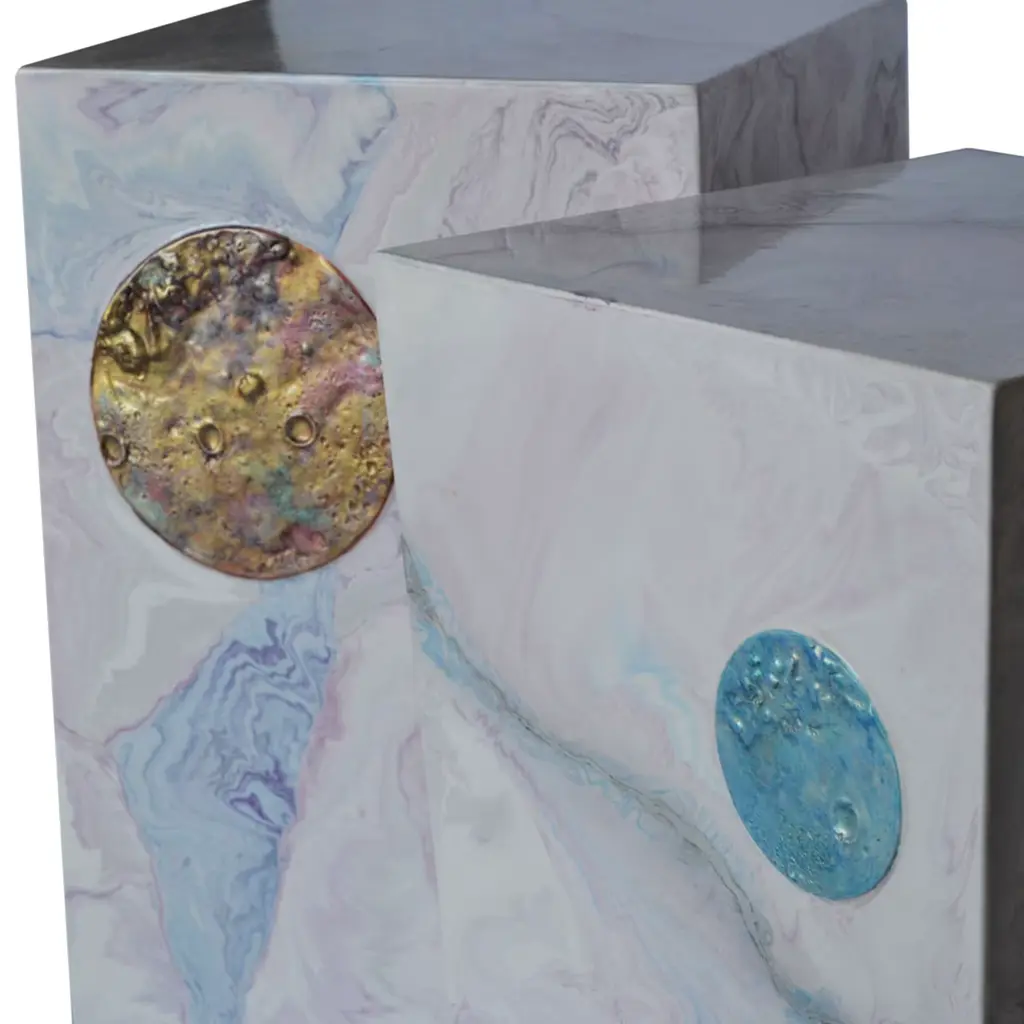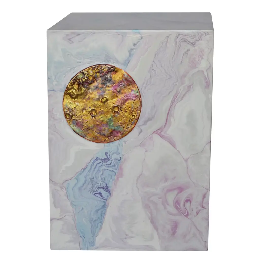 Very nice side table designed and manufactured by Cupioli Lodovico, an Italian artist of Rimini. The color becomes the great protagonist and the craftsmanship exalts and distinguishes the furniture solutions made in Italy. The artist has decided to insert a material processing in the representation of the moon with shades of metallic colors all the vines and vibrations of tones are made by hand time by time and every single piece will be different and unique and no more repeatable.